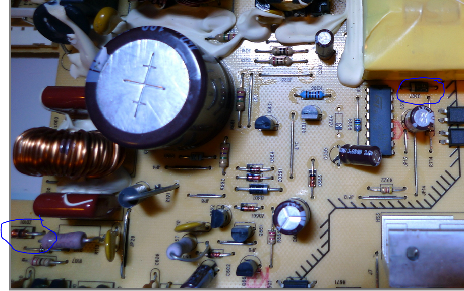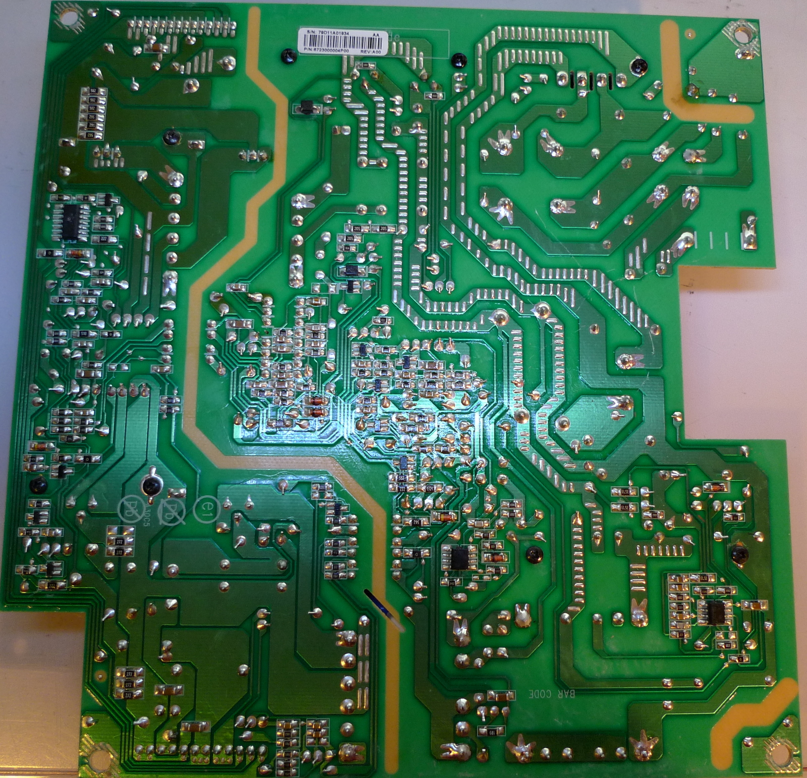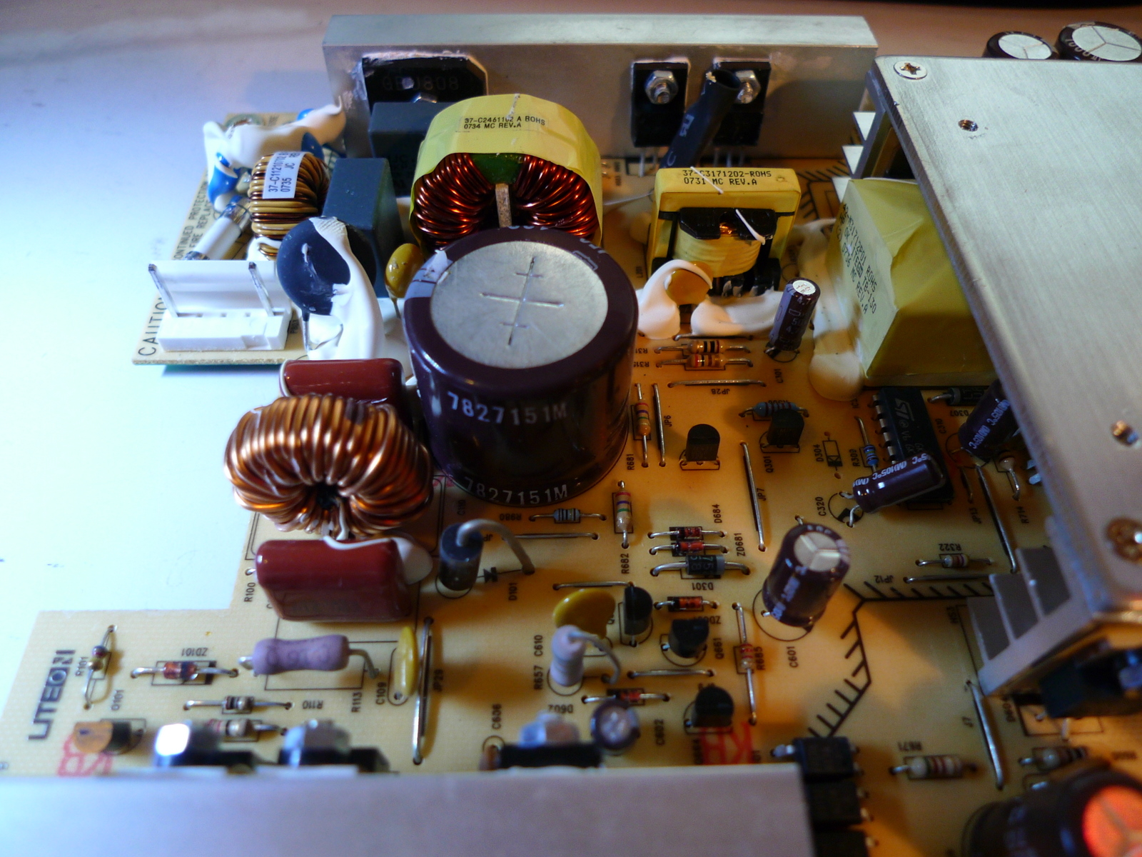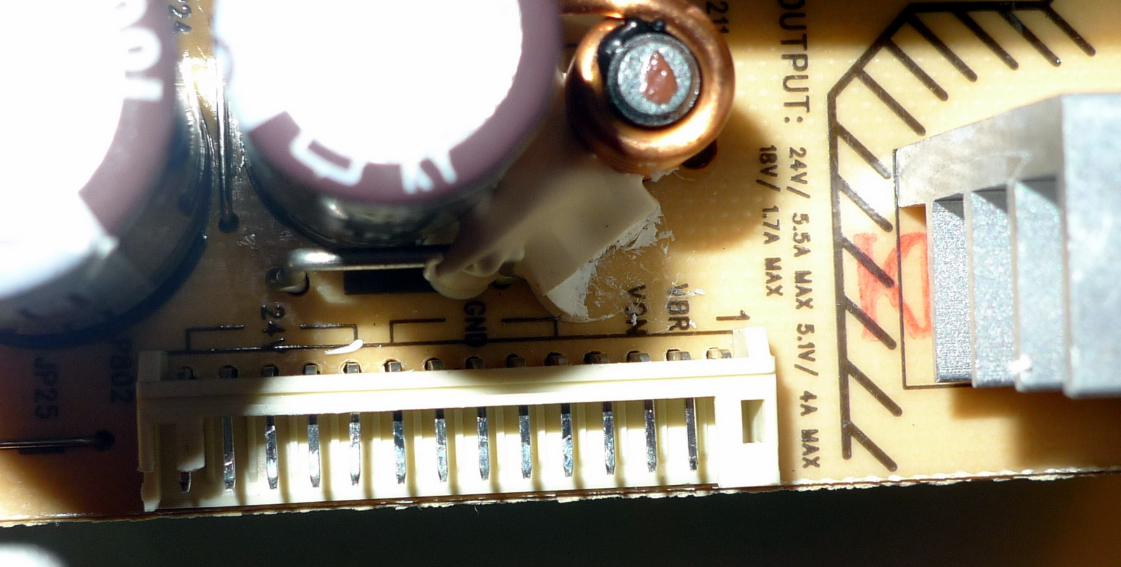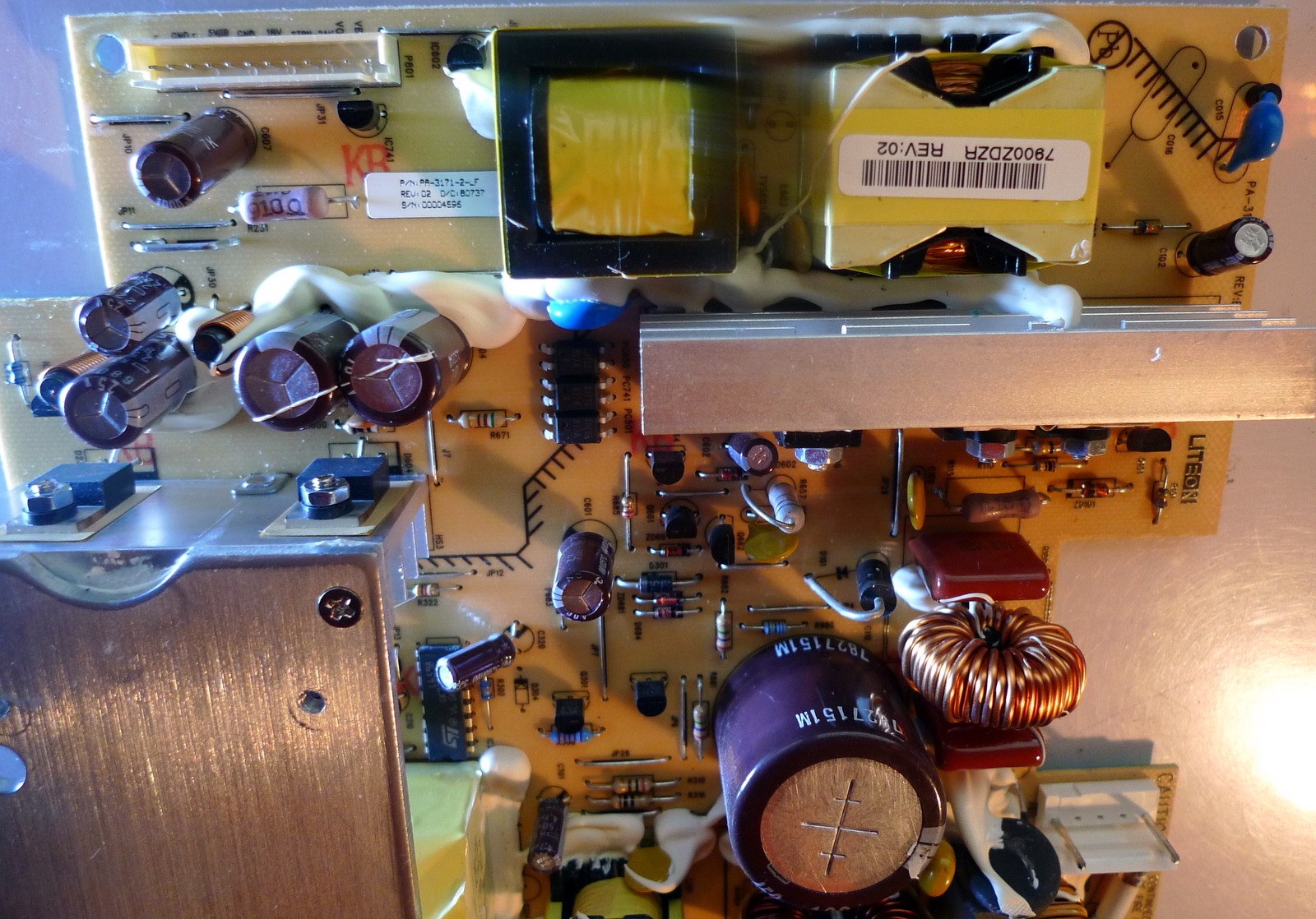 I have tried all 3 DVI inputs and I get no picture, the LED is lighted orange. The computer can sense it's presents and identify the screen. The USB-hub is working. I have googled but with poor results, seem like this is a rather good LCD monitor :-). I have measured the connector of the inverterboard, but it has almost no power, 3-4V somewhere, but no 24V. So I suspect the PSU has failed... for now. I don't see any physical damage or bulged caps. The PSU is a LITEON PA-3171-2-LF rev B. The biggest cap (180uF 450 V) gets very warm and so does the whole heat sink (HS4) with the two transistors and rectifier bridge at the bottom of P1050119.JPG.