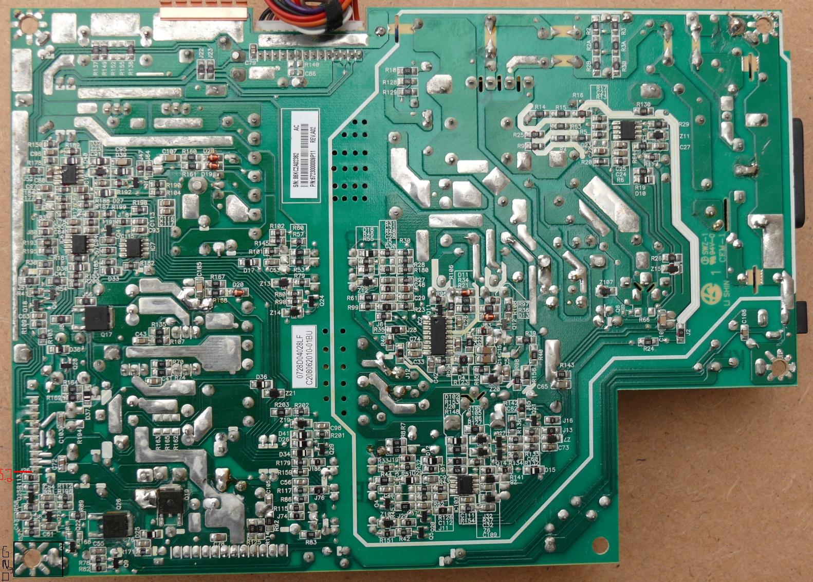 3. You can always use a surge protector. And 4. "If it ain't broke, don't fix it" my Grandpa used to say. After your friend replaces that capacitor. With the PSU all by itself, and not connected to the main board or the inverter. You'll need to turn over the PSU. Plug it in. And you'll only get one voltage output. The 5 volt standby. I marked the ground and the positive connector pin in the lower left of the picture. That should be 5 volts or above. And steady. No fluctuations. Mine showed 5.2 volts and steady.