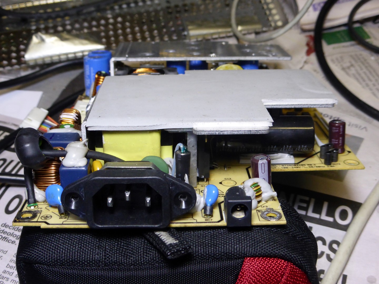 Since there's no schematic, I looked at the photos posted earlier. (If you can post photos of your own boards, top and bottom, with heatsink tops of PSU removed so we can see where things go...)