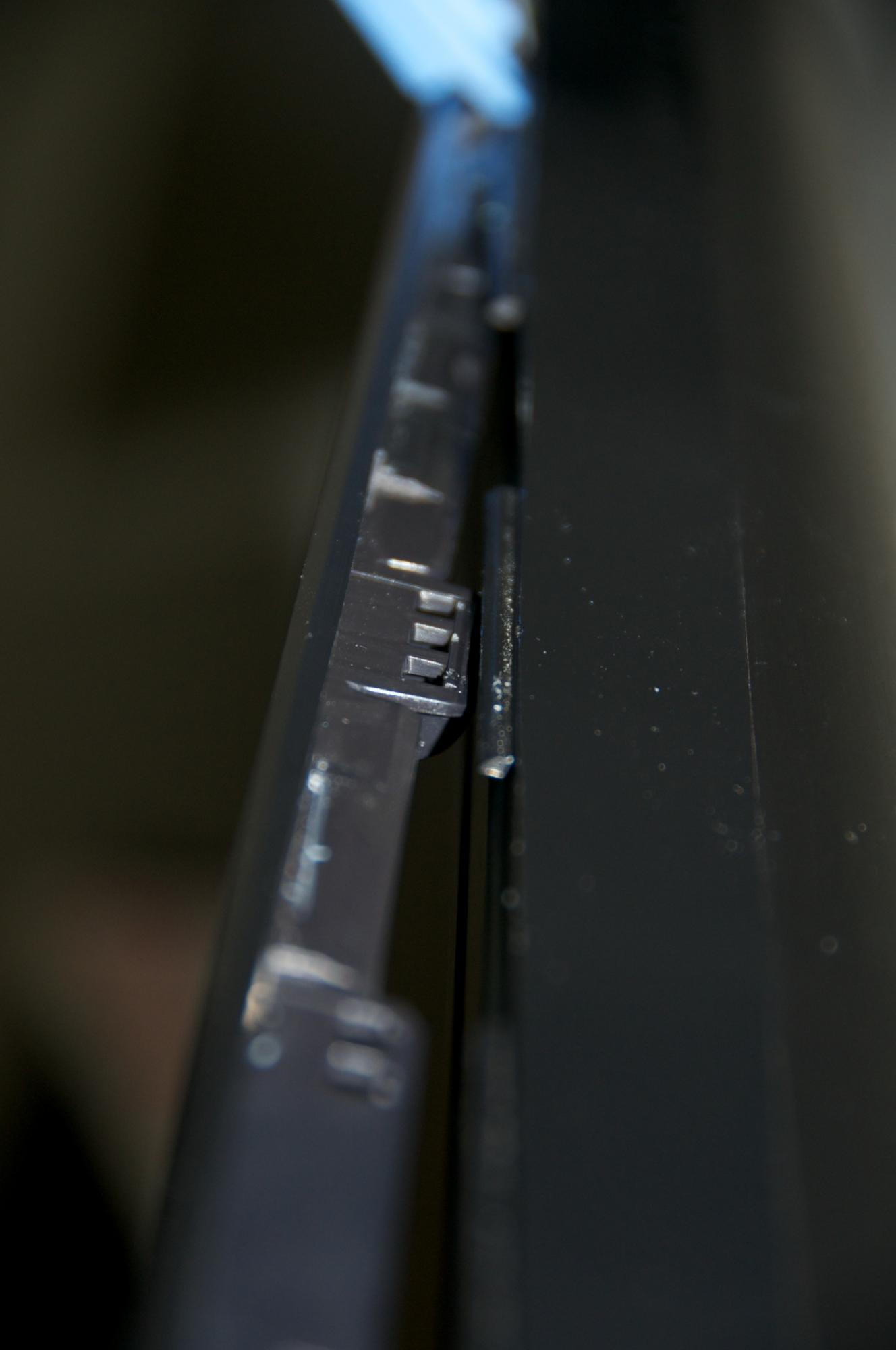 3. Using a plastic tire lever tool (ones for removing bicycle tires) wedge it into the gap made by the credit card and lever the tool so the black plastic center divider rises. Push down on the bezel and hopefully you have unlatched the clip. If you are seeing metal clips then you are removing the wrong clips. The clips are plastic and clip into the center black plastic divider (dividing back panel and the front bezel). Several tire levers help. Be careful around the bezel buttons as there is no slack for the ribbon cable.