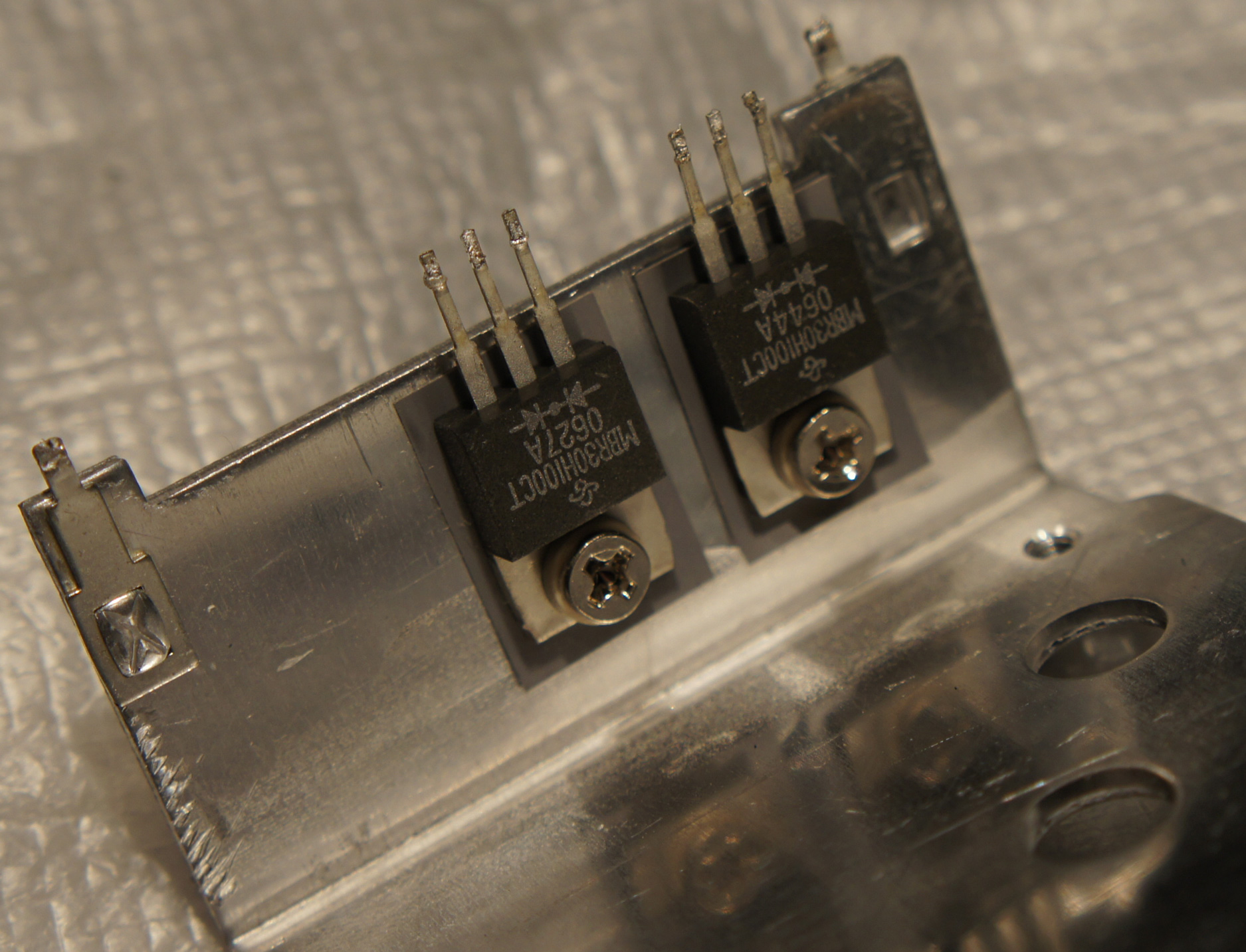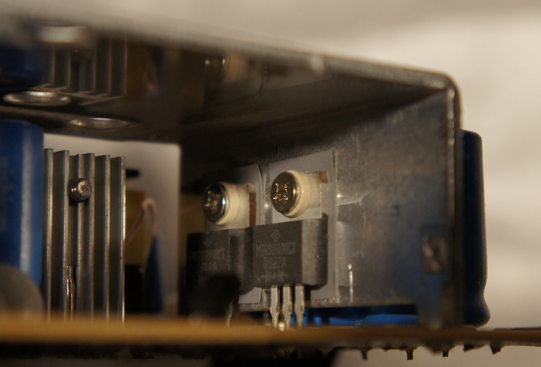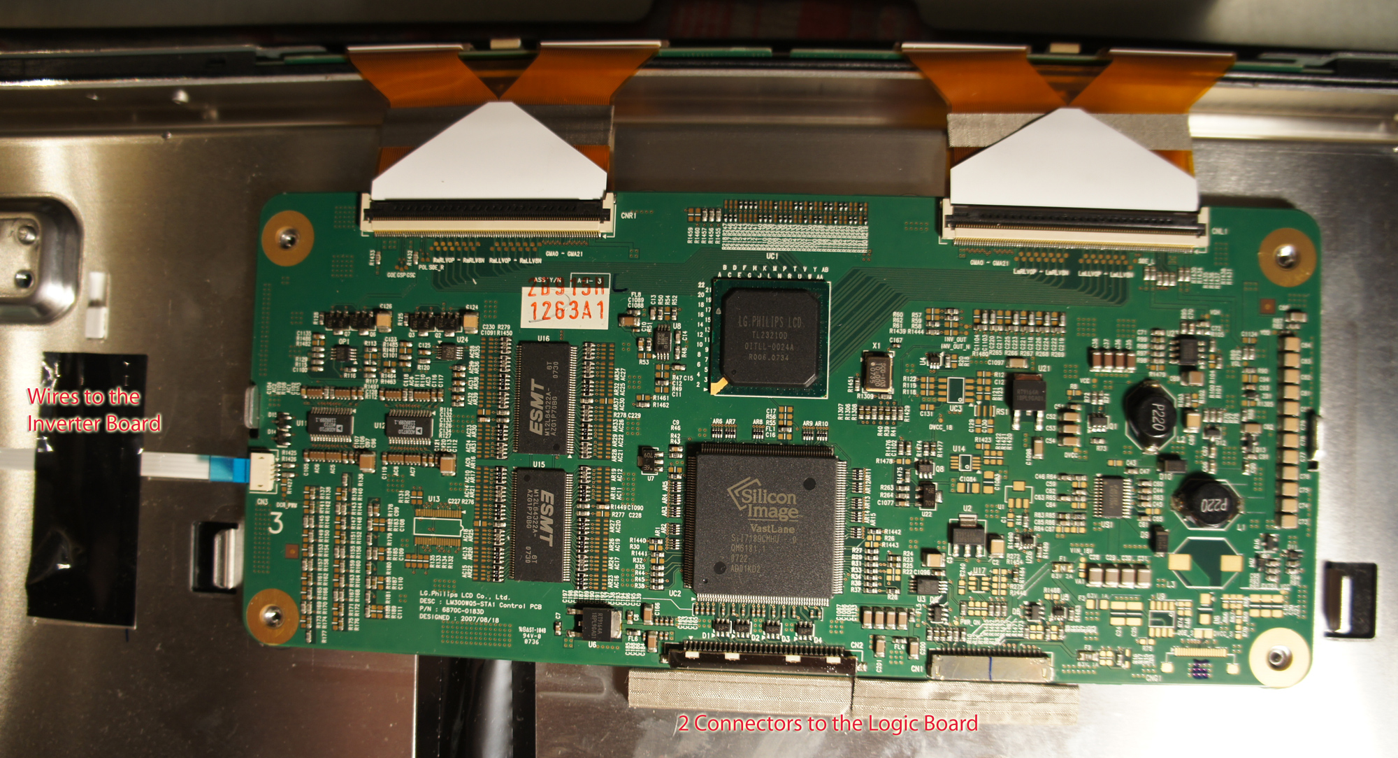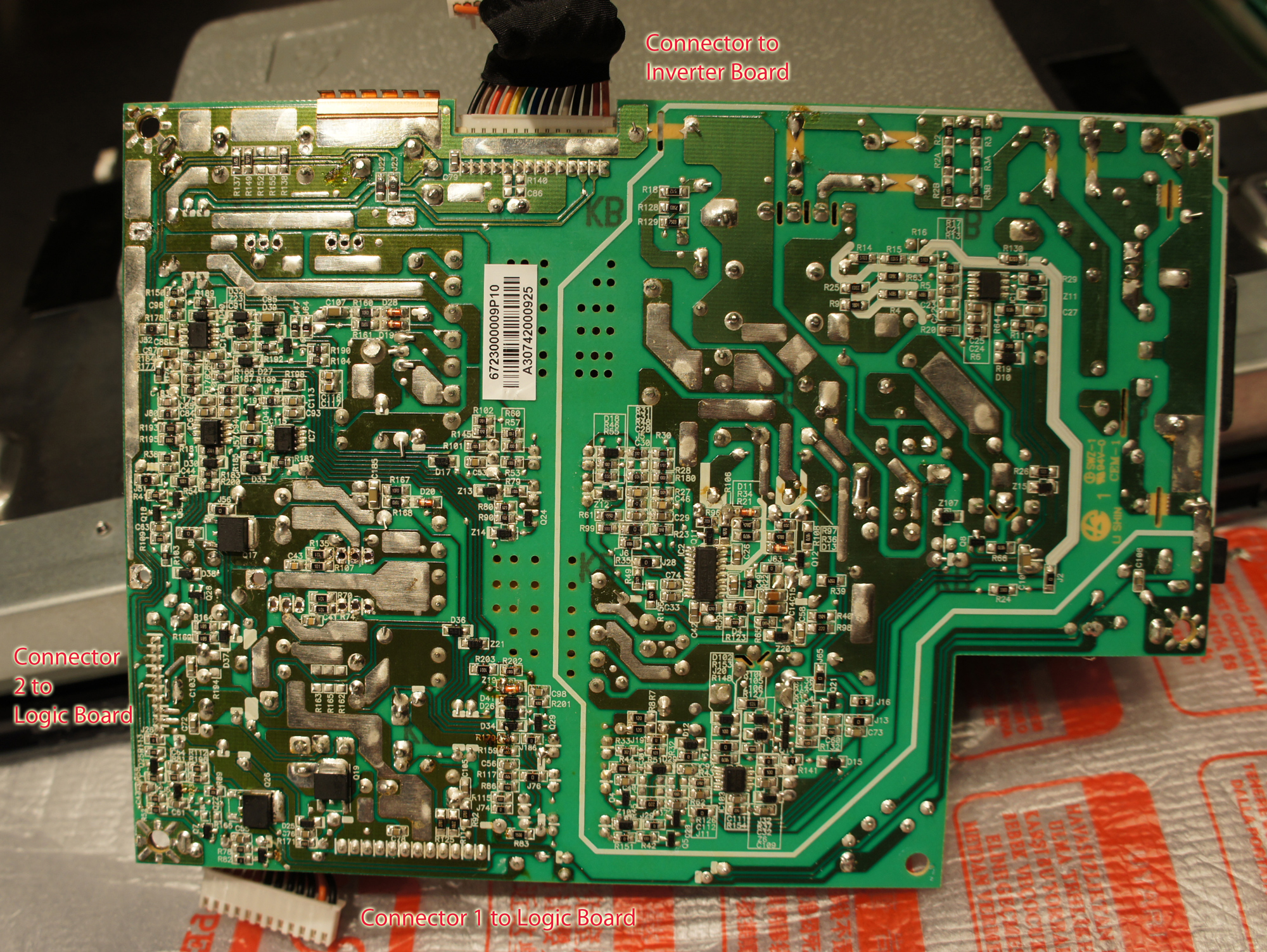 18. Remove tape and unplug these two connectors so that the main panel can now be lifted away and worked upon. The power supply board can now be removed once the 4 screws on the back of the metal panel and all screws holding the power supply PCB in place are removed.