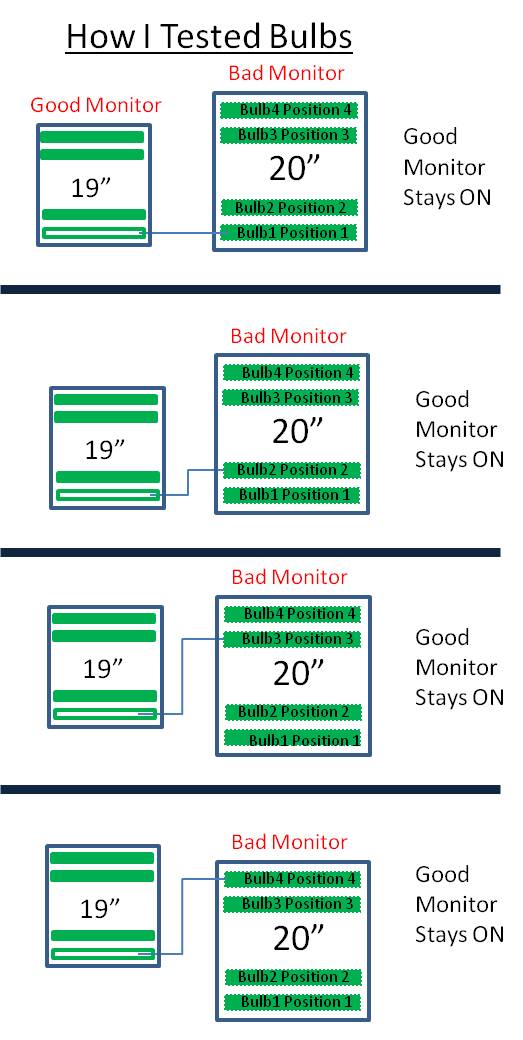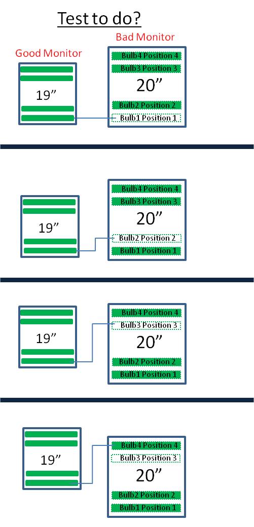 It is proposed that i switchout the bulbs one at a time from the bad monitor to a good bulb/monitor. From what i read, i included a pic of what this test is to do as well. See enclosed pic "Test to do".