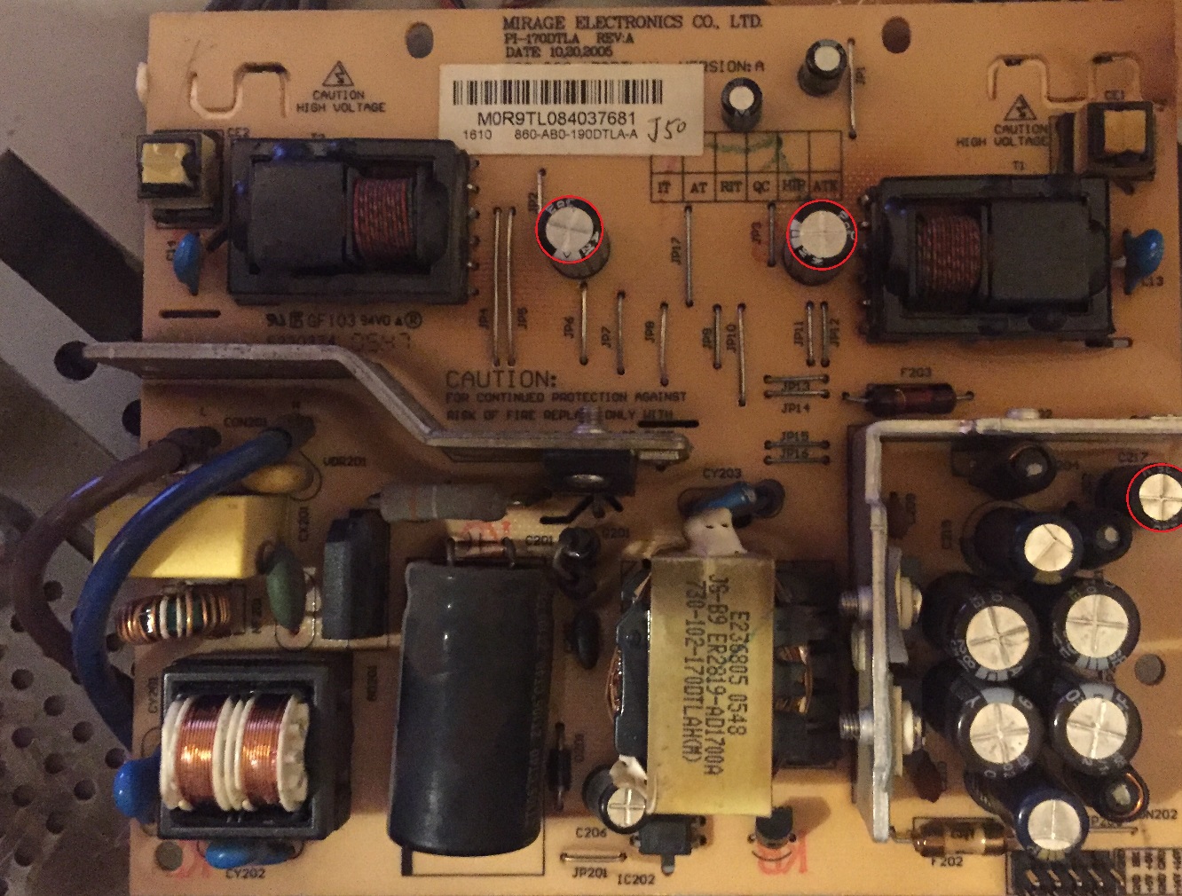 I opened up the Monitor, saw the capacitors to the left and right being blown on top, while the middle capacitor was bloated on the underside where the pins are. I replaced the blown capacitors (marked in the picture).