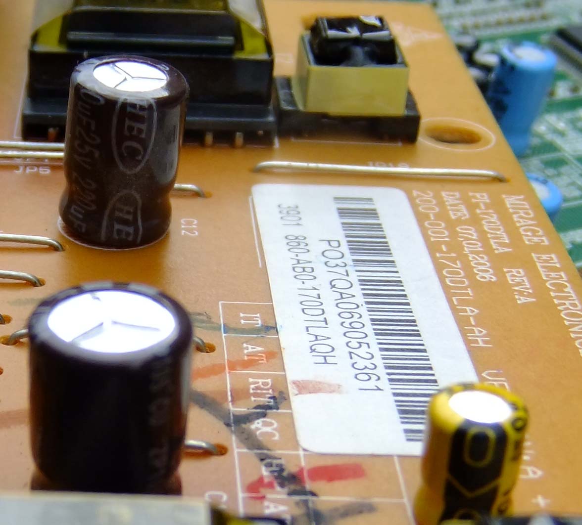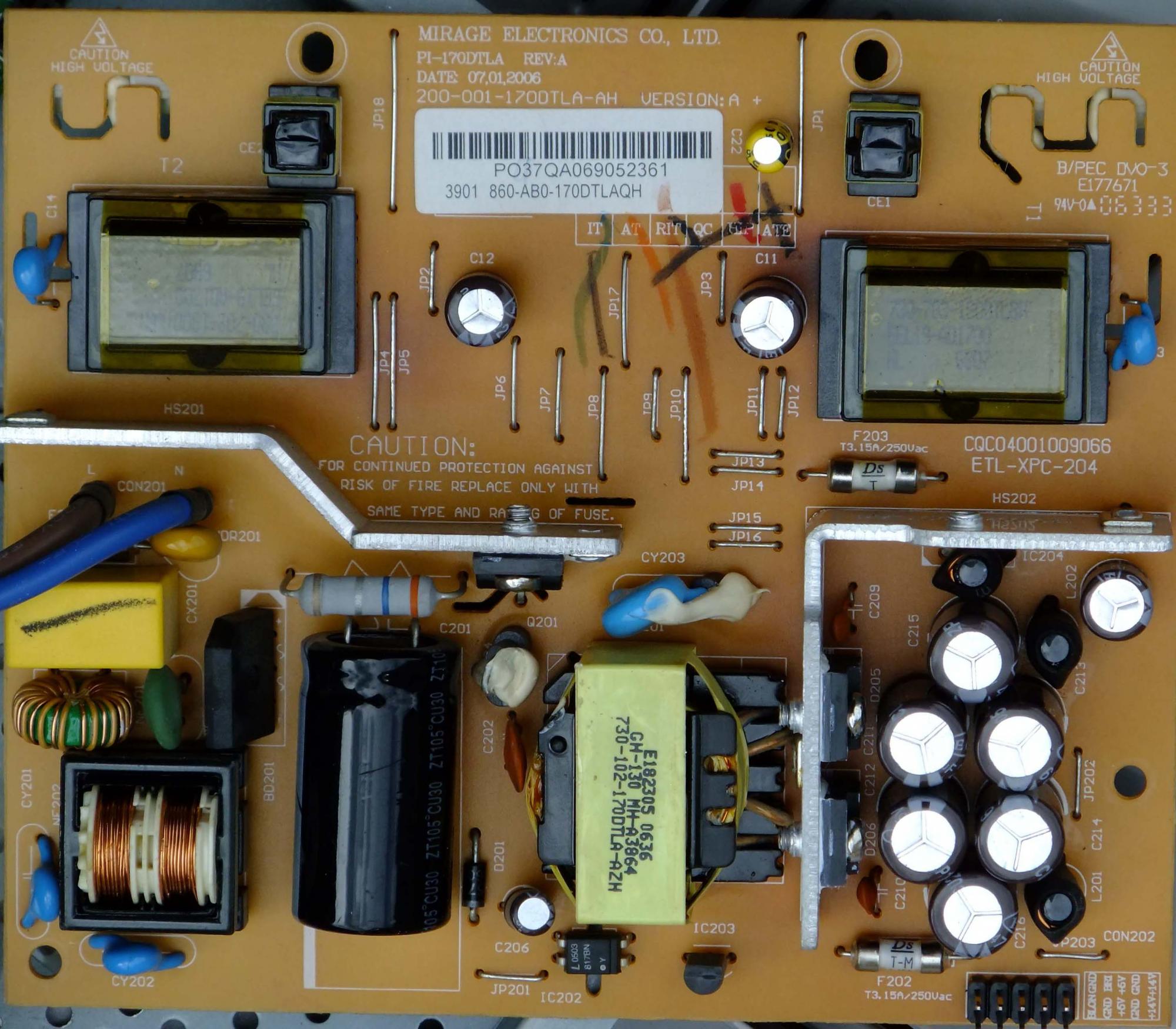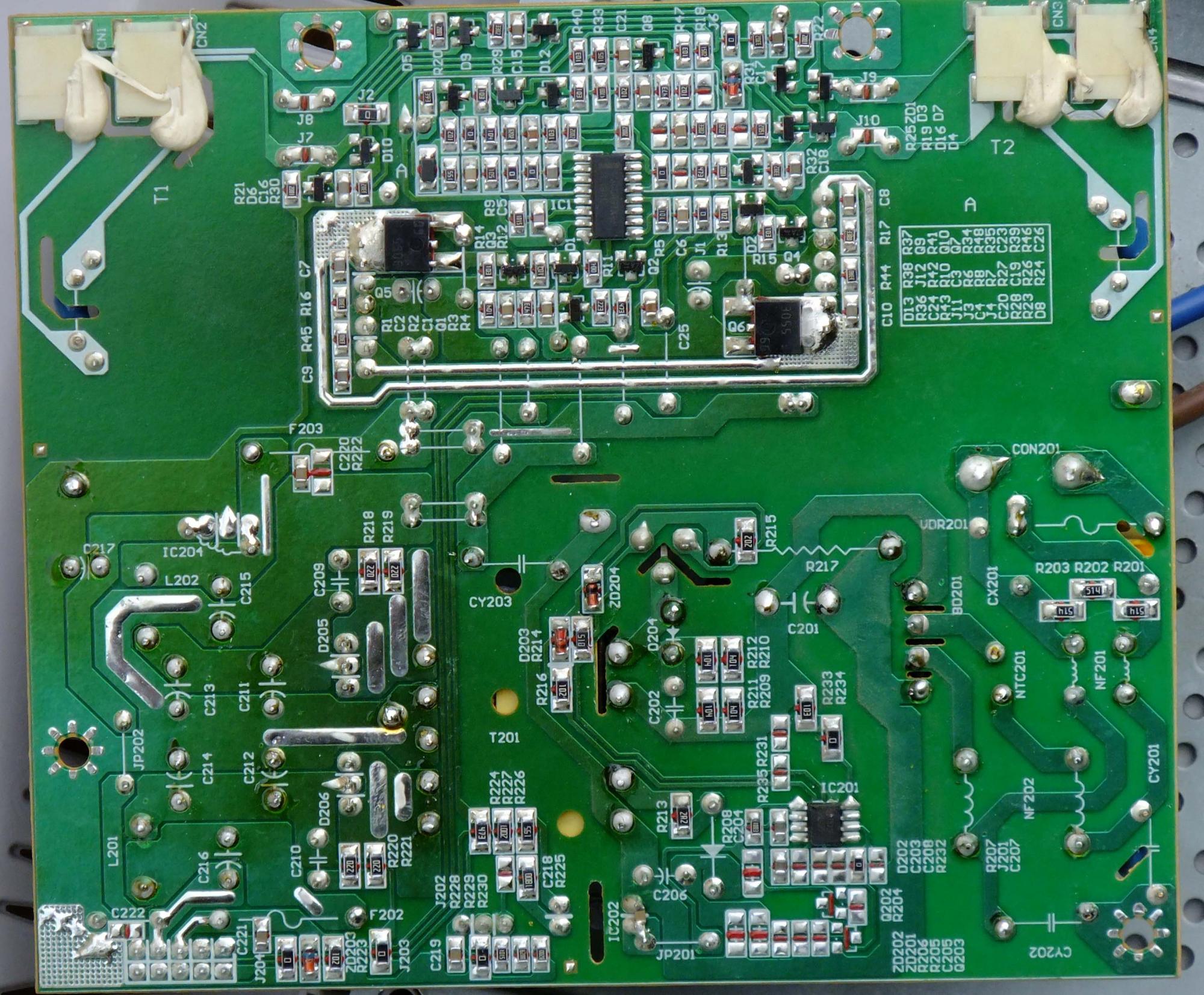 Go easy because I am not that experienced in electronics and have never looked inside one of these before... The power card looks pretty good - nothing scorched, just a little heat stain in one section. I reflowed connections for most of the old style discrete components - transformers, inductors, power resistors, fuses, capacitors, using 60/40 solder, because some looked a bit as if they might be dry. The electrolytics look perfectly normal and I think they are all marked HEC. It might be imagination, but it stays on for about 15 mins now, but same symptoms - for a few seconds the picture looses sync as though there is interference and then black. I have established after reading other posts that the blue LED stays on and under a strong light the desktop is visible, so looks like a backlight problem.