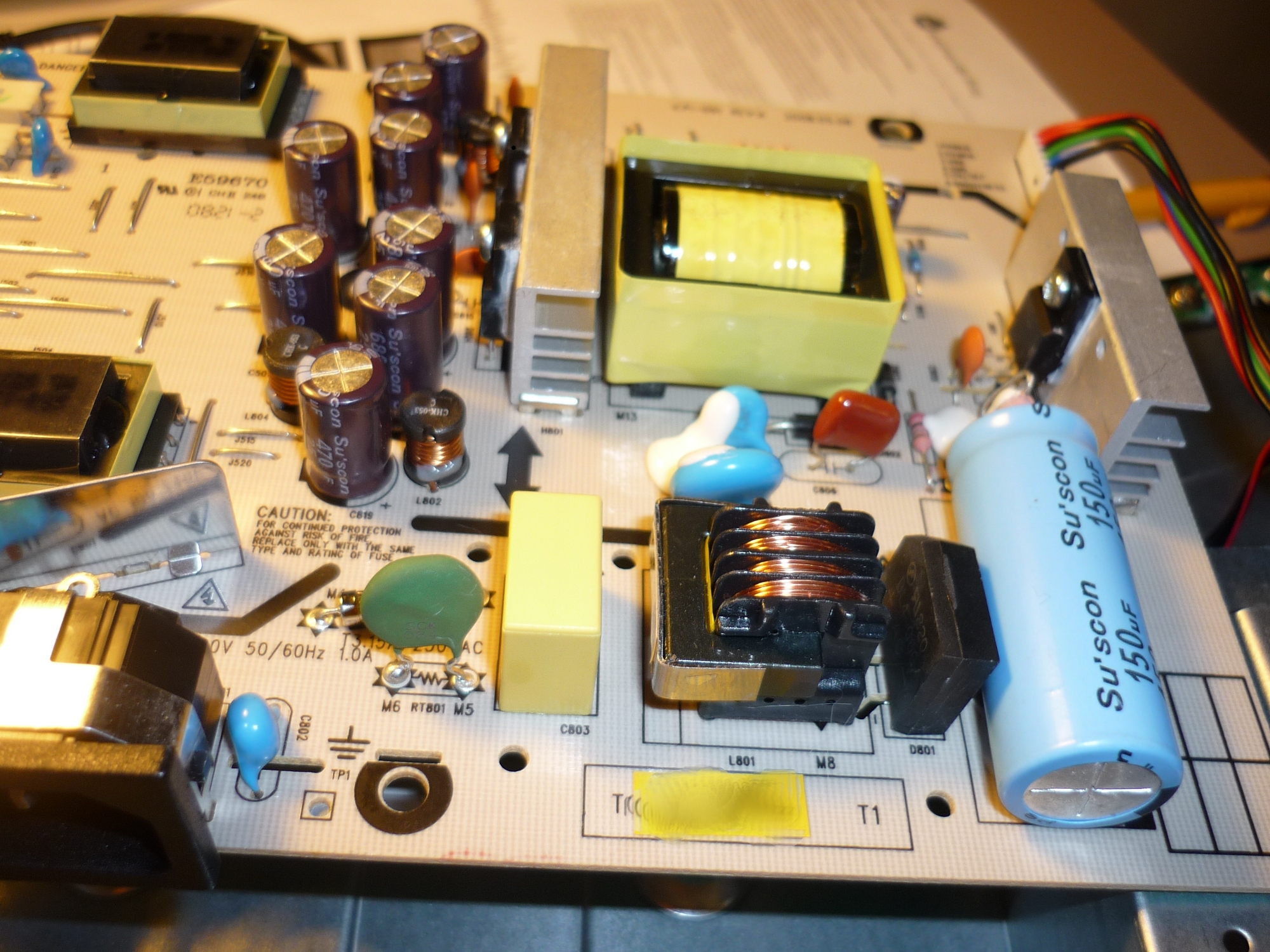 I've pulled it apart and none of the caps are bulging or leaking. The big filter cap (150uf 450V) only charges to about 160V though... I feel like this could be a problem? I've heard also that the u108 chip (25L1005) on the logic card can get corrupted. I'm not sure this is the issue since it does actually display the LG logo for a few seconds but I could be wrong.
