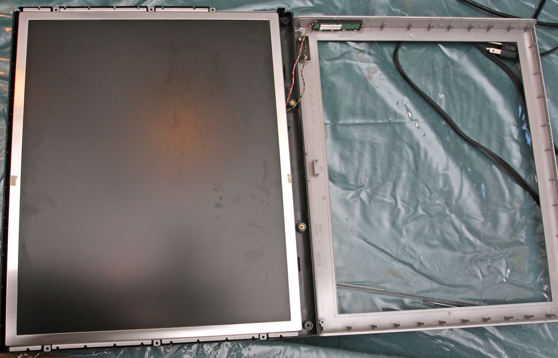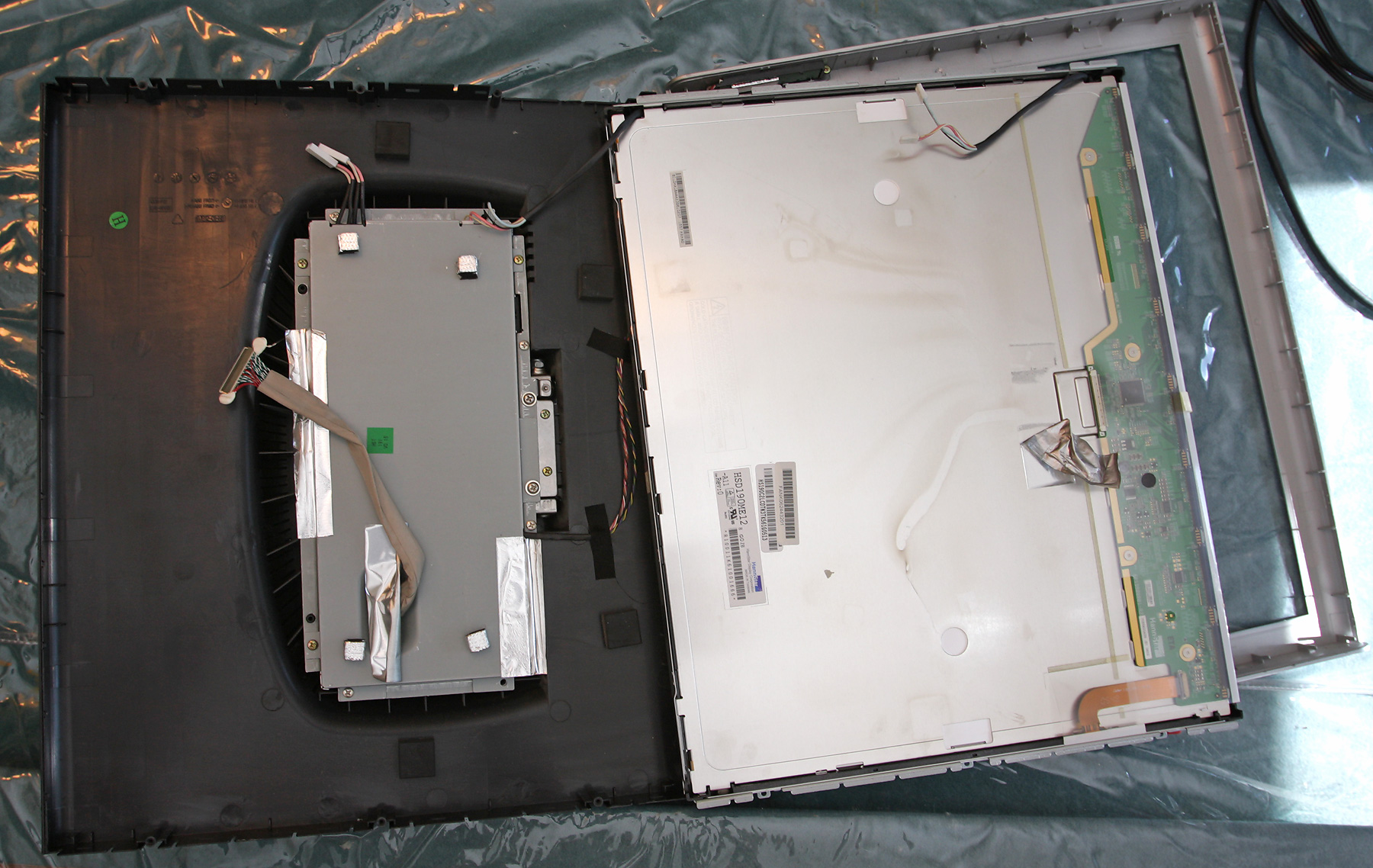 Six screws holding the panel to the back. Go to lift the panel, and the electronics "cage" is screwed to the back, and a bunch of cables run to the panel.