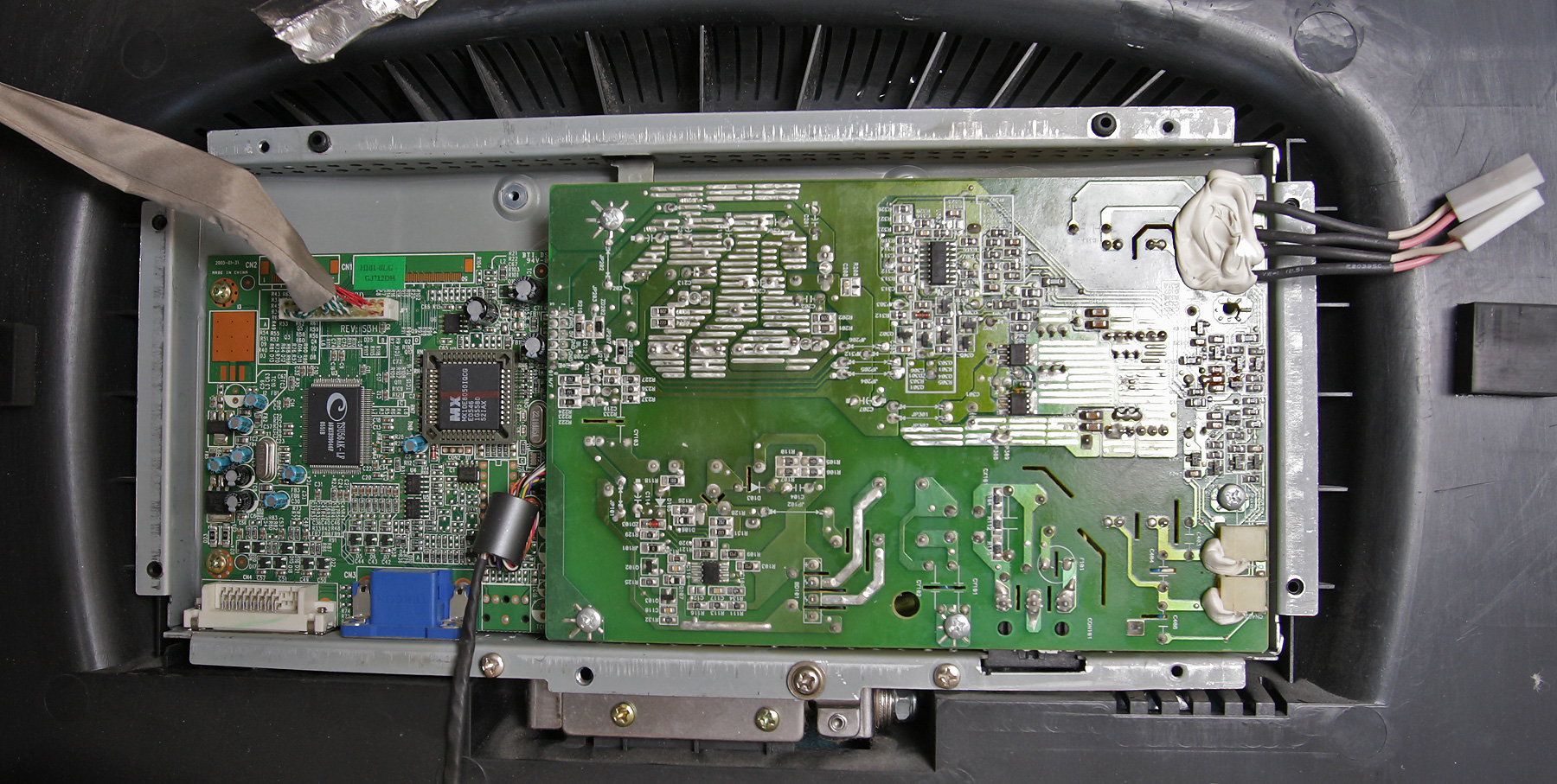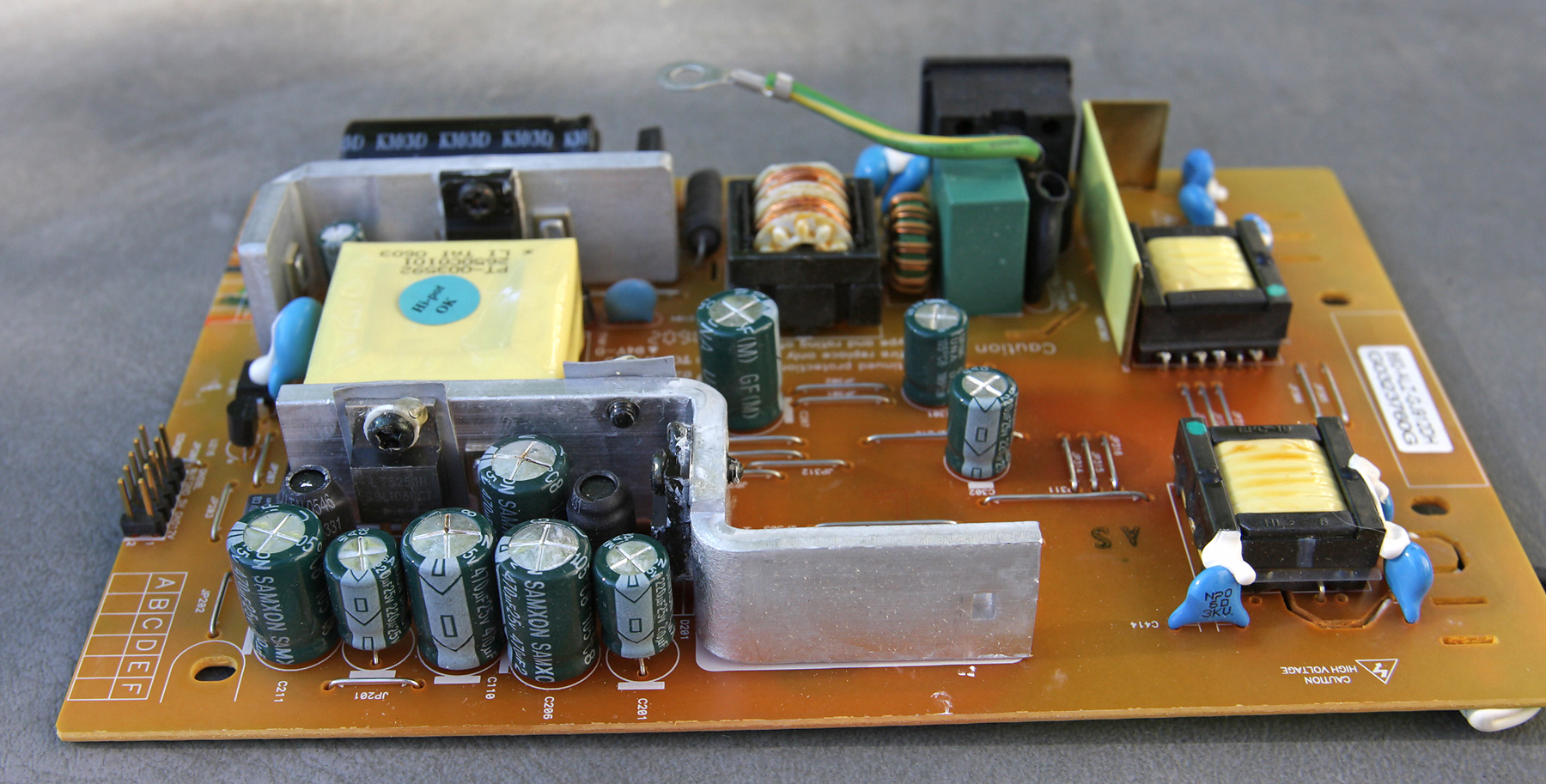 I get the panel separated, unscrew the cage top, and get the ps/inverter board out. Much to no-one's surprse, it's a Samxon GF Bloat-party inside.