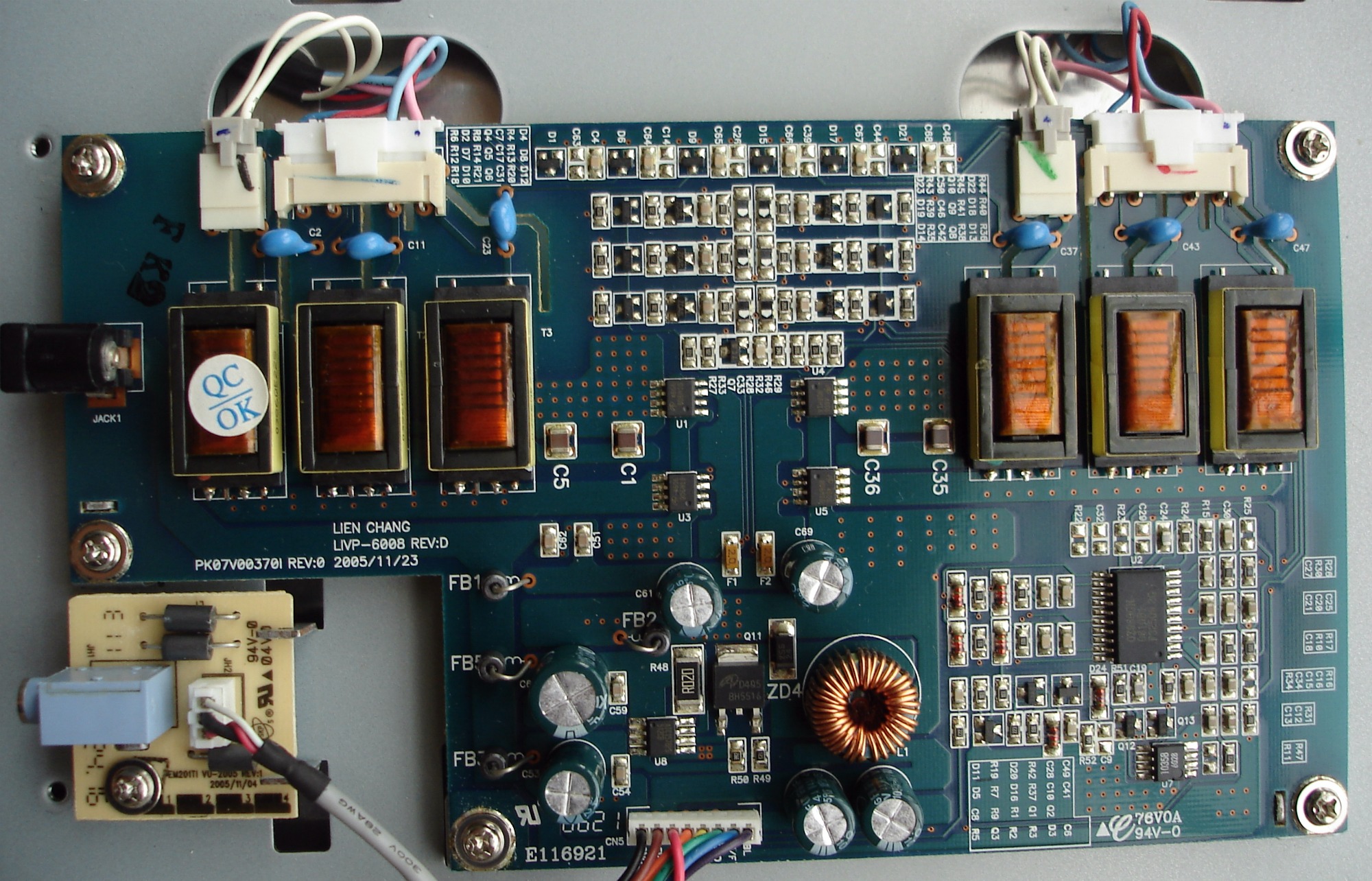 This is an LG edge LED lit LCD Display. The LEDs are on the bottom edge of the display. There are 2 bars (left and right) Each bar has many LEDs and a 6 pin connector. Each pin drive several LEDs thus is the highest current flow / heat junction. The weak lead free solder gradually fails with thermal expansion/contraction cycling and increases resistance. PSU will compensate up to a point, then when the current is too high, PSU just shut down the backlight causing a dark display. I have even seen one which the connector just fell off as solder points became completely detached....