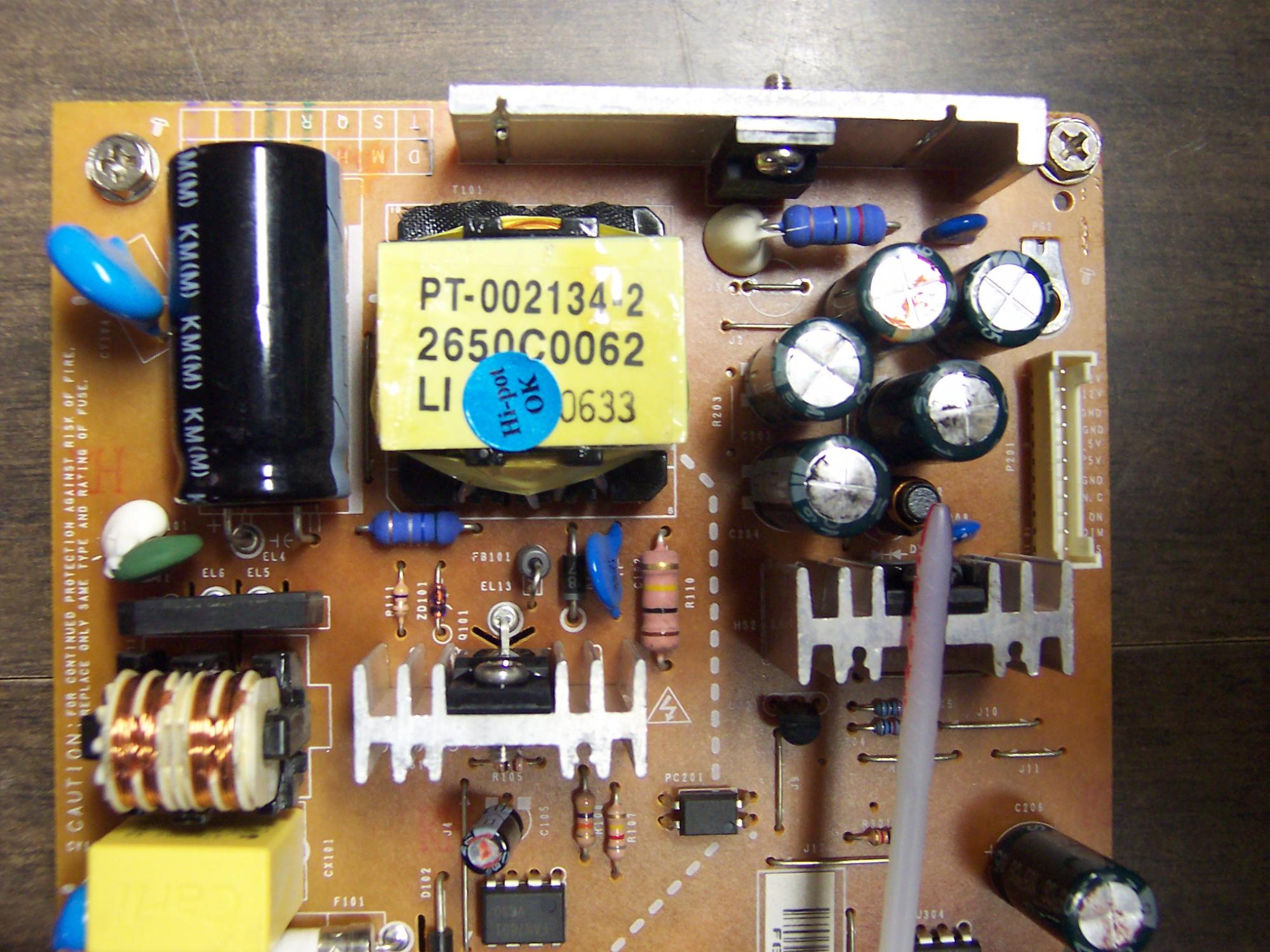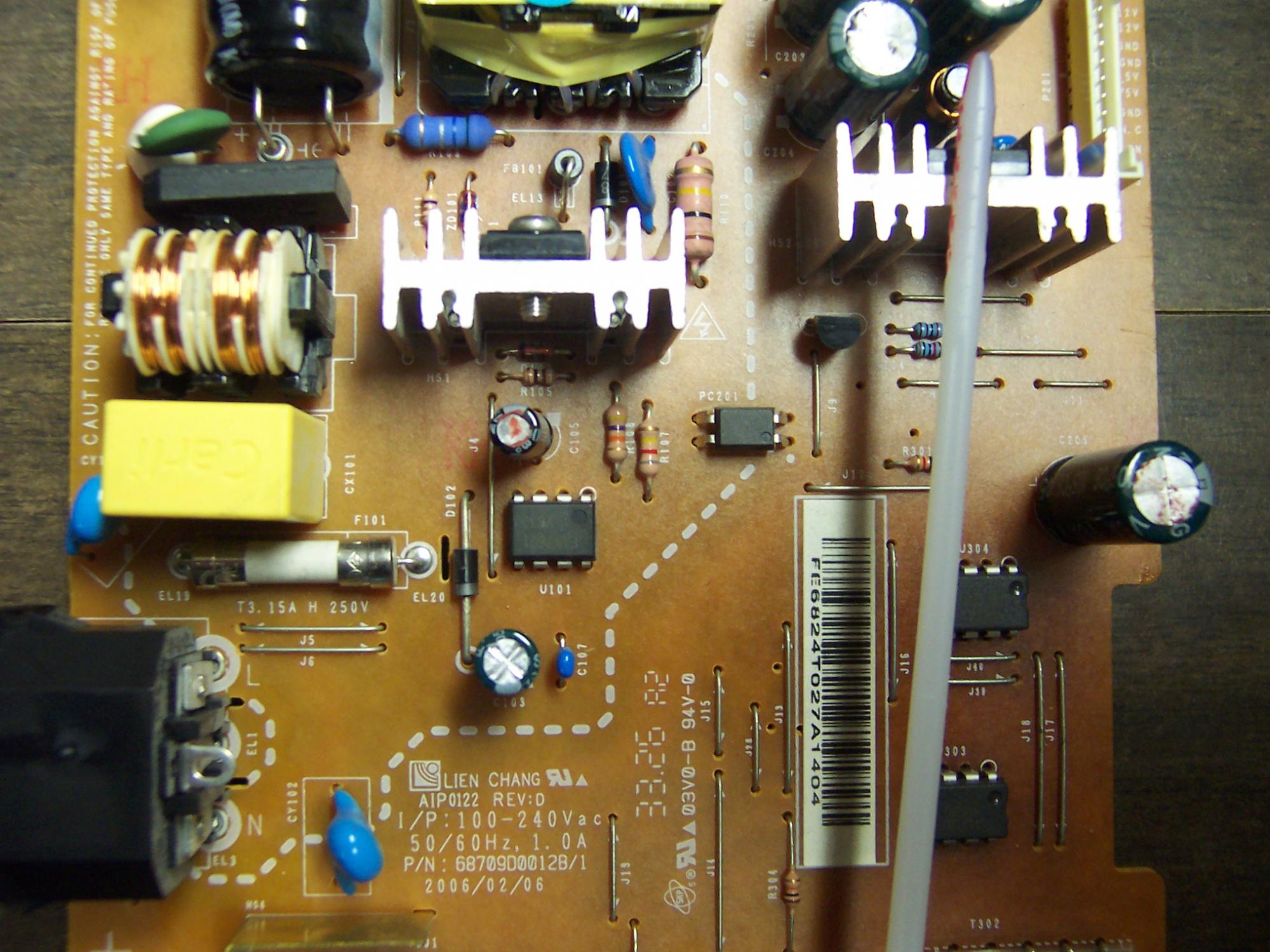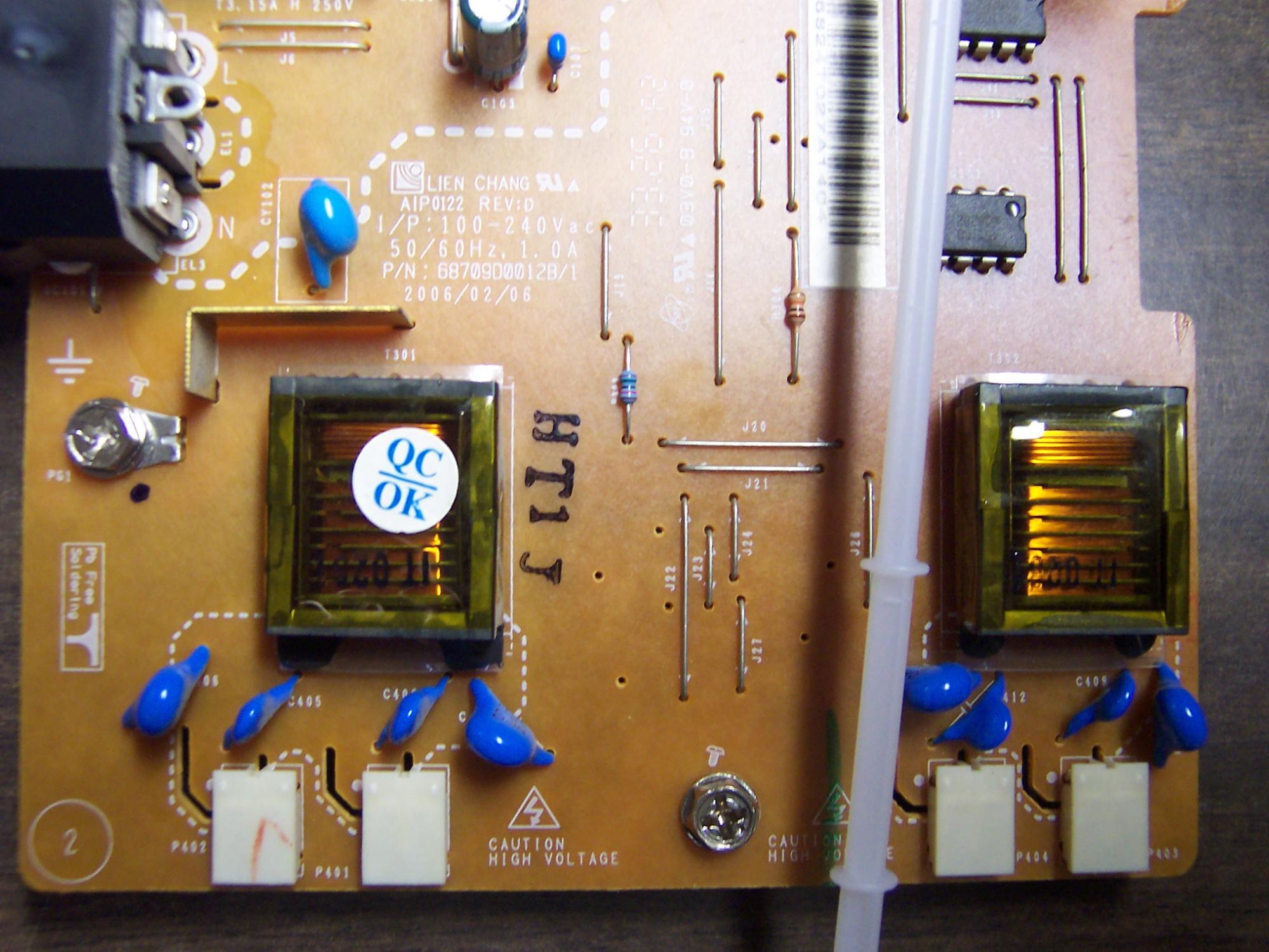 As you can see, it's an AIP-0122 rev. D, made by Lien Chang. If you follow the plastic pointer up the board, you'll see the problem(s) in picture 3. Those are Samxon GF(M) series, known to be a bad batch. In PCB order, they are: