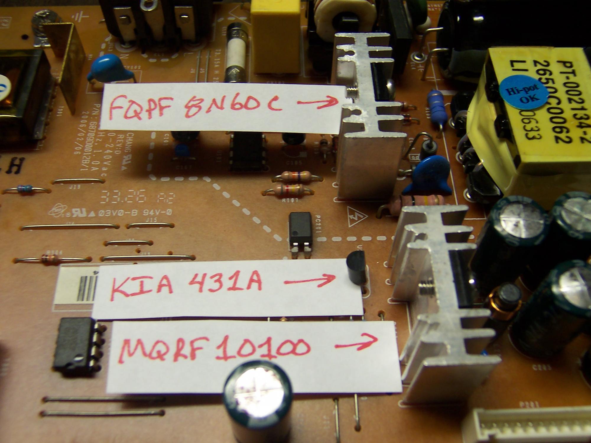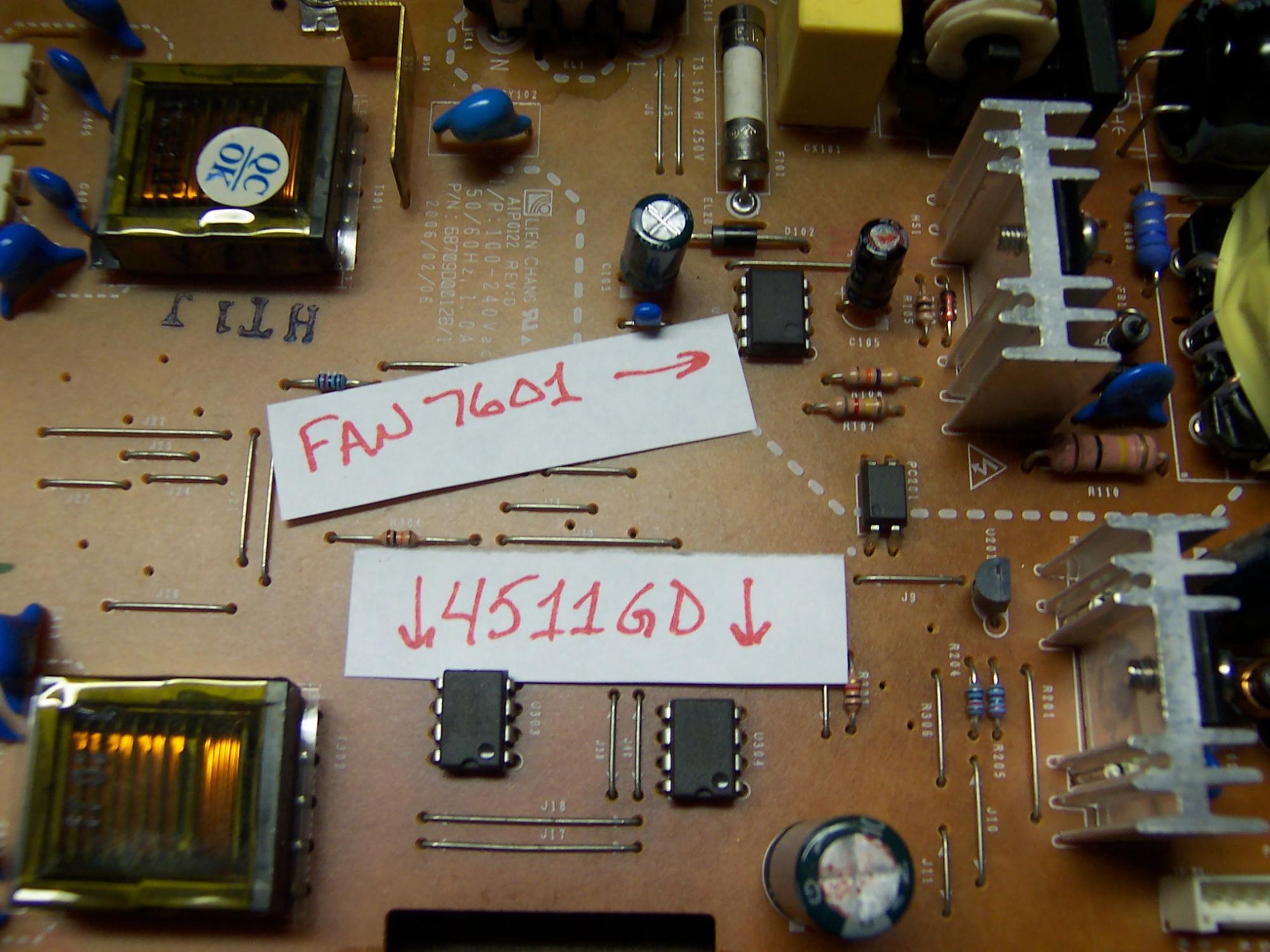 See shots 01, 02, and 03. Shots 04/05 are close-ups of the Samxons by the HS. Shots 06/07 are of the bottom, and shot 08 is a side view of C206 (all the 25V caps looked okay, but better safe than sorry, right?). Shots 09/10 are of the AC input, and shots 11-13 show the HV/CCFL drivers and SOIC MOSFETs (which shows some discoloring on the PCB, but nothing unexpected. In fact, everything but those two Samxon 16V caps looked remarkably good. A quick in-circuit check of the MOSFETs and diodes read nominal, so none of those had to be ordered. Still, for reference, I shot photos of the ICs with my "tags" on them, as "lbl1-4".