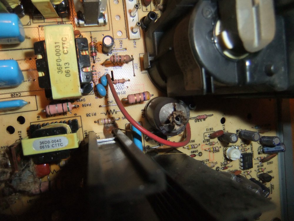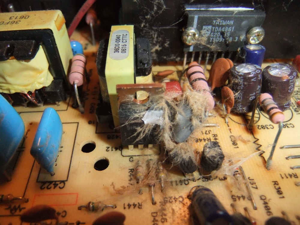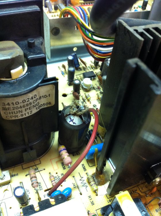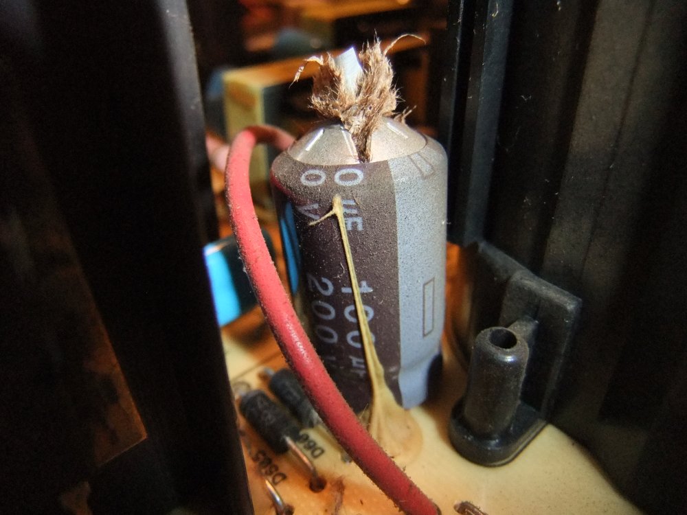 Working on an arcade monitor, and stumbled across this badly blown cap. The circuit this cap is in is well known for chain-reaction catastrophe... however judging by the other swollen caps on the board this guy was hurting well before the explosion. There was a smaller cap nearby that had completely vaporized, leaving just a fluffy stringy mess and two leads sticking up from the board. There was foil confetti all over the board.