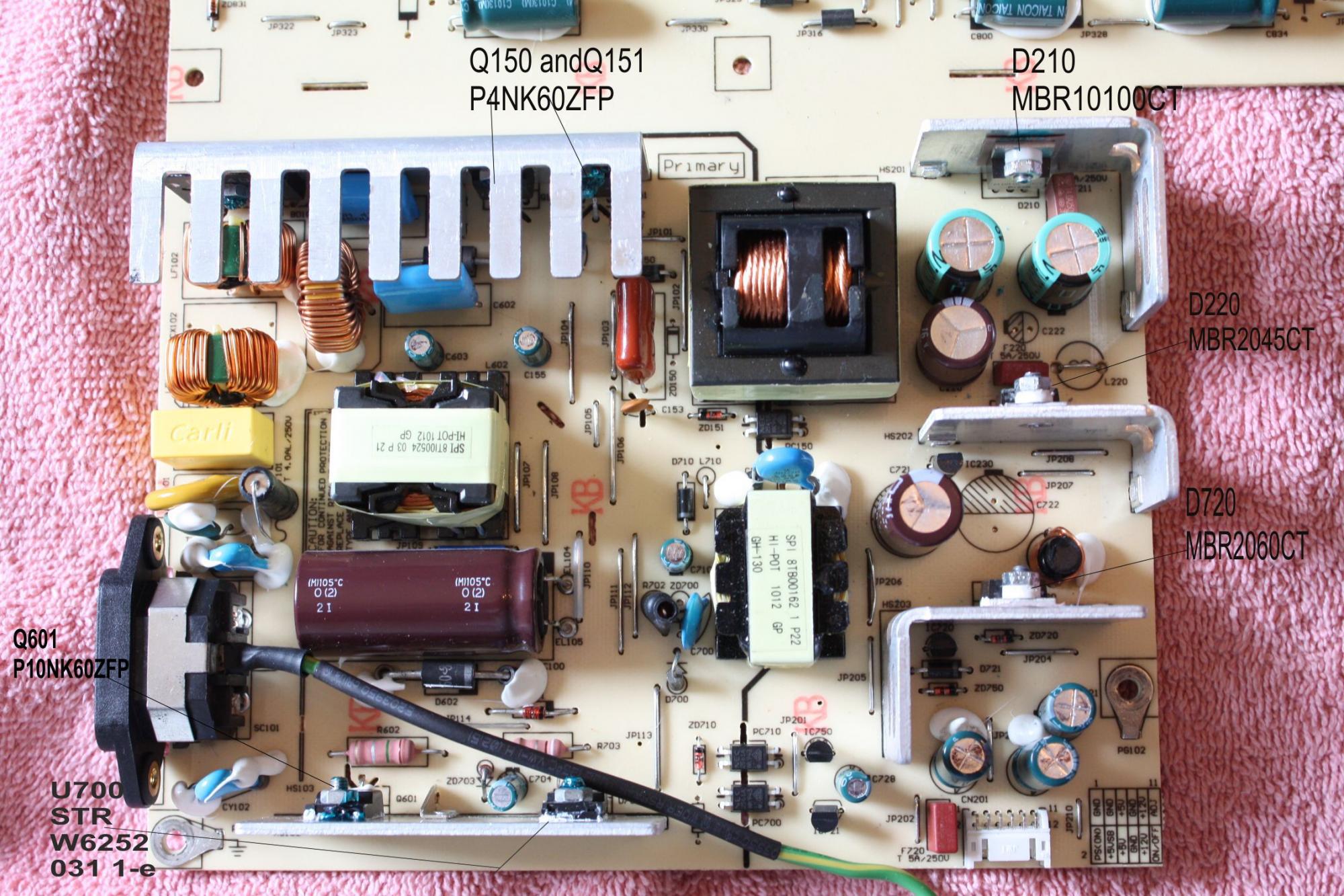 Also, I read up on how to measure those schotkzy diodes. One was to put the black probe on the BIG cap negative side, and the red on the middle pin of the Schotkzy, Power on. And the other way is to measure with the diode test pwr on. All i'm interested in to see where the power stops at. The inverter board is dead. I guess i will try to get thenew caps soon, but really wanted to find out if that is the only problem. I'm rather new to these newer LCD's and my electronic knowledge is constrained. Please bear with me on the learning curve.