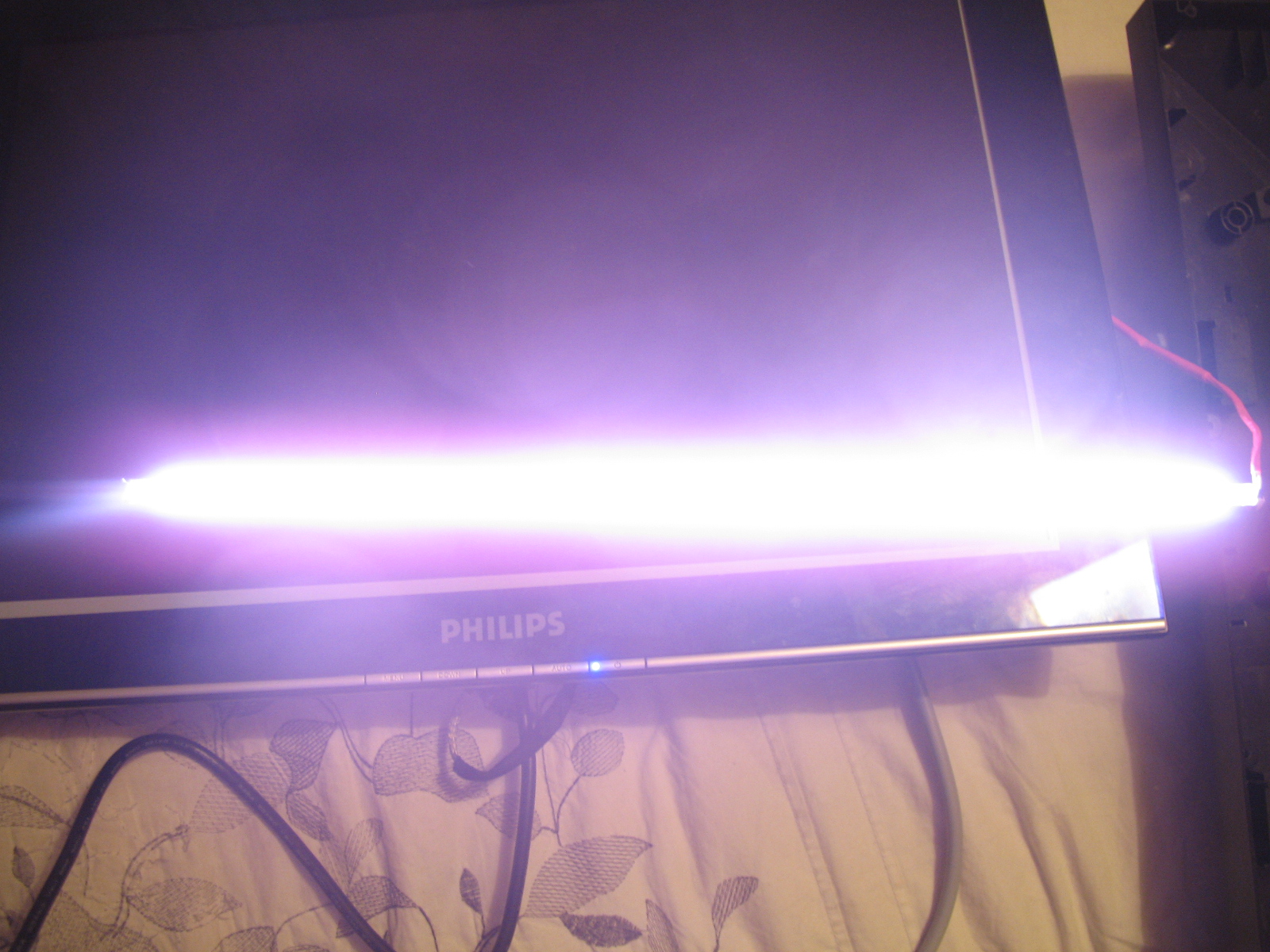 When I did get an image on the monitor it was tinged red/pink, and I've seen elsewhere that this could be an issue with the CCFLs. I could also see the faint image in the background, without shining a torch. So I stripped the monitor down further and managed to get access to the tubes. As you can see from the attached images these are black at the ends and are probably knackered. Both sets of CCFLs are black at the ends.