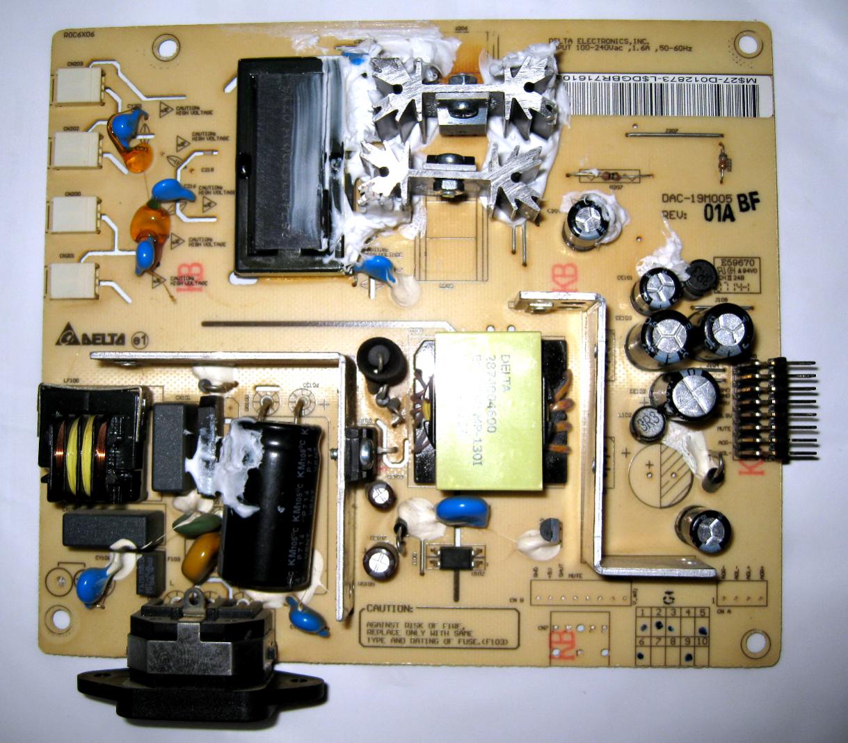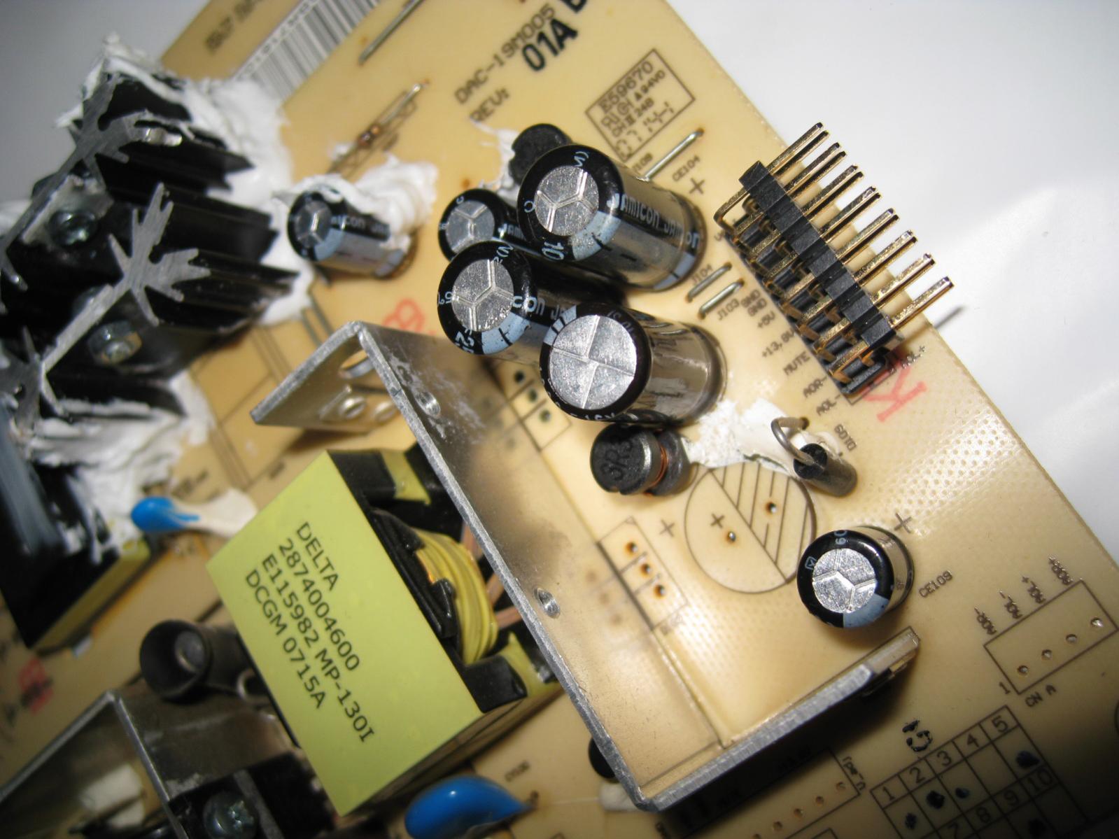 So I've had this monitor for probably a decade now, and it's finally starting to fail. Began with a little sporadic flickering, then eventually started going black (power LED stays blue, can still see image on screen with flashlight). A power on/off fixes it for a bit, but then it happens again. Once it got to the point I was dealing with this every few minutes, I opened it up and just replaced all the caps (minus the big one) on the power board with new Panasonic ones. All the old caps tested fine on an ESR meter, and this worked for 5 days. But the screen just went black again today, so...