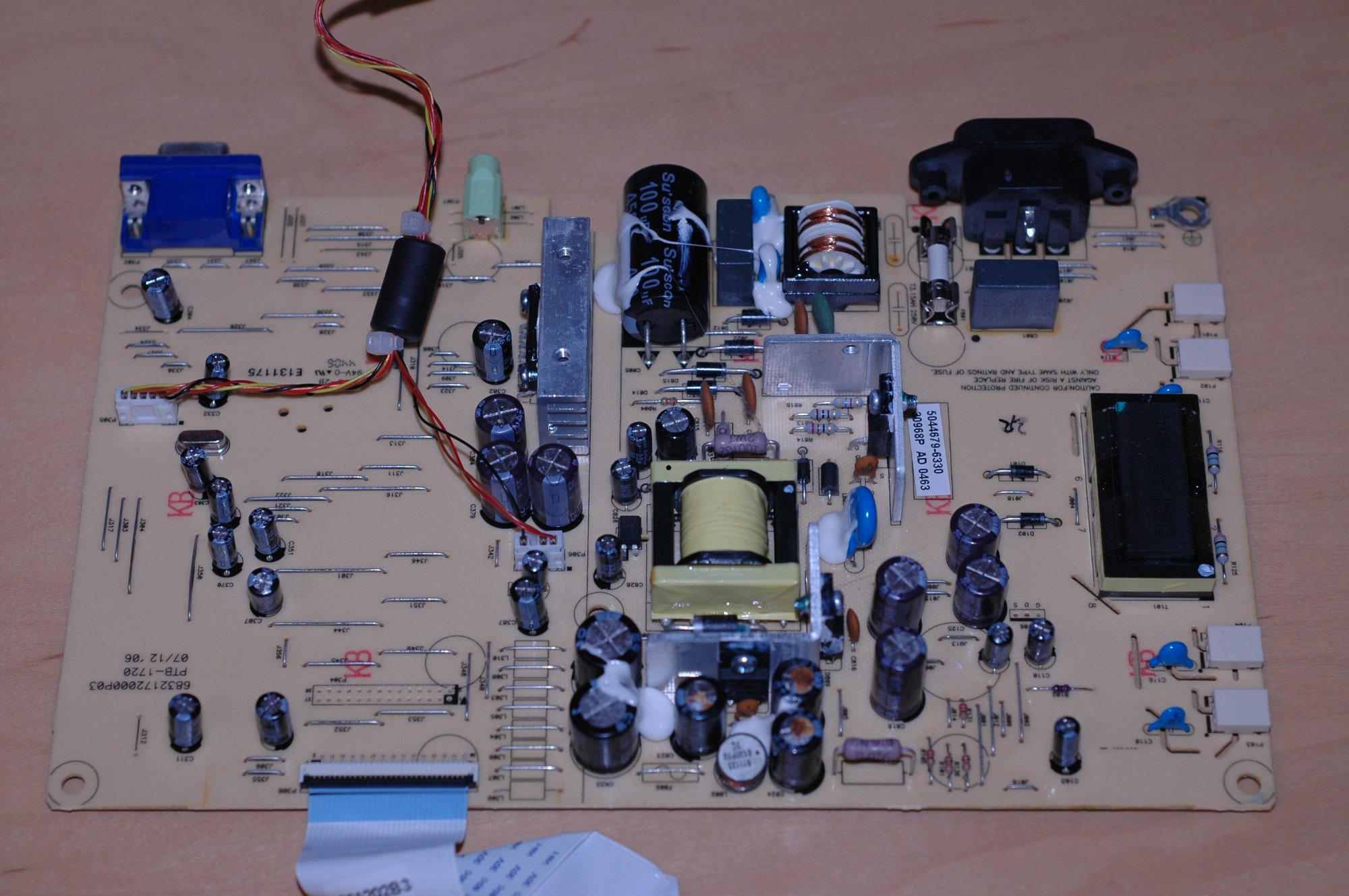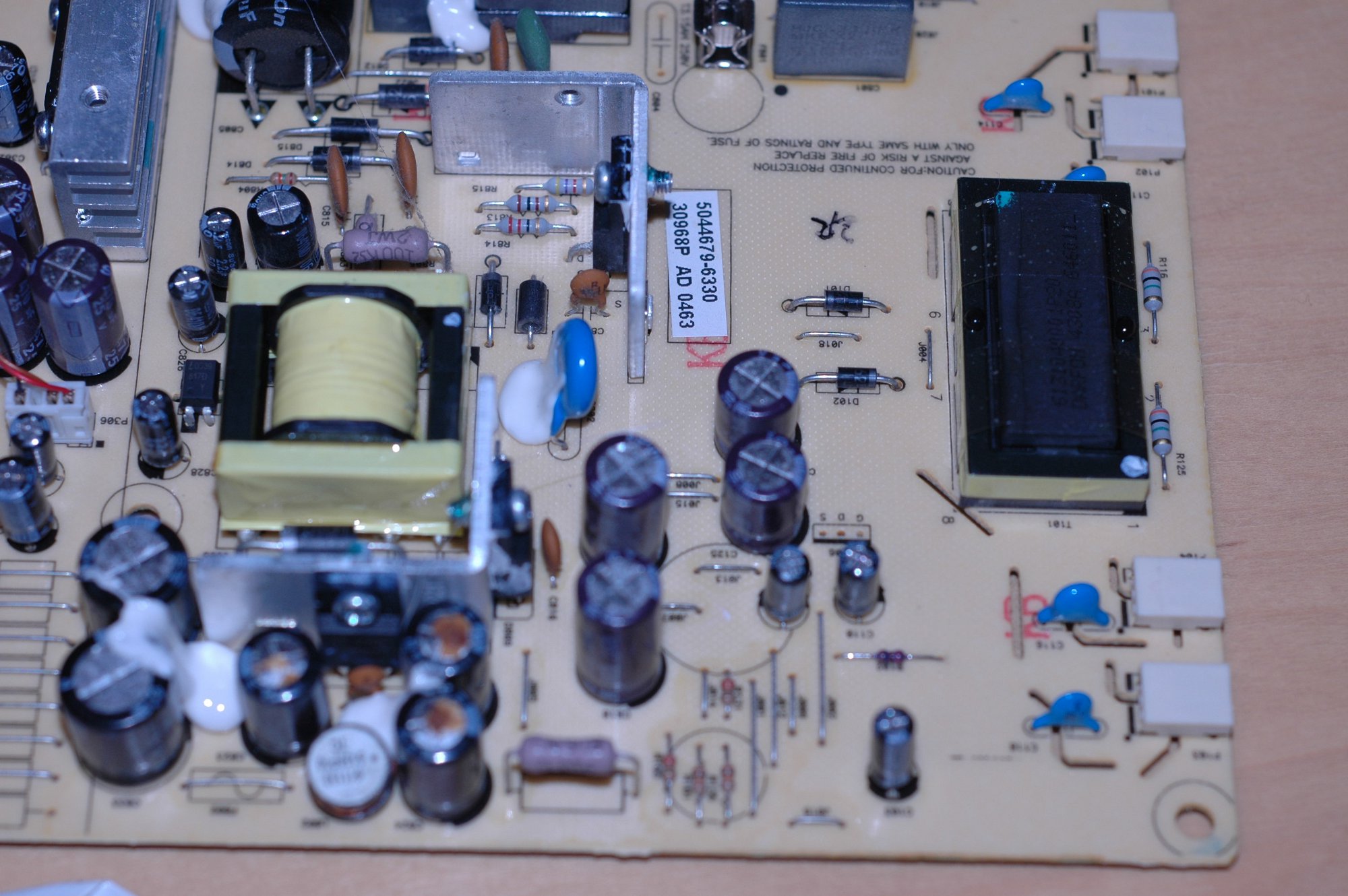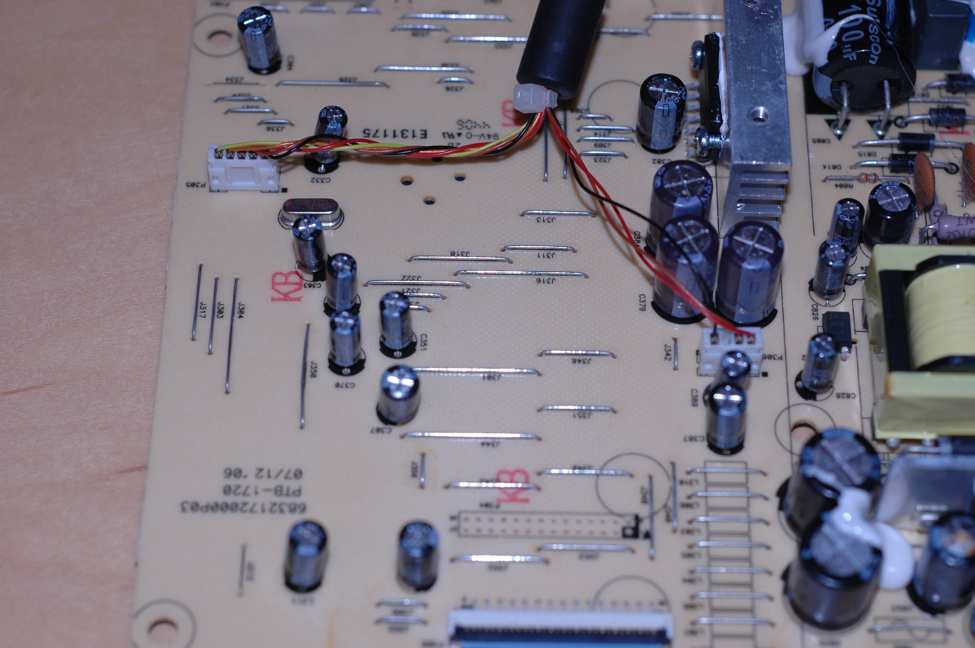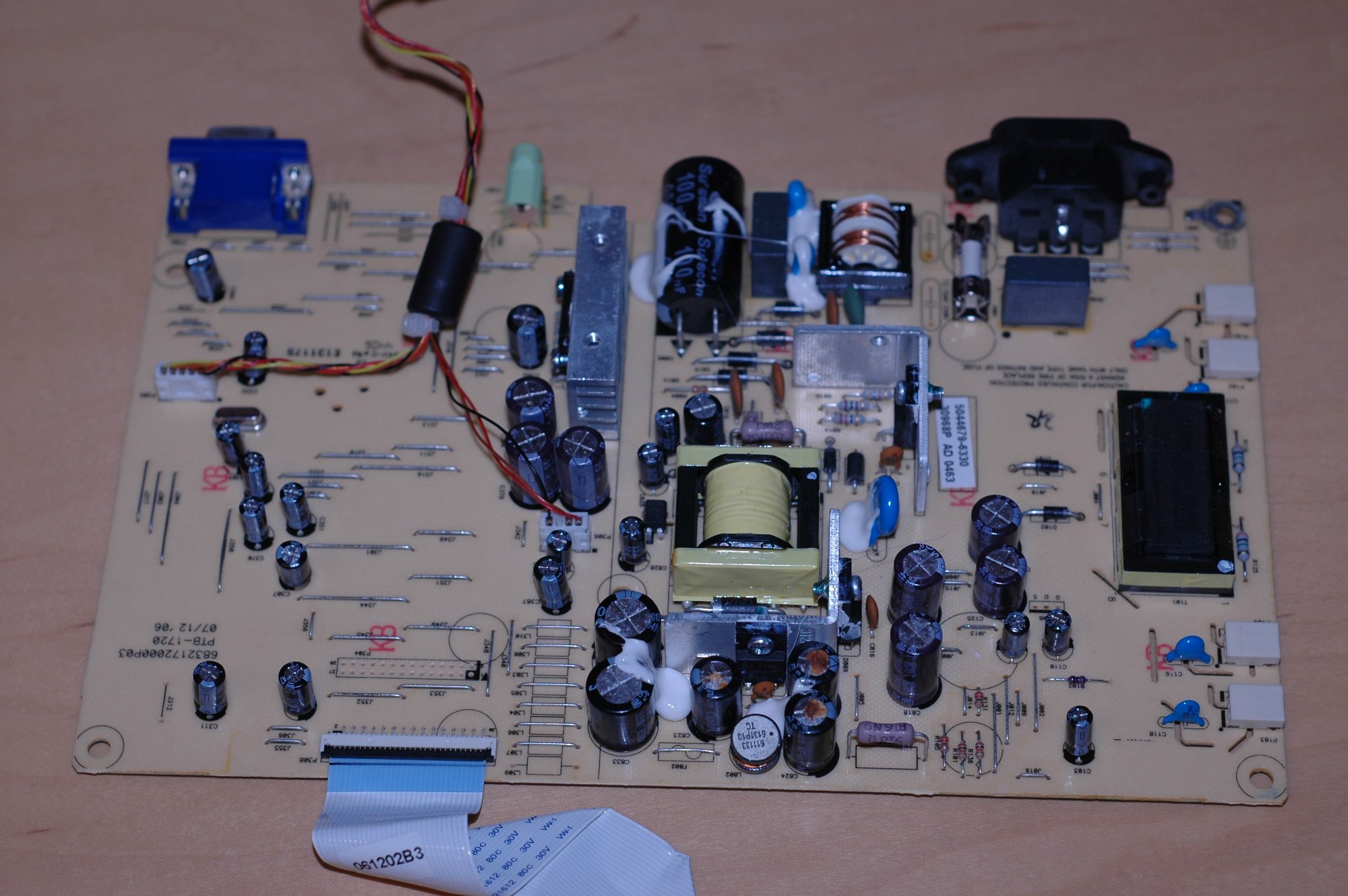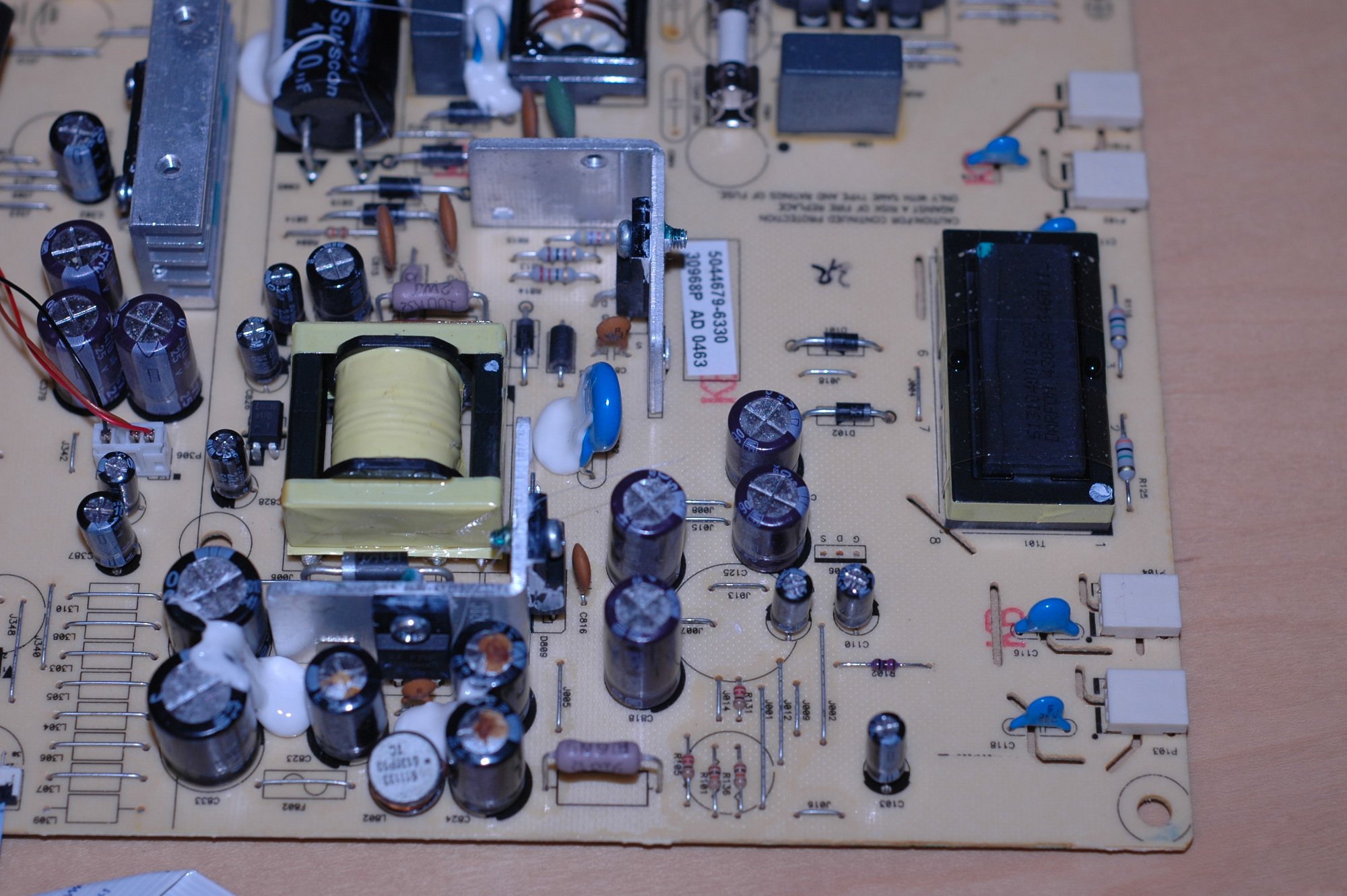 Hello, I have a Hp vs17e 17" LCD Monitor That Will not Turn On. I Pulled it apart and immediately found three caps that were oozing. I assumed that they were on the 5v Rail being 10v caps, plugged board in out of the case, and Pulled out my multimeter, turned out correct they measured 5.1v, however I got a surprise when I hit the power button the 5v rail drops to 0.75v. Anyway, I am almost sure that those caps are the only problem on the board, as I was able to get the power light to flicker dimly with only the board connected.