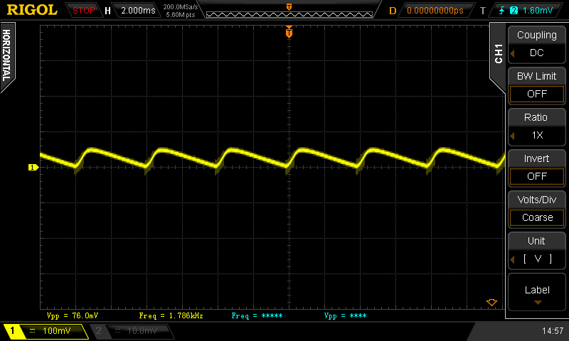 Here are shots from pin 2 (osc) and pin 10 (fault).