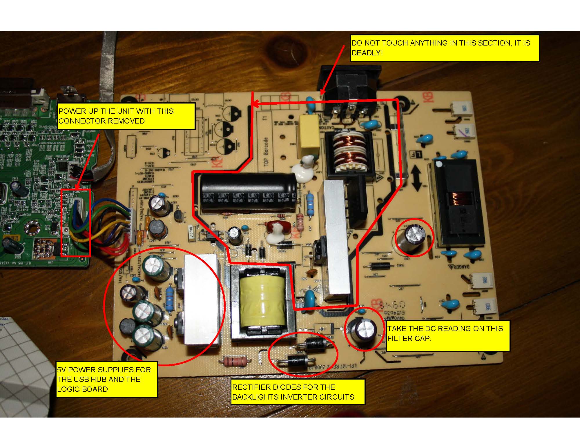 I have a ViewSonic VX2260WM monitor which stopped working months back, the power light blinks, quickly shutting off again and nothing else happens. As the PSU caps are a common problem with these things I've taken the board out, but there doesn't appear to be anything wrong with it, at least not visually. Have only a basic understanding of electronics so don't know how to test it.