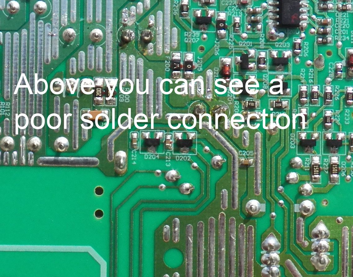 Found an obvious cold solder joint underneath from the attempted cap repair.