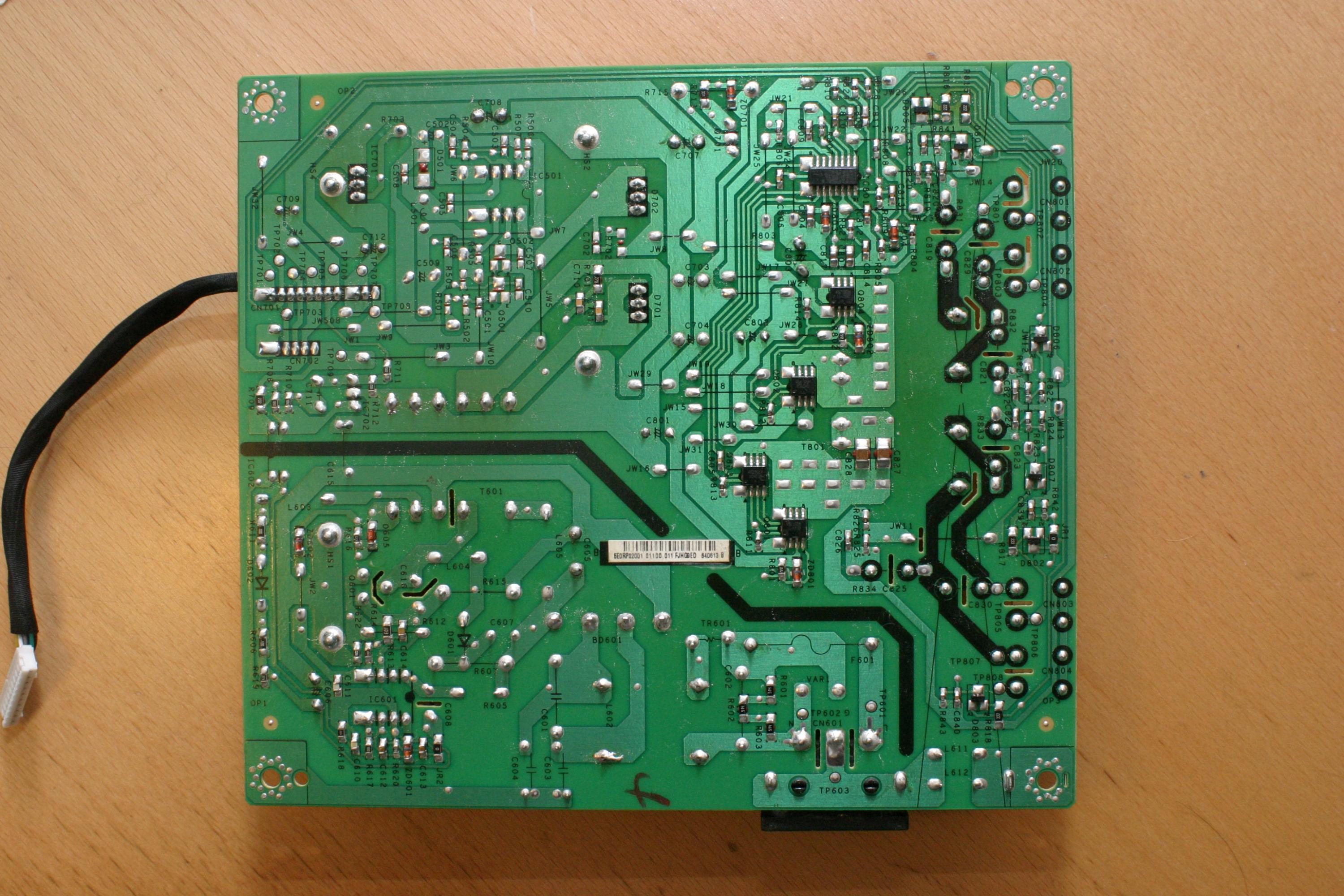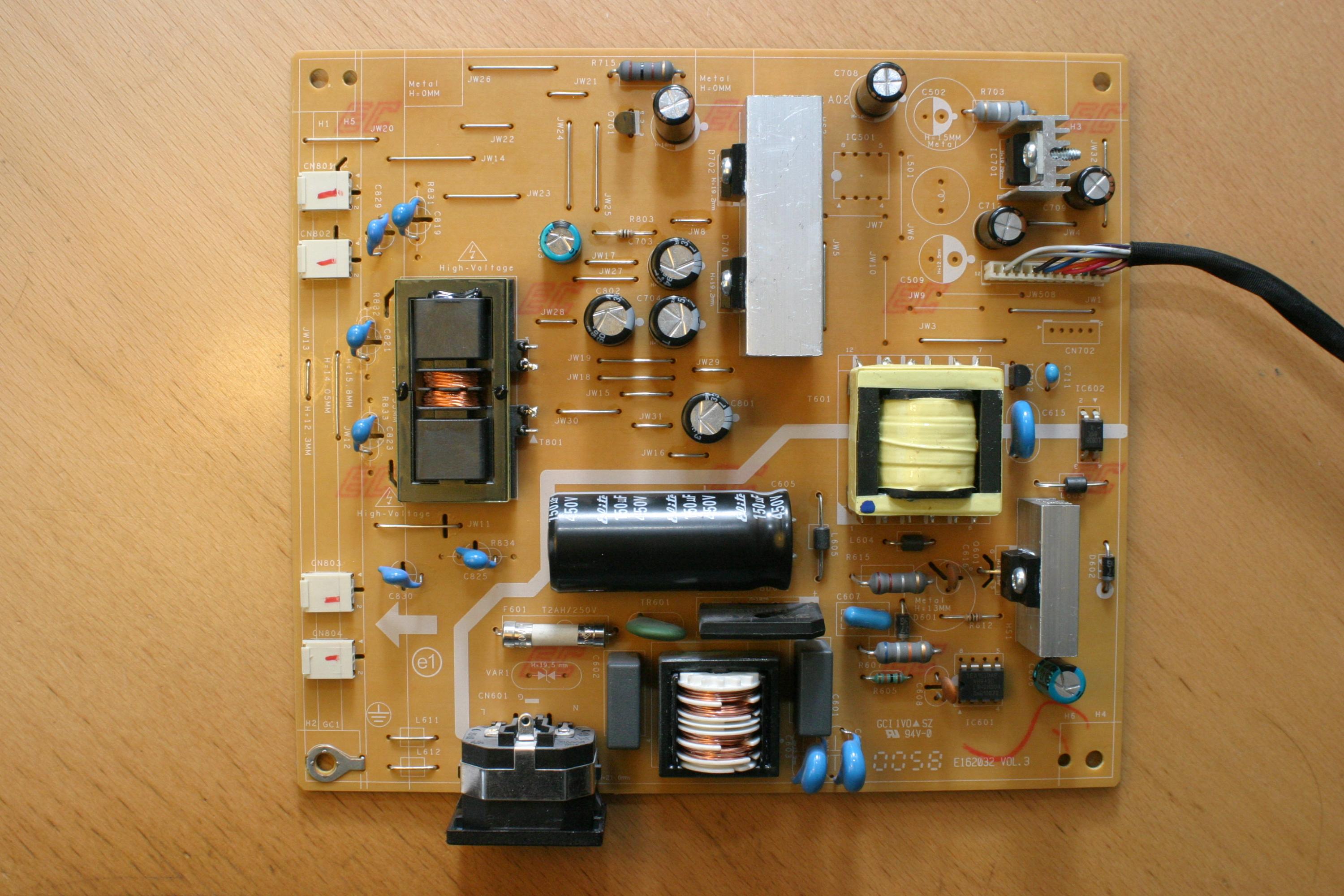 Ok, so I changed all the caps, even the two on the VGA board and put the necessary components in place, hoorah, it's working. BenQ logo was on the screen and then it said "no signal" like it should. After this I took the powercord off, checked everything and wanted to test it with signal. After the connections, power button and bang, white screen. It stayed a bit then off then white again, black and once more white. It stays like that for 20 seconds before going to sleep mode, power led turns amber from the green it was with white screen.