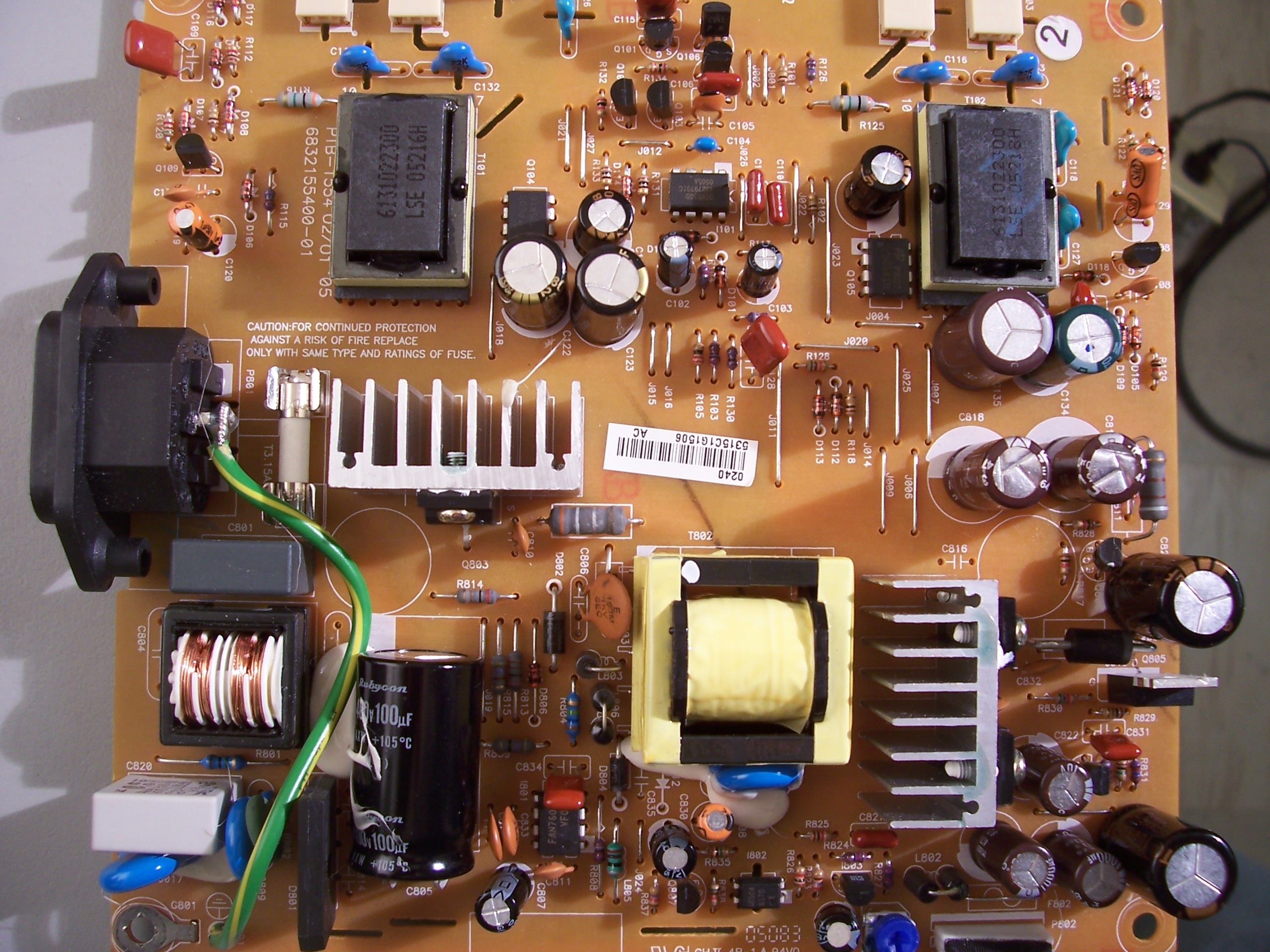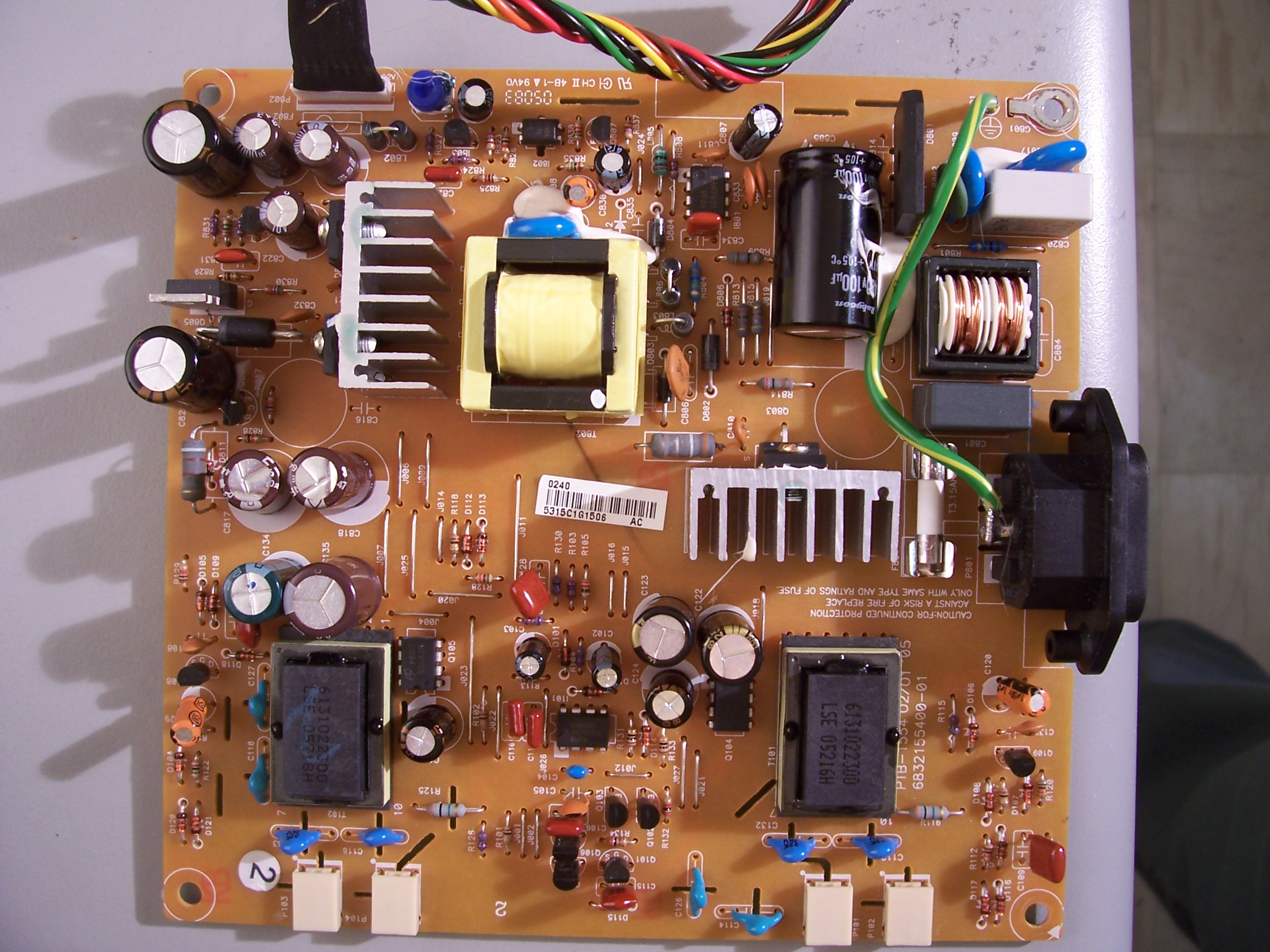 This is a 19 " HP which powers on OK but the backlights will not light. I tested these lights and they test OK I replaced all the cap on the power board with same results. I am looking at retiredcaps sticky and am thinking that it may be a transistor but I am rather intimidated by these because I am not sure how to identify them for example how can one determine the start/stop transistor? The signalling transistors? etc. This board has quite a number components with the Q designation but look different. Some has E,C,B and some has S,G,D and than there are some with 8 contacts like the 2 (P607 BD5A18)