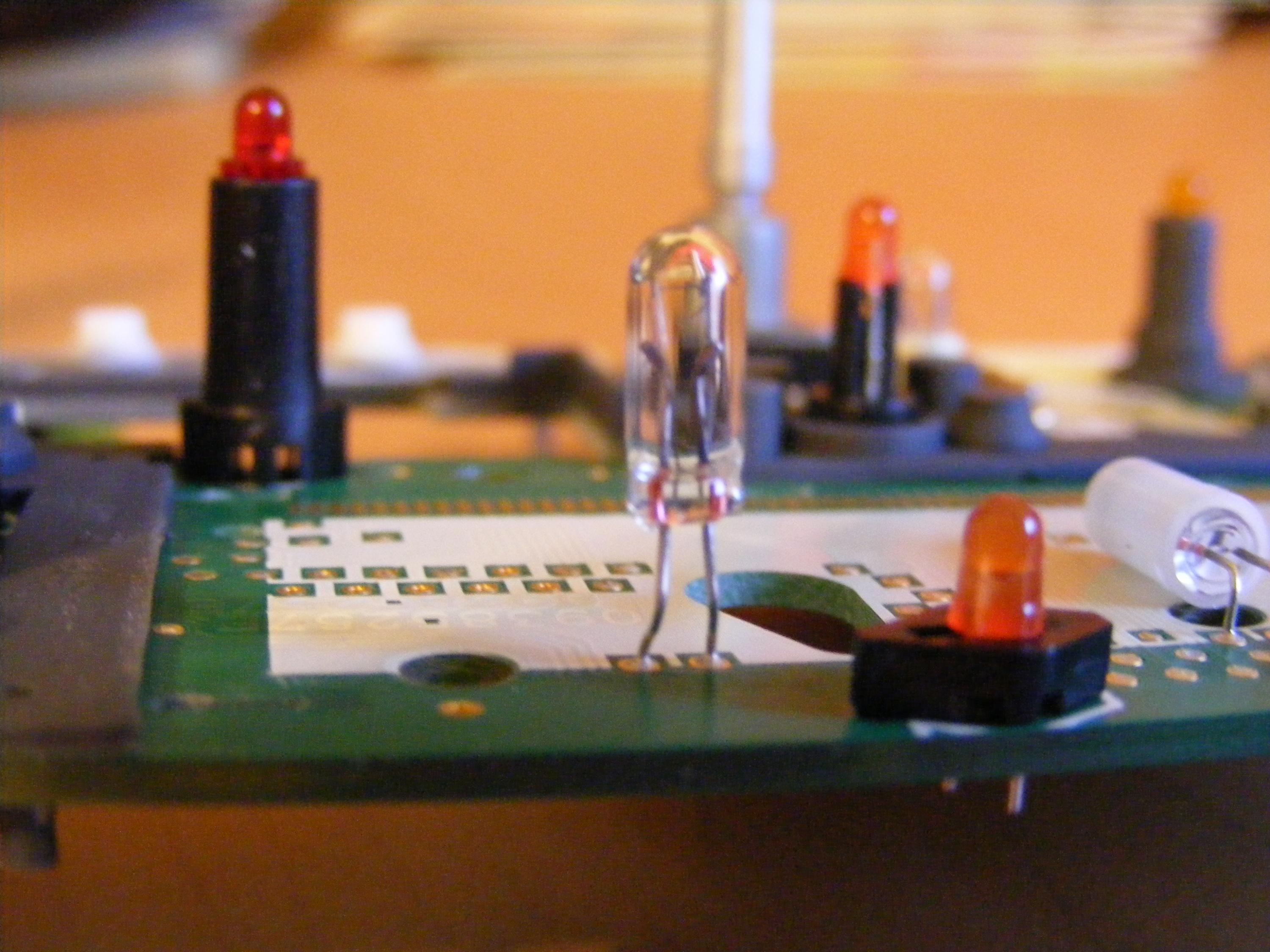 I cracked open the radio casing and disassembled the thing in order to get to the front panel board and found three unidentified type lights driving the display (pictures should be attached) At first I thought these were LED but after removing the rubber sleeves, they now look like some type of miniature incandescent lights. Would I be able to order replacement lights of this type?