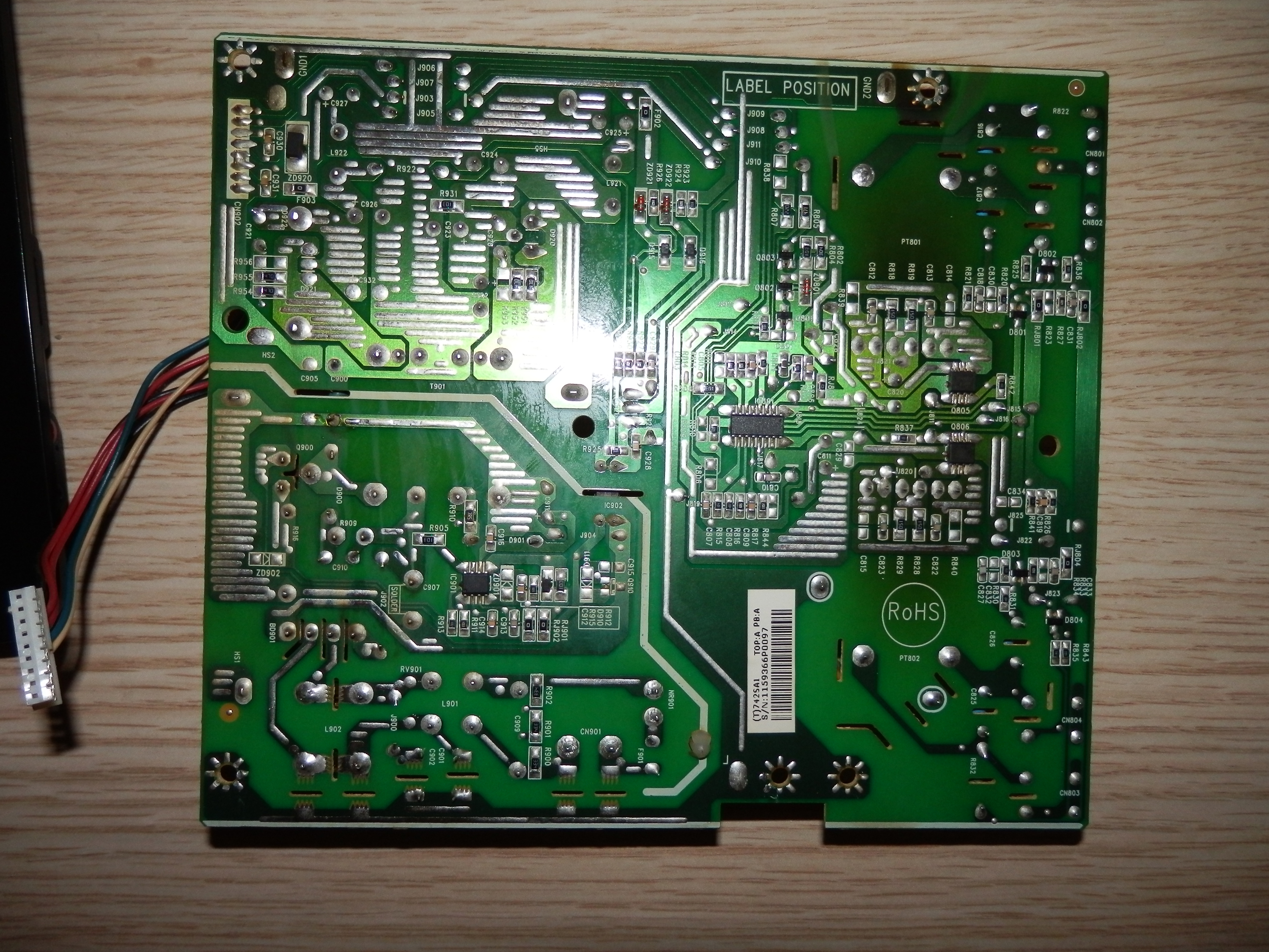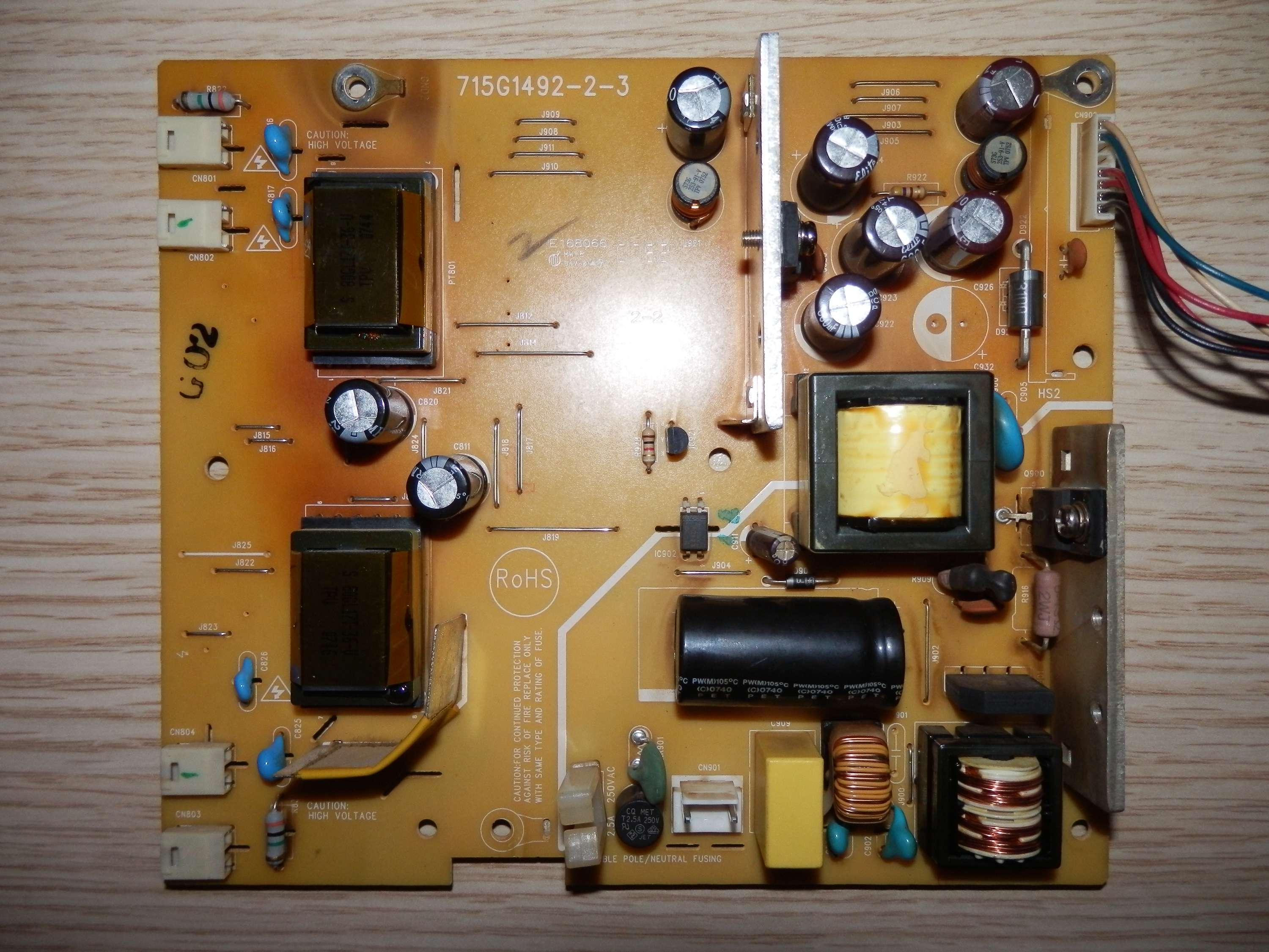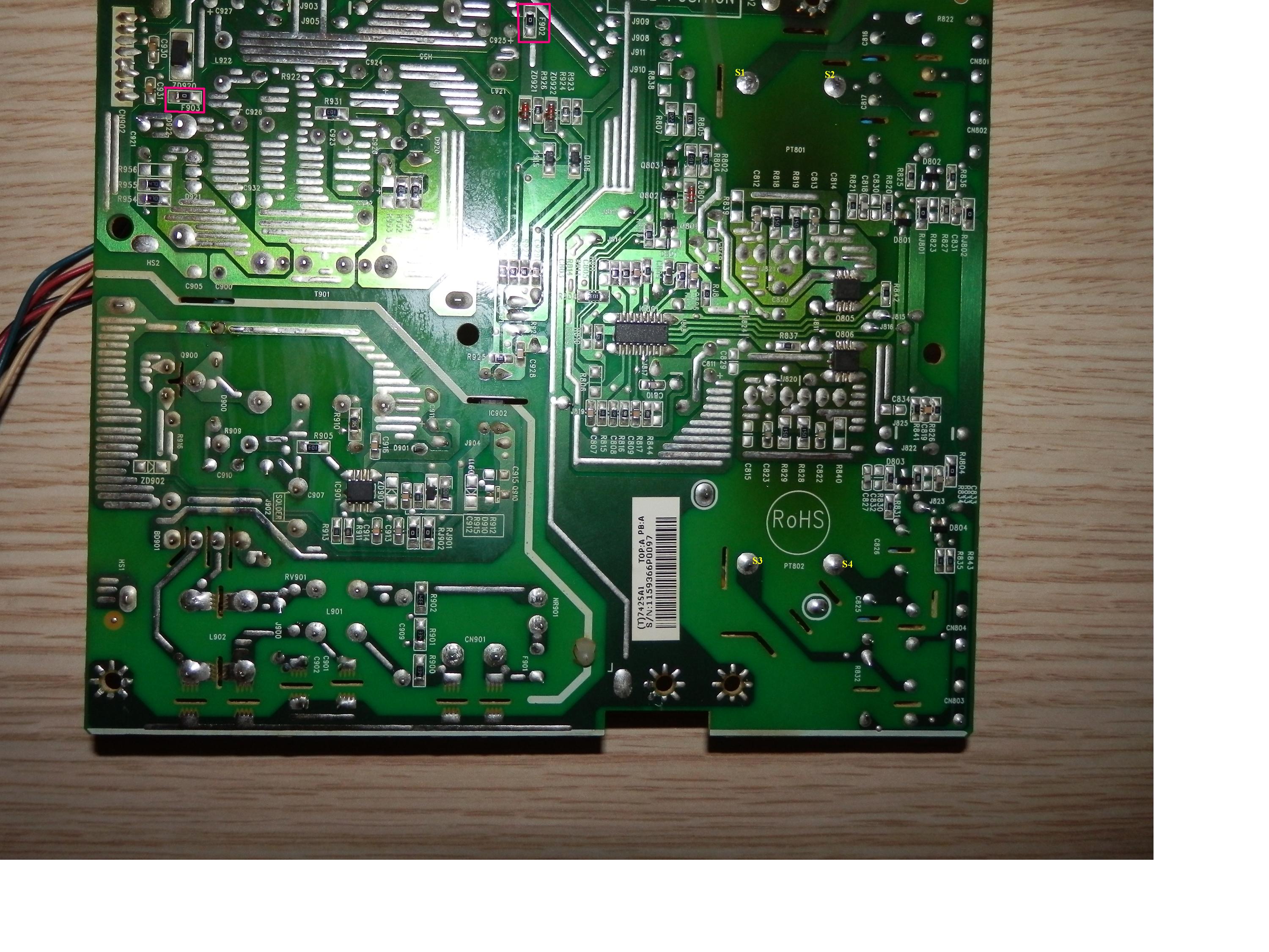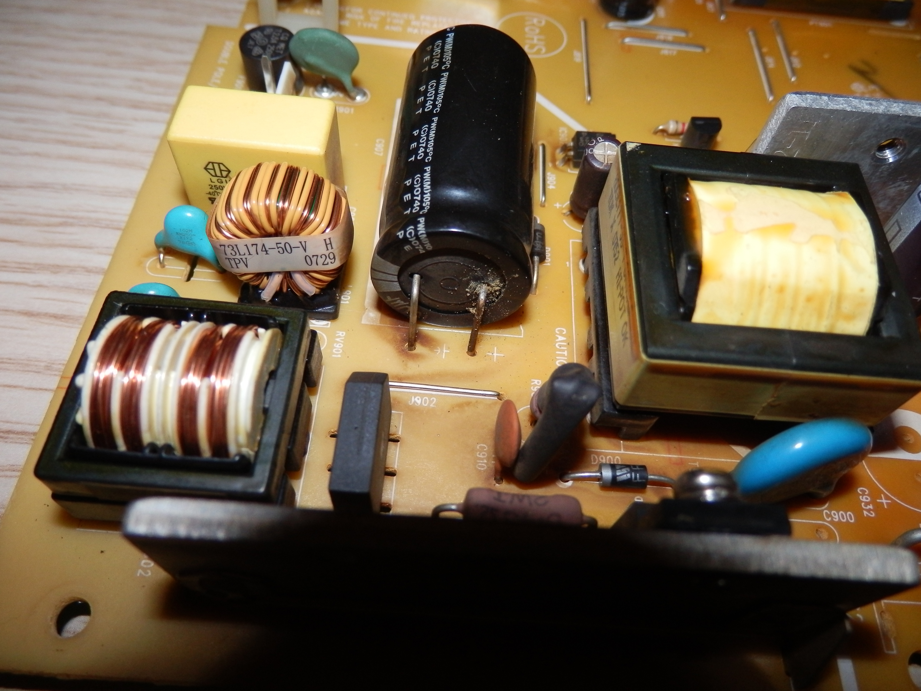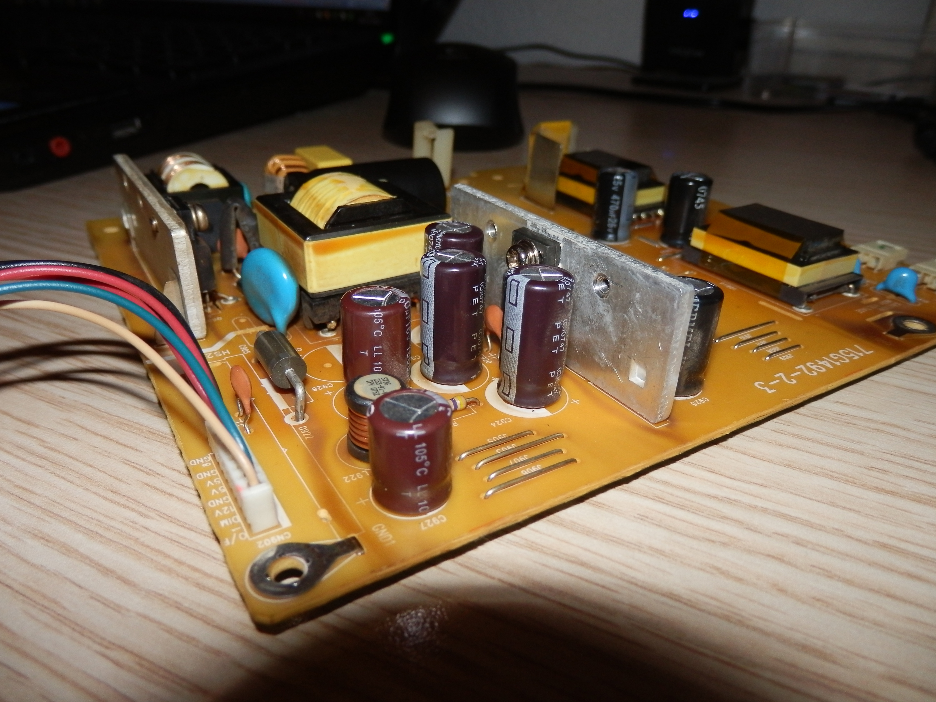 I don't see any bad caps, or other burn in elements. However, the main power board has brown areas due to hearing or something like that, and the logic board has one regulator which seems to be heating, but when I measure it shows good voltages.