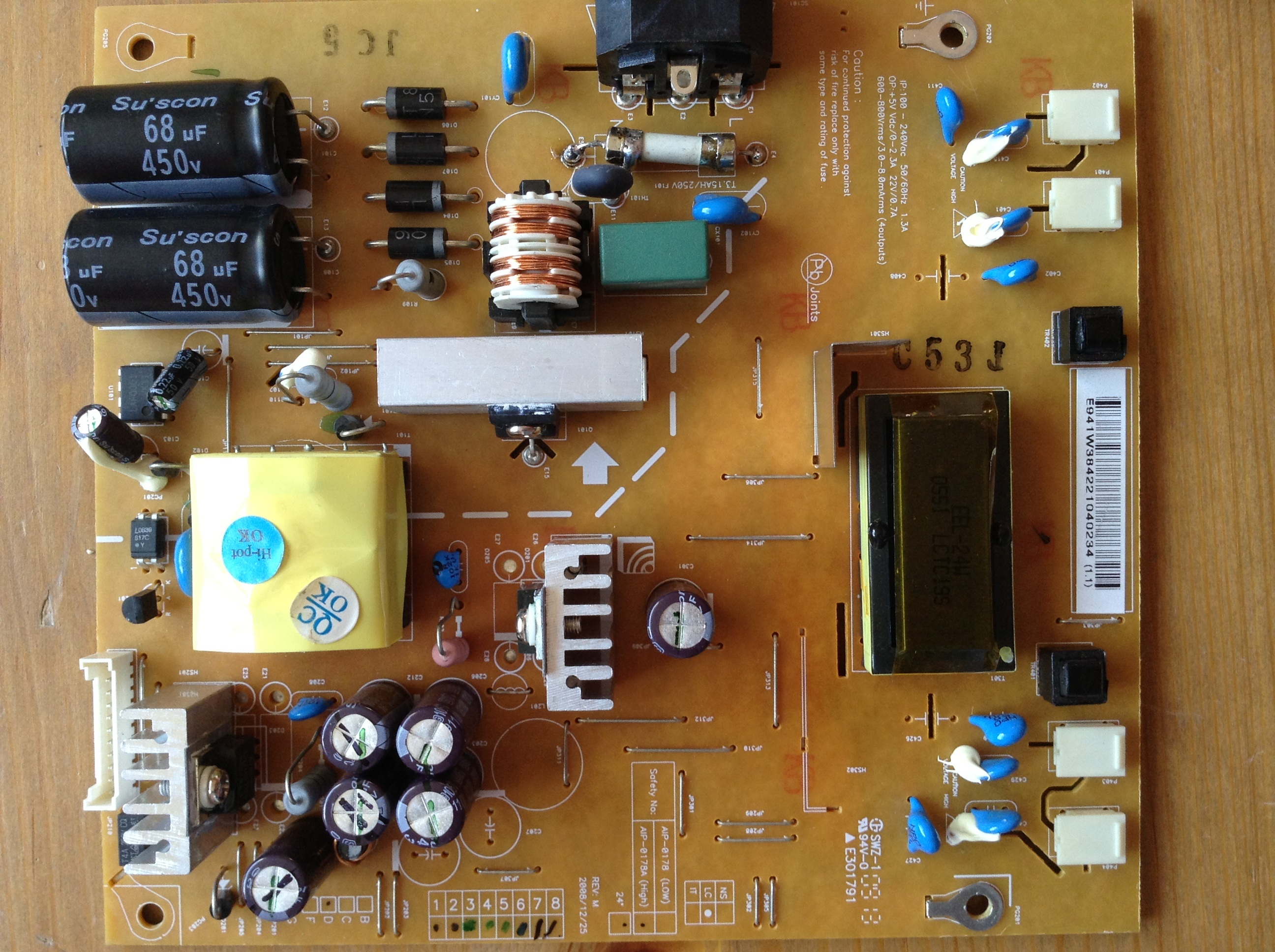 Hi - would have preferred straight on pictures of the boards - we need to be able to read the board numbers. When you measure anything you need to tell us what result you got. Anyway first can you test the voltage on the two 68uf 450v caps.