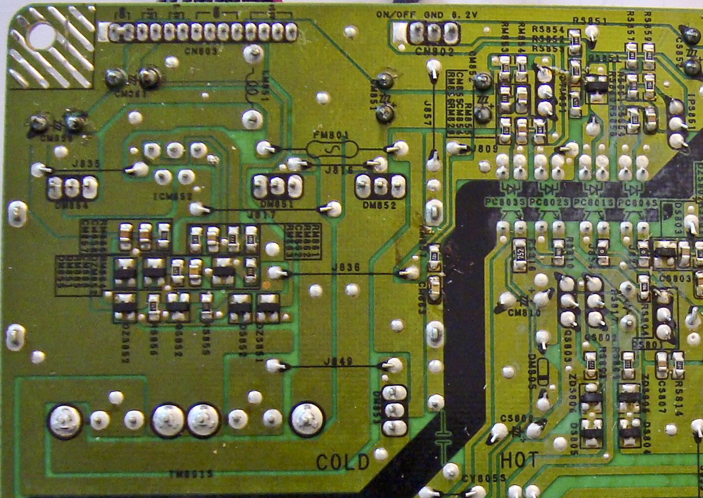 If you look at the picture of the power supply board in post 1 you will see large thick black line drawn on the board, the area in the left of the line is the deadly Primary side (the negative leg of that large cap is the ground ref point for the Primary side), the area to the right of the black line is the secondary side (cold side), the ground ref point for this section is tied to the chassis ground.
