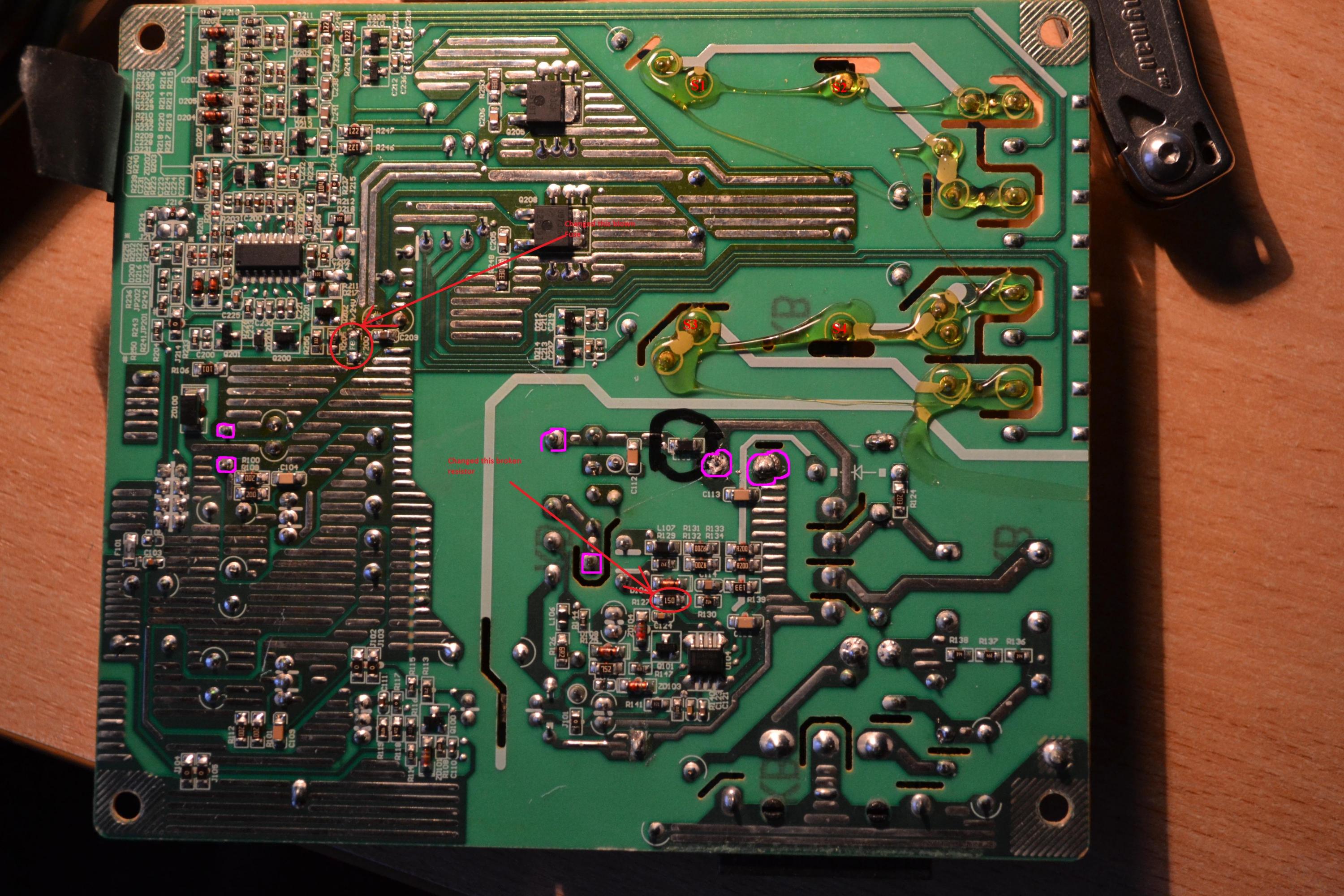 When I turn it on, the blue light lights up for 5 - 10 seconds, the screen flashes and I can see something on the screen with my flashlight. After 10seconds, it turns off. I've replaced the F200 fuse and one resistor. I've also browsed several threads about this monitor with no luck. Also, when it the monitor goes off ( red light) Then I can hear a buzzing sound.