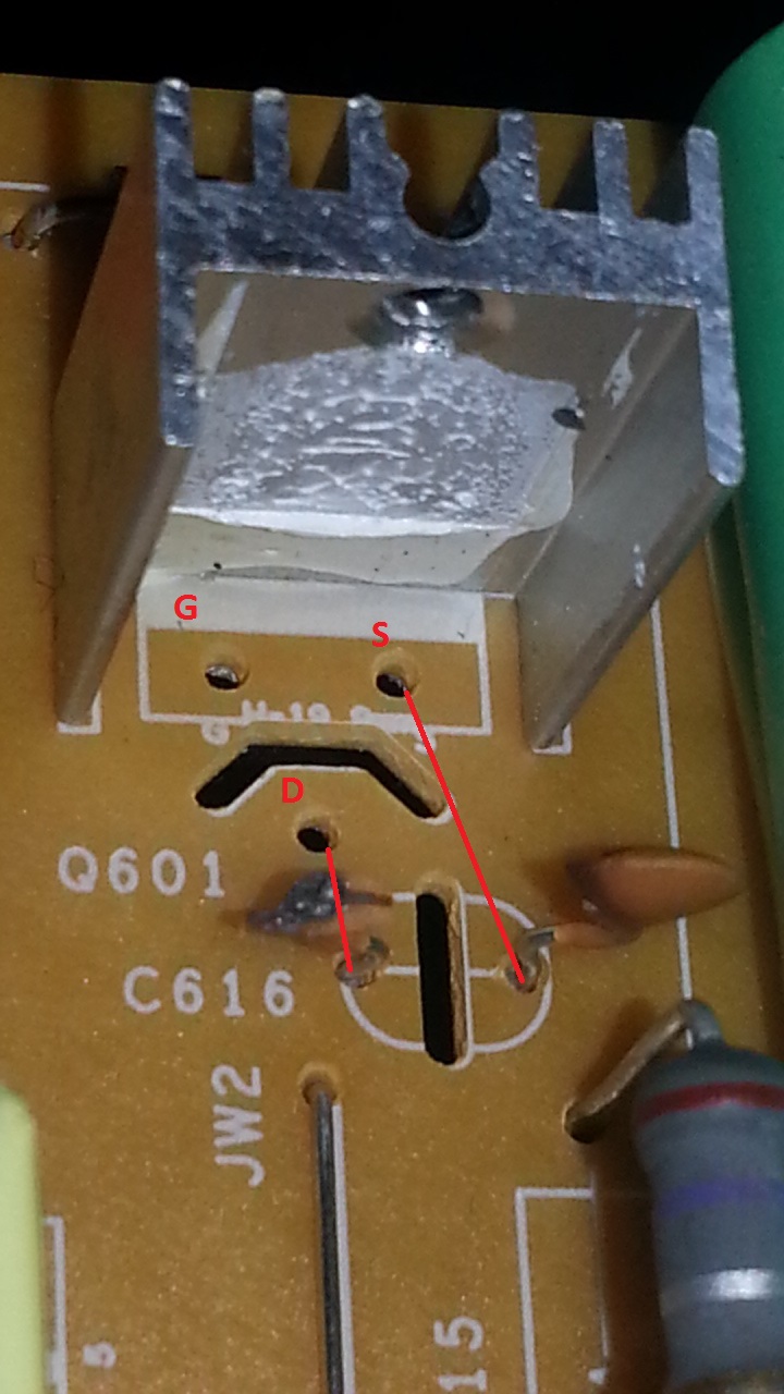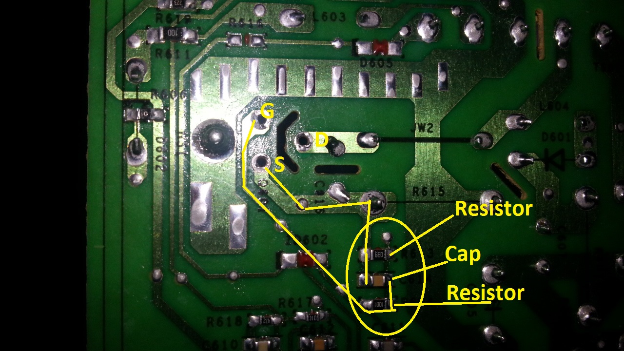 Yes that cap between the source and drain shorted/burned out and the resistor (grey next to the main DC filter cap) is connected to the neg lead and the other to the Primary pos