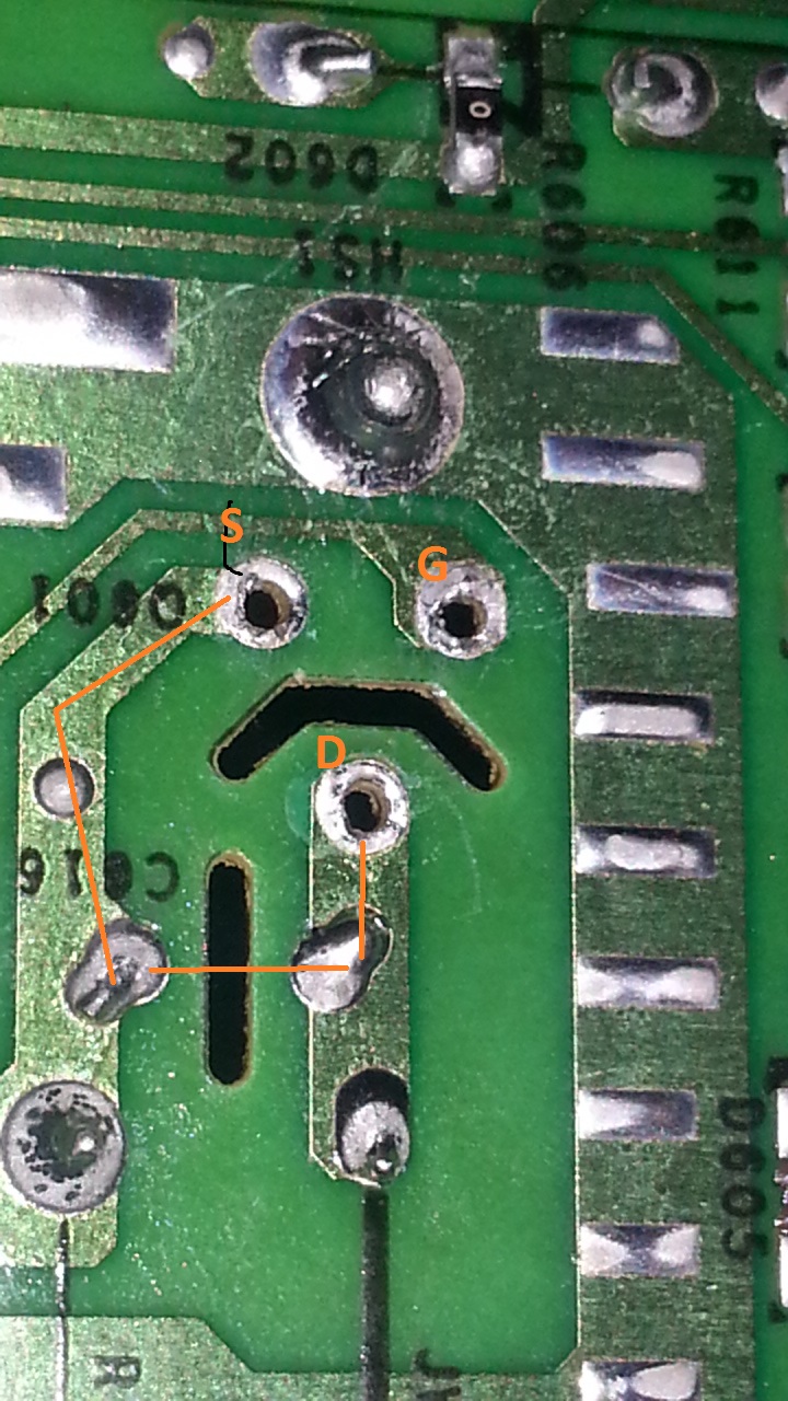 I've already got the fuse on my list to order. I've looked over the board both sides and and I dont see any resistor attached to the source and ground pins. There is a disk cap connected to the source and drain pins as posted in the pictures attached. The cap had burned out and I have that on my order list as well. I labeled the source ground and drain along with the links in between them.