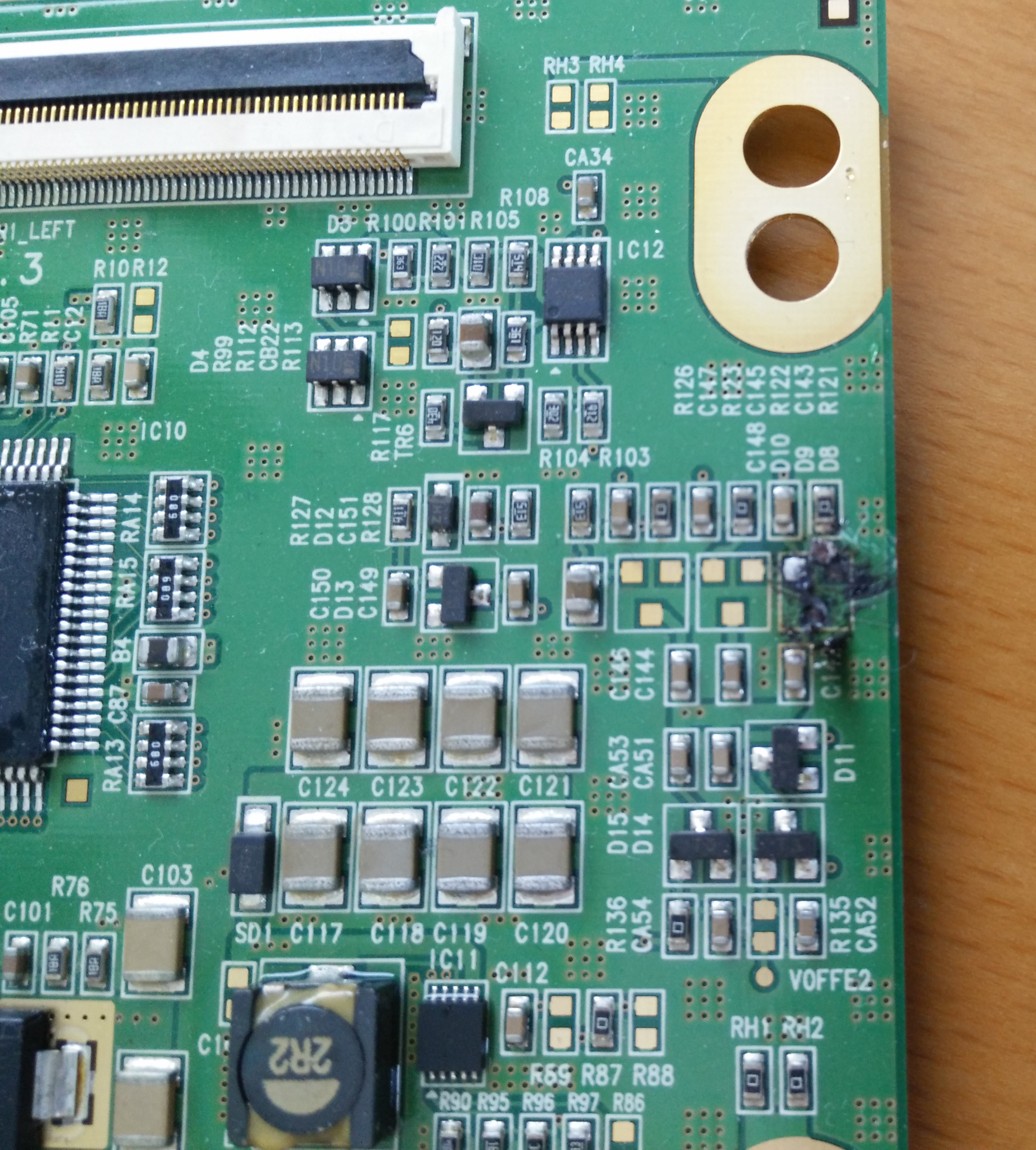 It powers on and I can hear the beeps from the onscreen menu however the menu isn't displayed. The backlight does turn on. So the problem seemed to be in the t-con board. I opened it up to find the broken part and there it was, a burnt diode. I tried finding a diagram to find out what part it was without success so I took a shot in the dark and tried to replace it with a HSMS-286E without success.