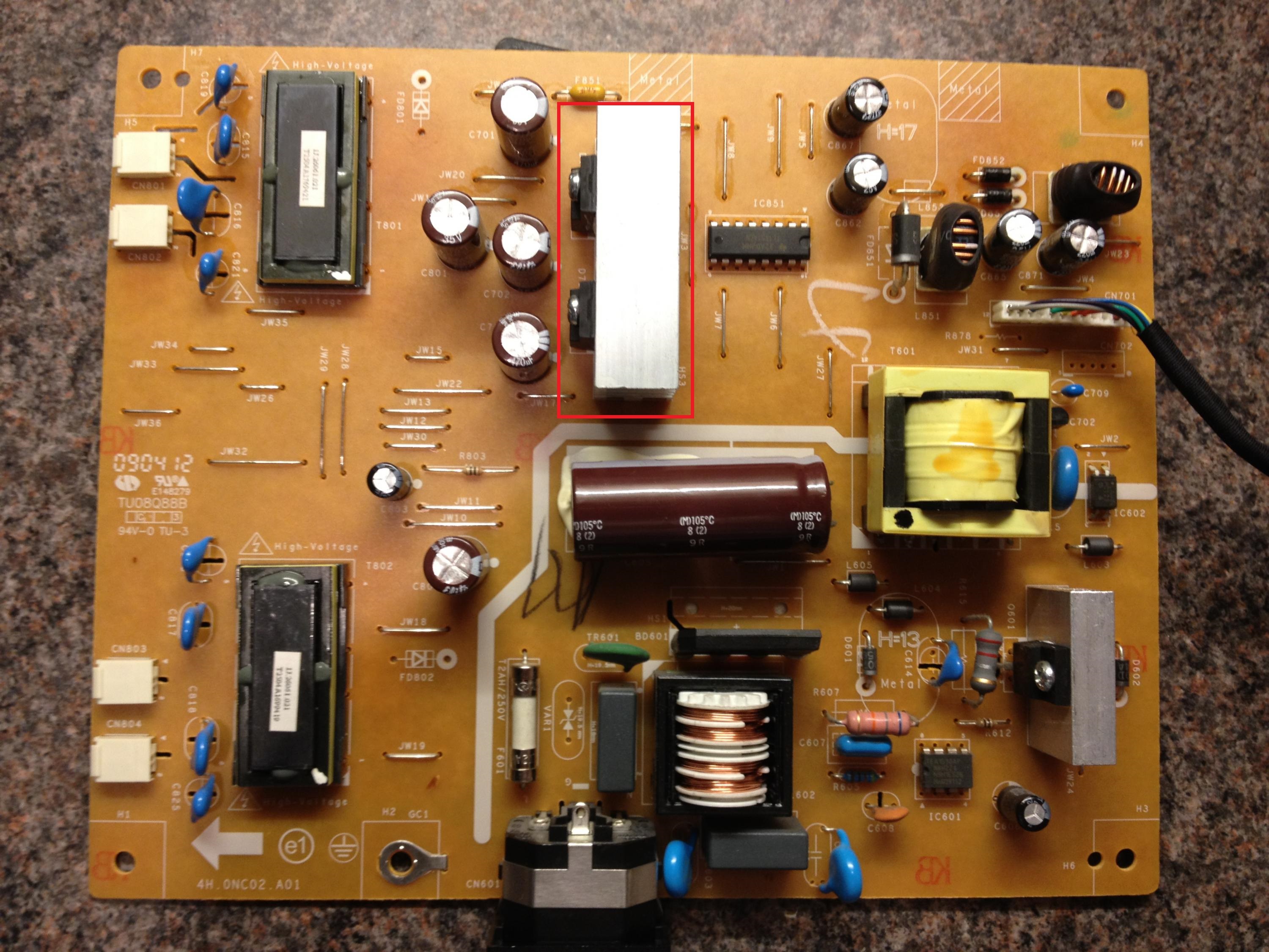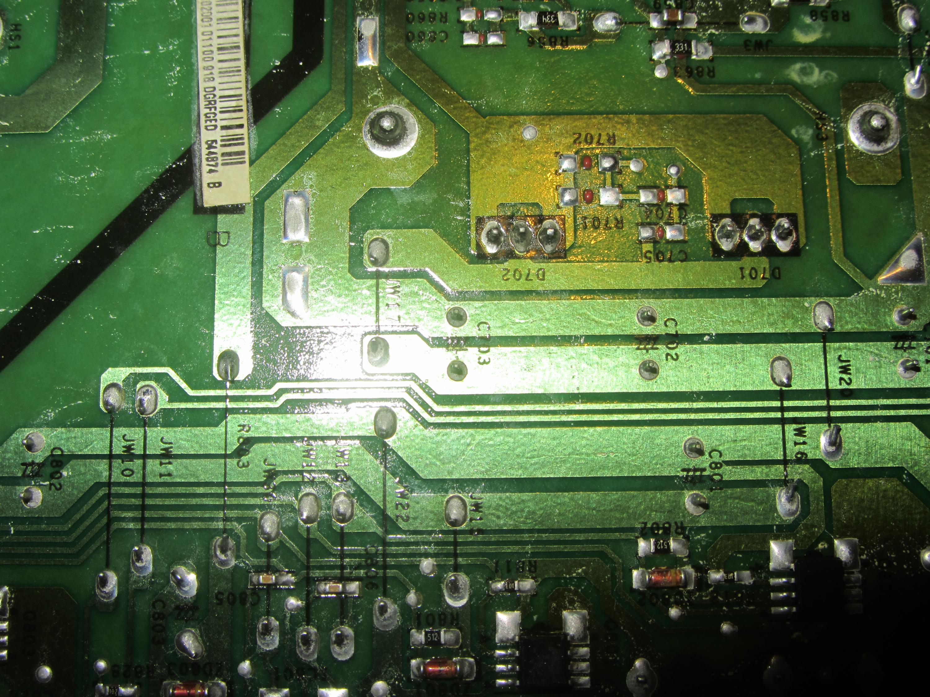 I would point attention first on the primary side solder joints then the rest, if you don't find anything cracked you could try to heat a bit the thermal resistor with solder iron then power on and see.. it is near the 220vac input connector, if nothing changes change low voltage caps. If you have desire you can first try to power up the monitor with heating and test which voltage you have on the middle pin of the 2 double diodes, since you have 1 only primary output voltage, if is a 12v then you can desolder jumper JW17 and connect an external 12v for test and see what happens.. or at least try to give power to monitor without heating and see if the main voltage on that diodes is present.Last edited by Davi.p; 01-16-2014, 01:32 PM.Comment