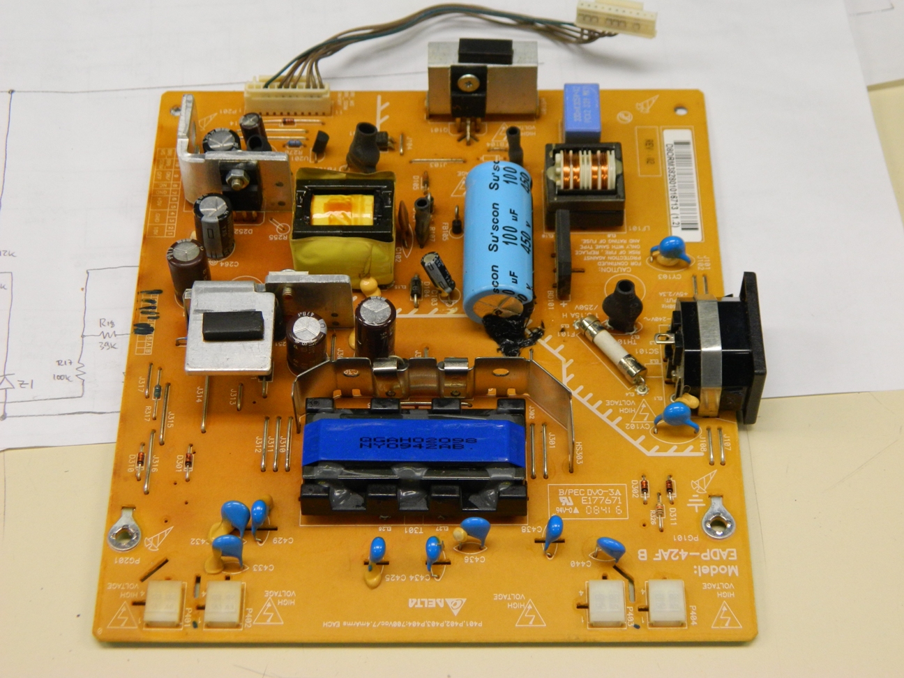On the attached pictures you can see the transformer which is a QGAH02098. The transformer has apparently two output windings, there are cables connected to all four connectors that go inside the screen.