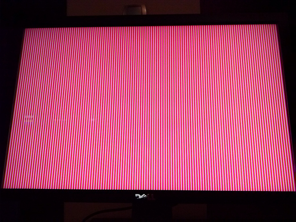 Now the monitor switches on, backlight works perfectly, button presses are registered but I see strange colored bars (vertical) which change color, flicker in high frequencies and such things though no input is connected.