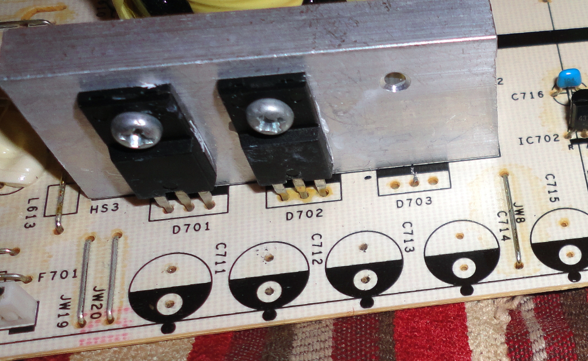 While replacing caps on the main board, I did notice a discoloration around D702 (picture); I don't know if it is significant and I don't know how to check it. Any help would be appreciated.