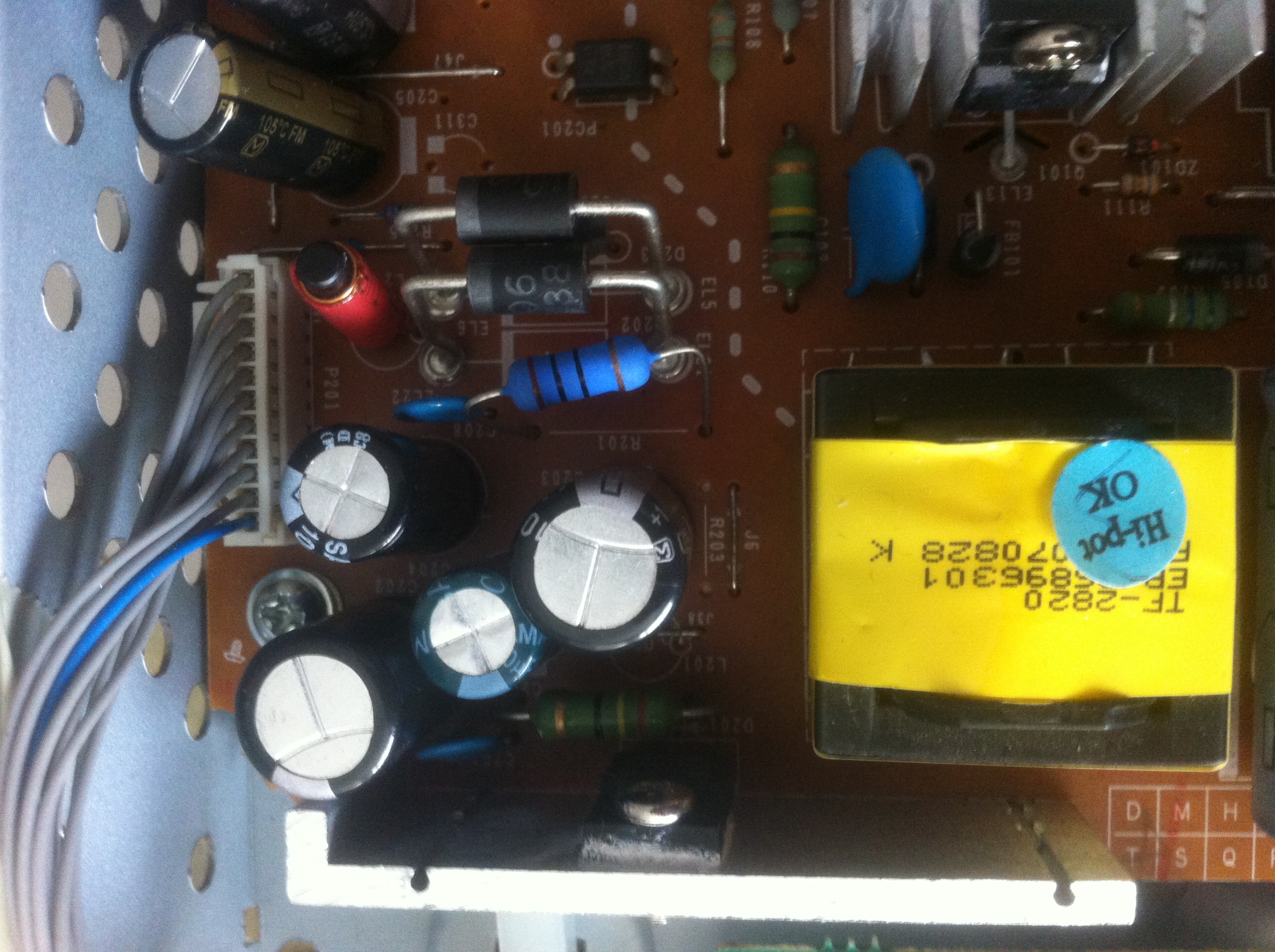 Hi I'm new on this forum. To be honest, I'm new about fixing LCD monitors. I got a deal on 5 LCDs who's got the same problems. I can see the LG logo for about 1 second and the other second I can see my computer screen. With the flashlight trick I know this is the backlight. I changed all of the capacitors except the 470uf. The problems is the same. I only touched to one because I'm a noob with soldering. I got some pics for you. English is not my first language, I'm french. I'm here to learn from the best. I have a multimeter. Here's the pictures. The backlight does make a sound when I power on my monitor and a smell too. The monitor power is still on but the backlight flash two times before shut off.