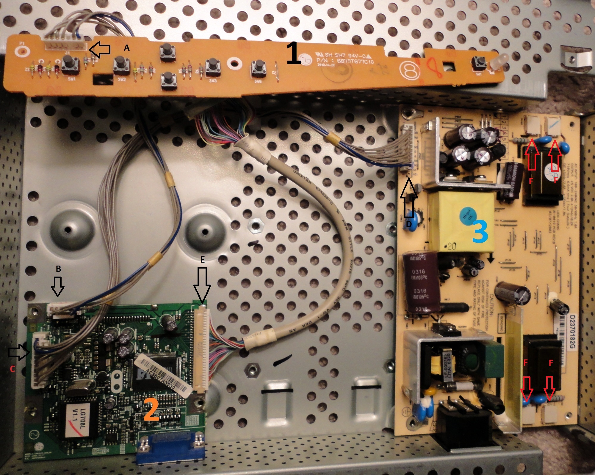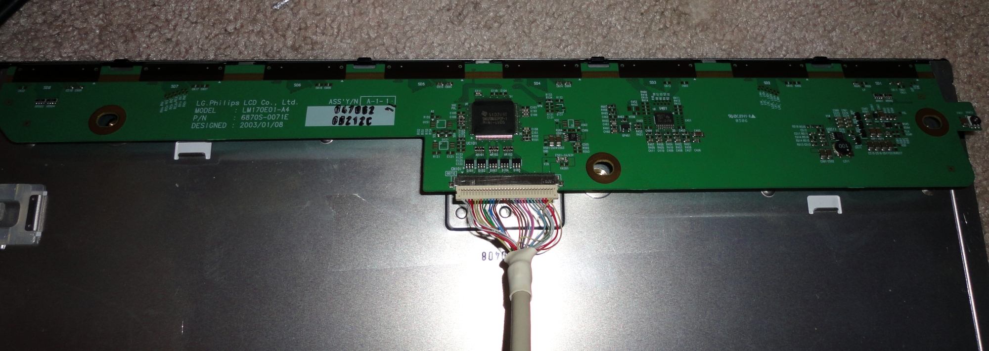 Logic (or main) board then sends processed signal thru connection E to the LCD panel