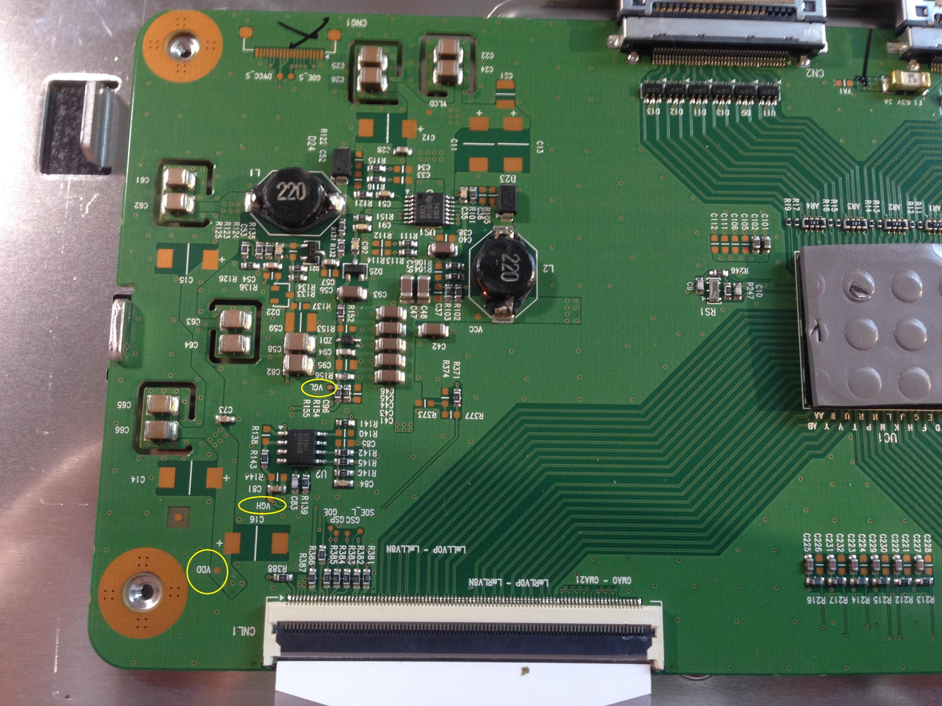 Here are pictures of the T-CON. I think you can read all the labels. I've circled in yellow (first pic, lower left) where I measured VGH and VGL.