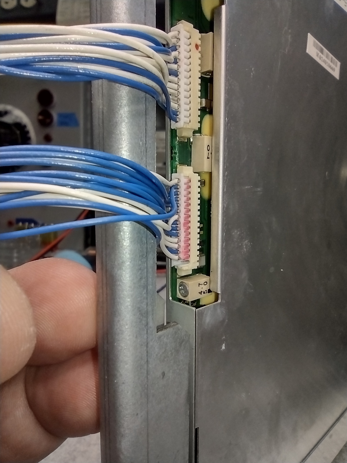 I have an Siemens HMI with vertical lines on half of the screen. These lines aren't scrambled garbage but rather very regular in pattern and color. I have replaced the LCD with a new one and still the problem persists. I'm wondering if this isn't indicative of a bad video process chip or video memory? Any help would be appreciated. The cable appears to be OK but one pin on the header is unpopulated, though there isn't any loose wire to suggest one broke off or popped out of the connector. In the picture below where the connector is busted out of the side, I did that with my small screw driver while trying to push the connector into the header on the new screen, there was no wire populating that position previously. Each connector has 14 Wires but one header has 15 positions while the other has 14 positions. As stated I have replaced the LCD with a new one of the same part number and still have the video issue. Wiggling or moving the wires doesn't effect the image at all, no change whatsoever. Kind of looks like an interference pattern to me but I'm no expert on displays.