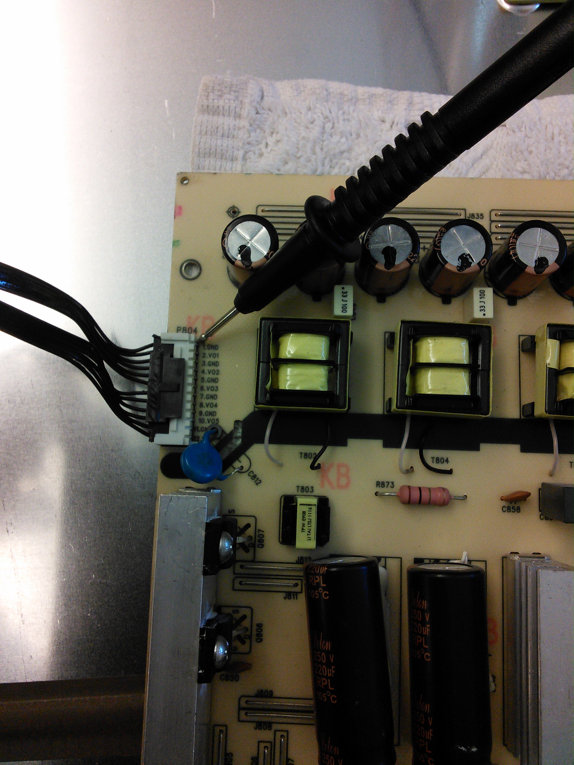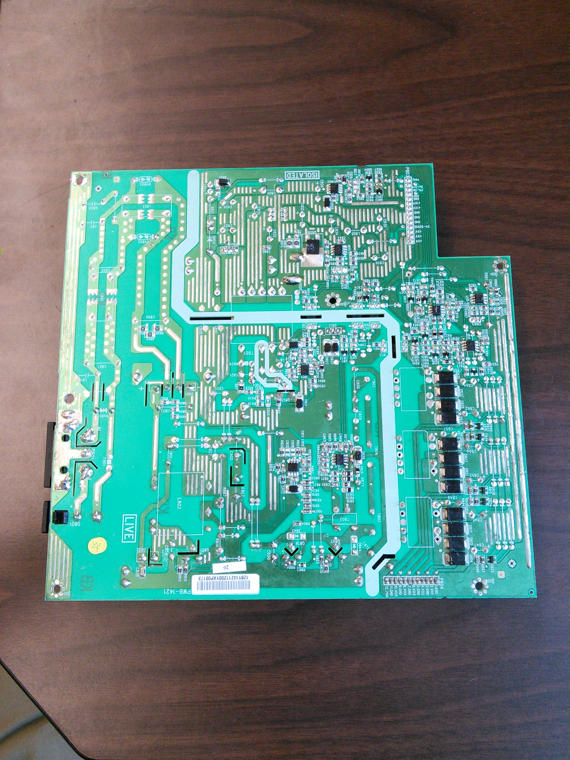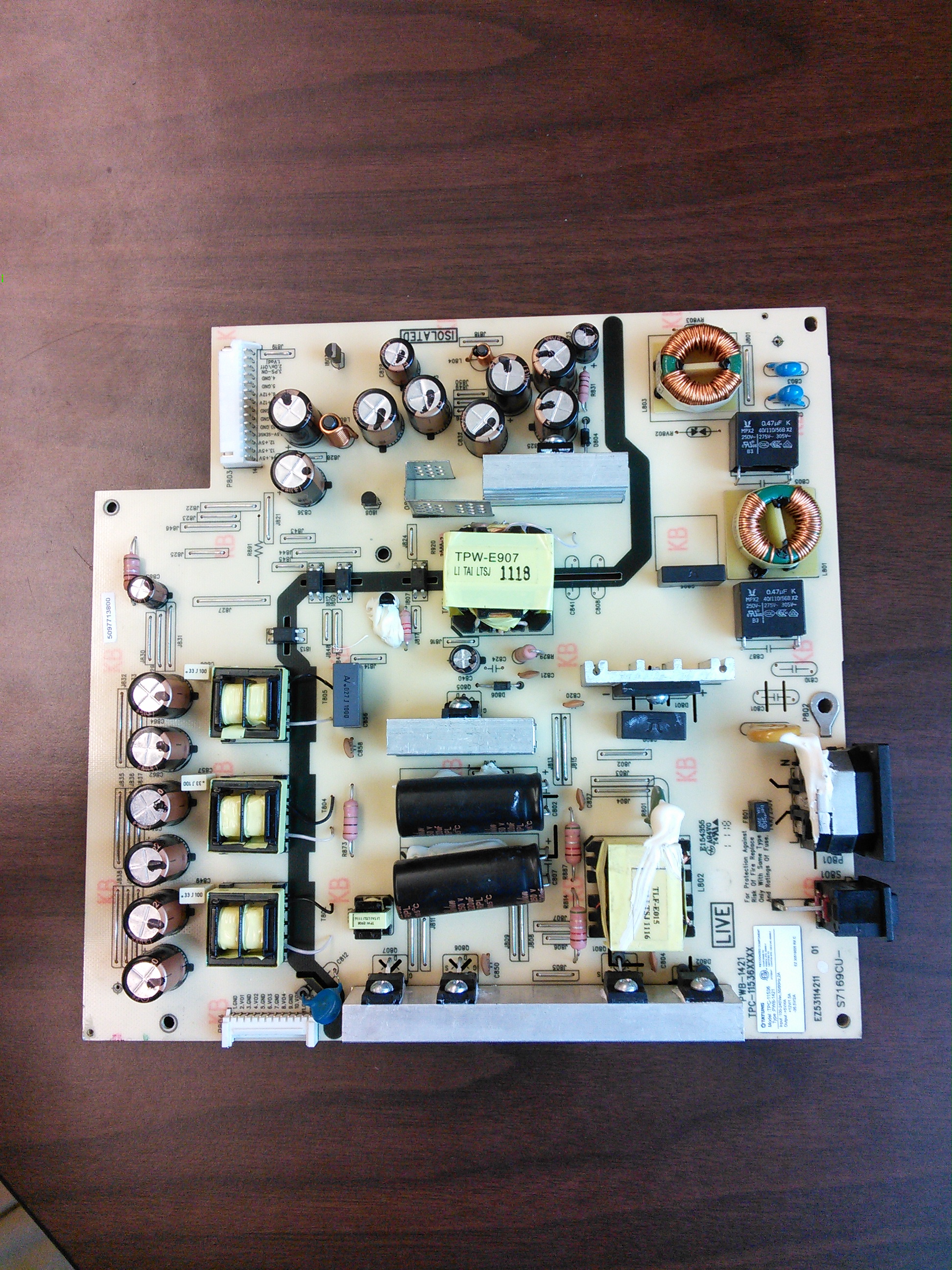 I have pulled out the power board and have inspected the board carefully (admittedly I am only capable of looking for obvious goo, bloating, etc.) and I see no sign of any bad capacitors, anything blown or soldered improperly. The only thing that I noticed was that there was some residue the seemed to be a spill of some kind of orangey/brown colored liquid that extended across the length of the board - I cleaned off with alcohol and have put the board back in and there was no change to the fault.