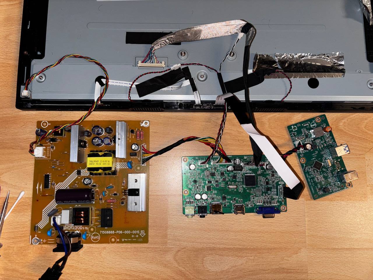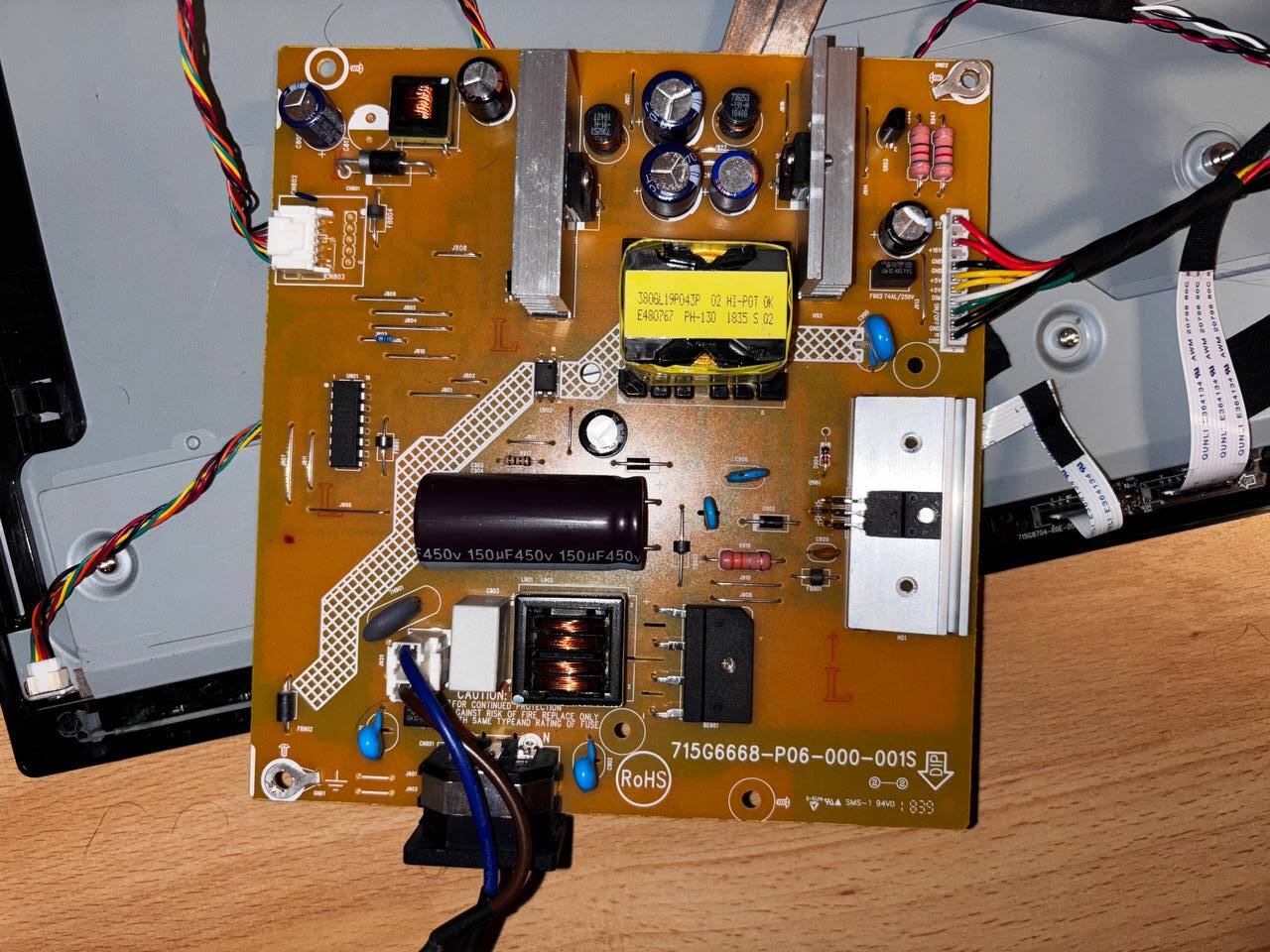 The small connector on the left of the PSU has two cables with 18V and all the other have 0.2V. It connects on this small connector on the left ontop of the panel. I guess the backlight? Seens fine I guess.