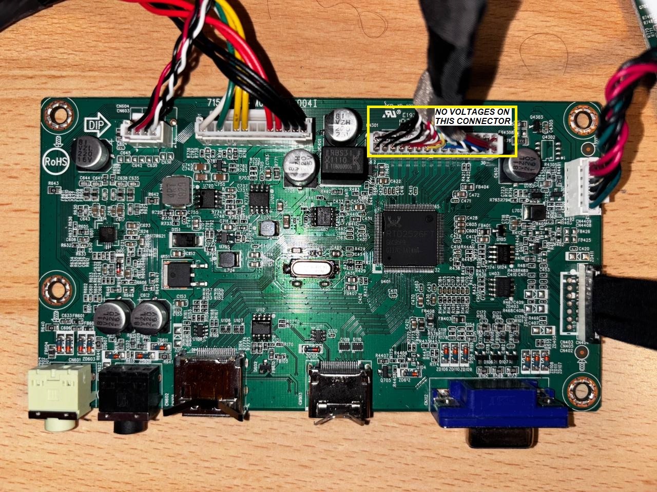 The voltages that go from the big chip to the connector of the panel, there are no voltages. It is a RTD2526FT chip.