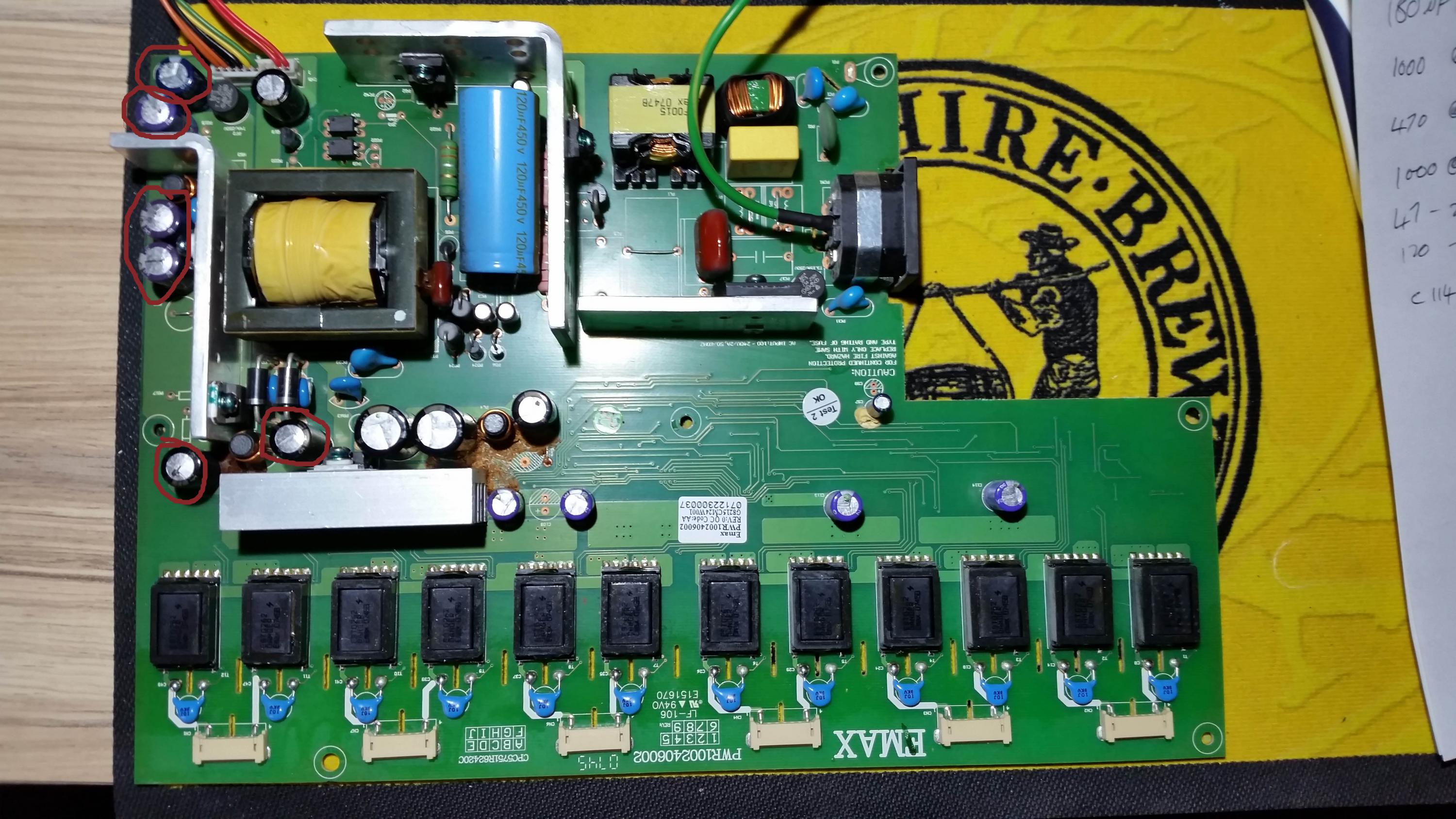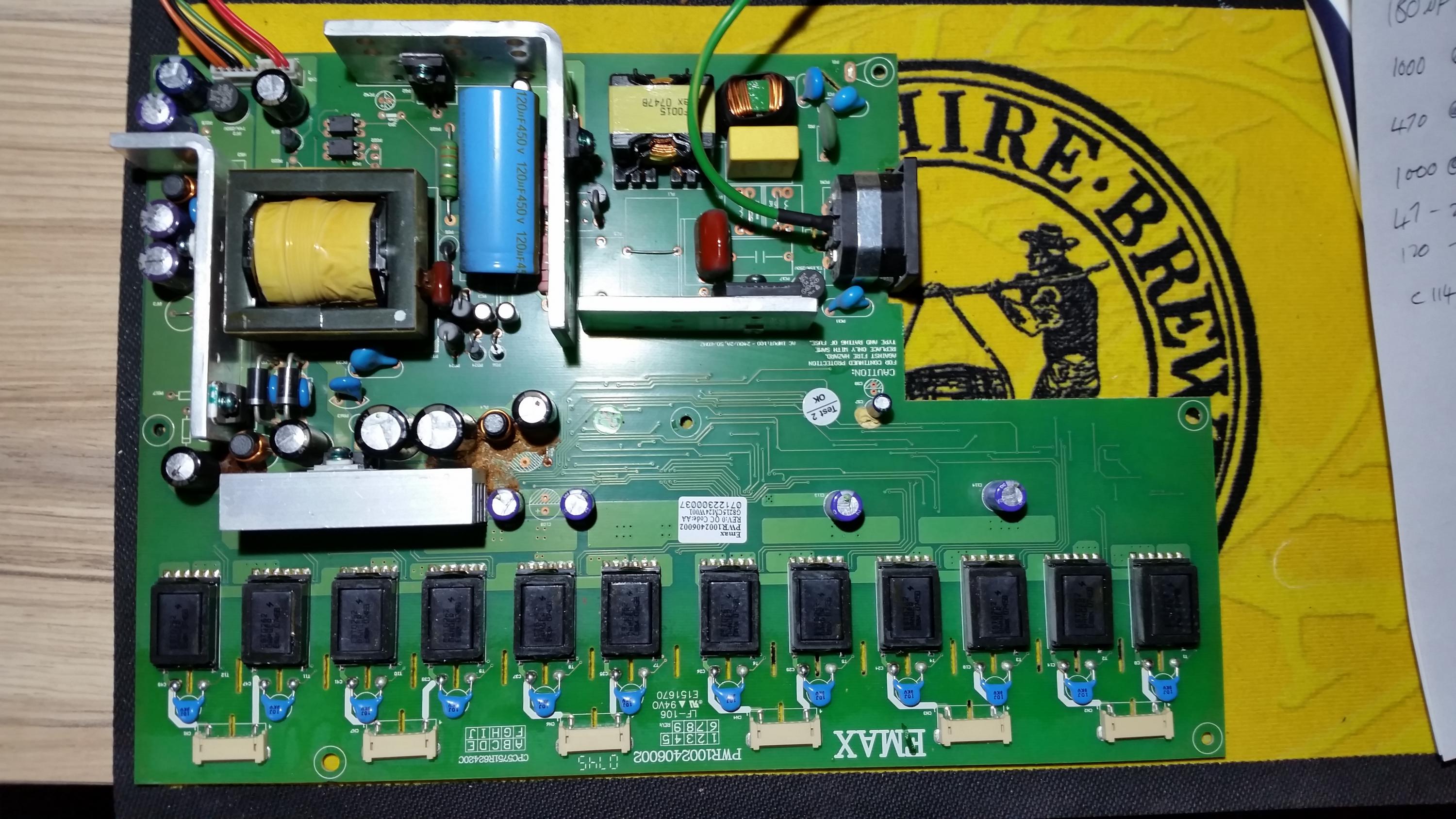 Strangely the 450v 120Uf cap was loose although still soldered so I replaced it with one from a dead Samsung power board.
