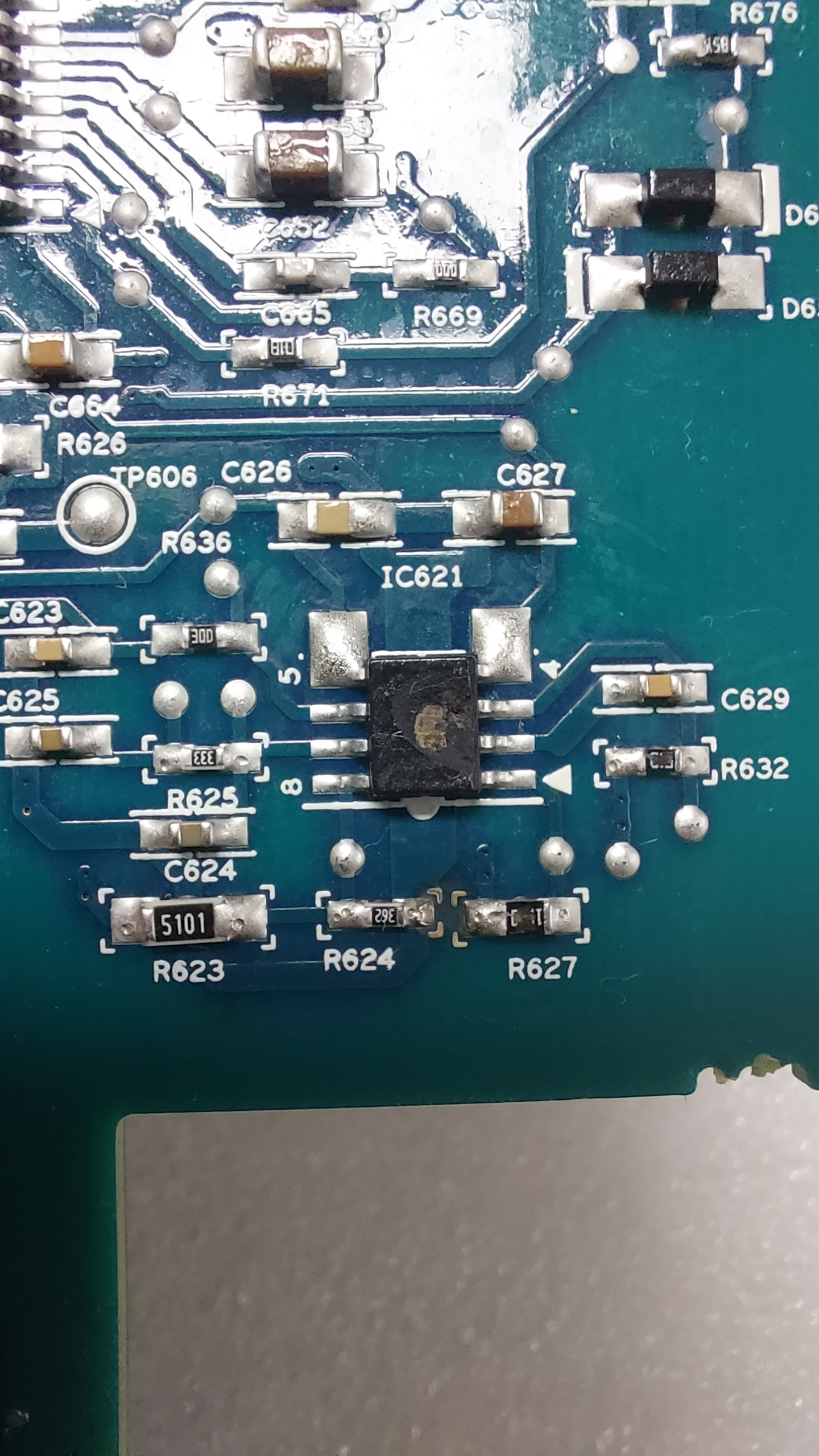 The faulty components are resistors R631, R641, R627, R632 and chip IC621.