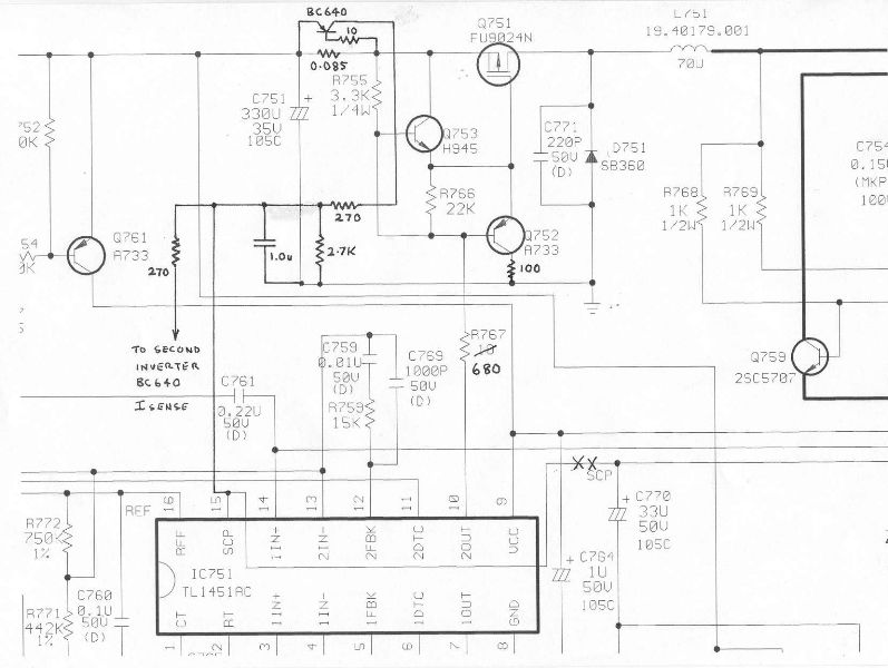 Inspection of the circuit shows that there is no current control through transistors Q753 & Q752. They are directly connected between the +15 volt rail and ground there is nothing to limit the current between the supply rails (only the ill defined current gain of Q753). With Q752 saturated ON drive to Q753 is about 4 mA, a current gain of 50 makes about 200mA Ic (gain of 100 = 400mA) and the voltage across this transistor is about 13 volts (between 260 and 520mW x duty cycle).