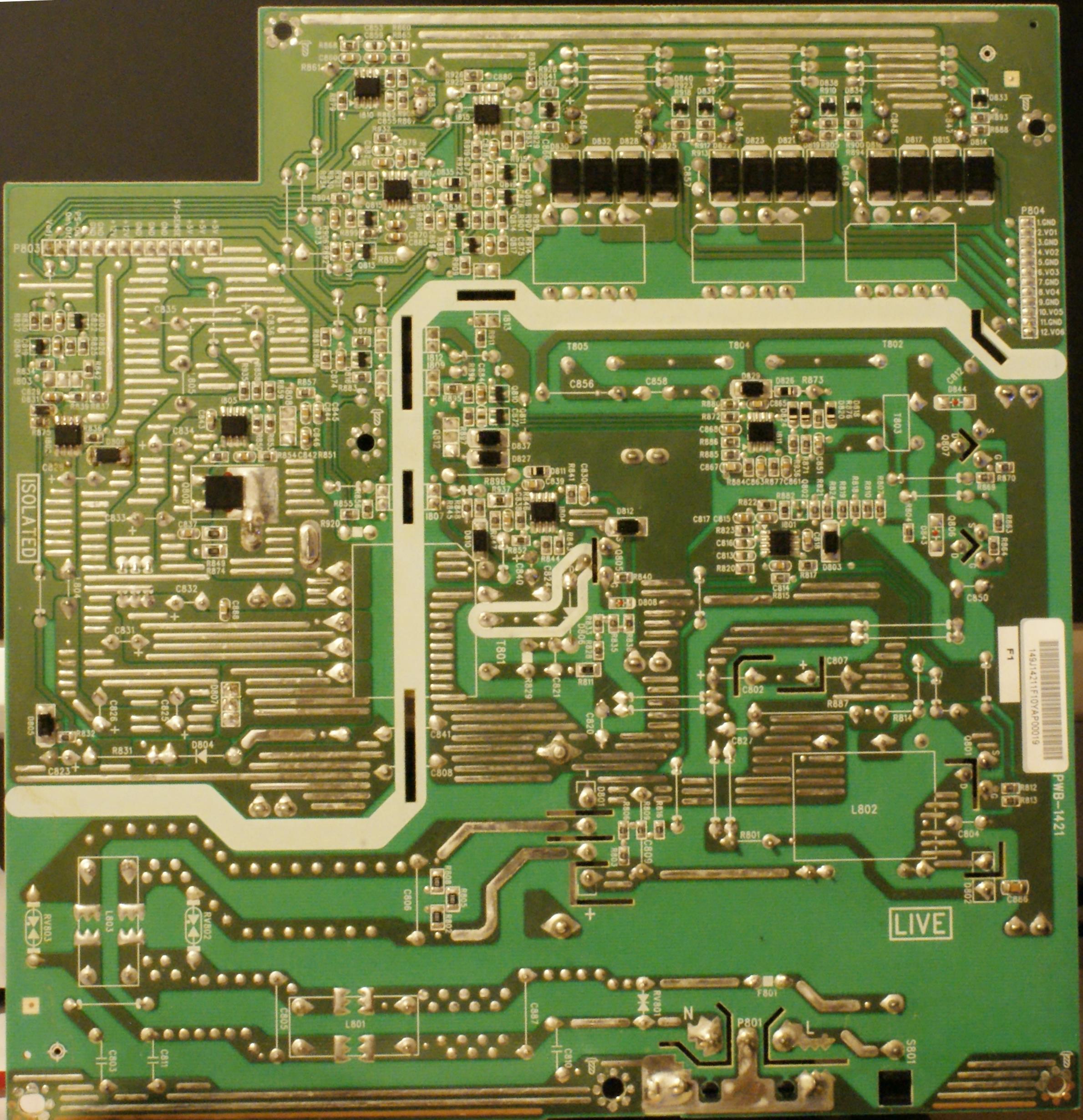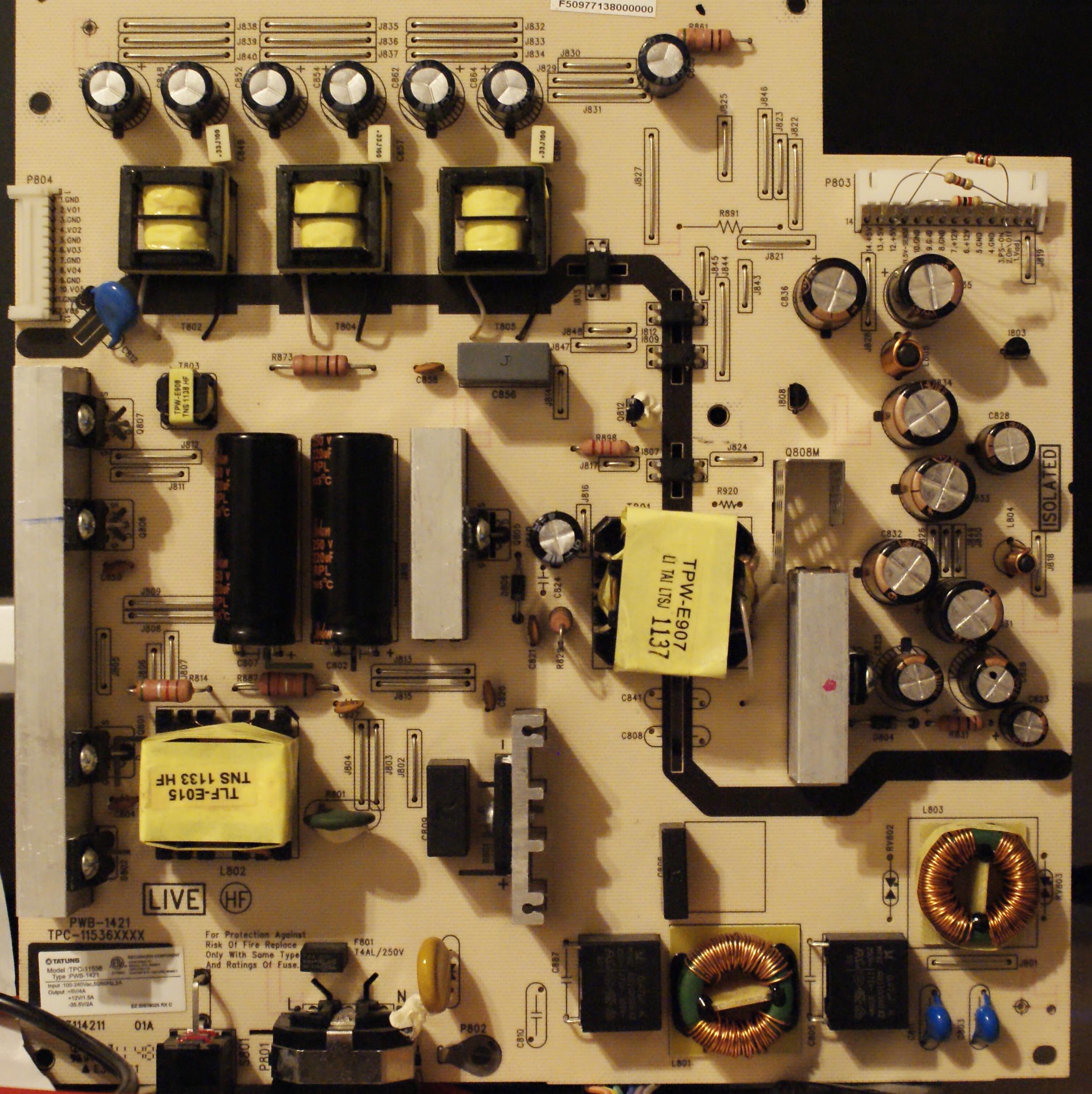 - to diagnose if the LED strips are faulty easily, insert a piece of solid core wire as an extension to your multimeter in order to check the voltages on the connector feeding the LED strip. This can be done without disassembling the chassis at all. If any one of these rises much above 30V then there is an open circuit. Mine went to about 60V. Proceed to repair the panel.