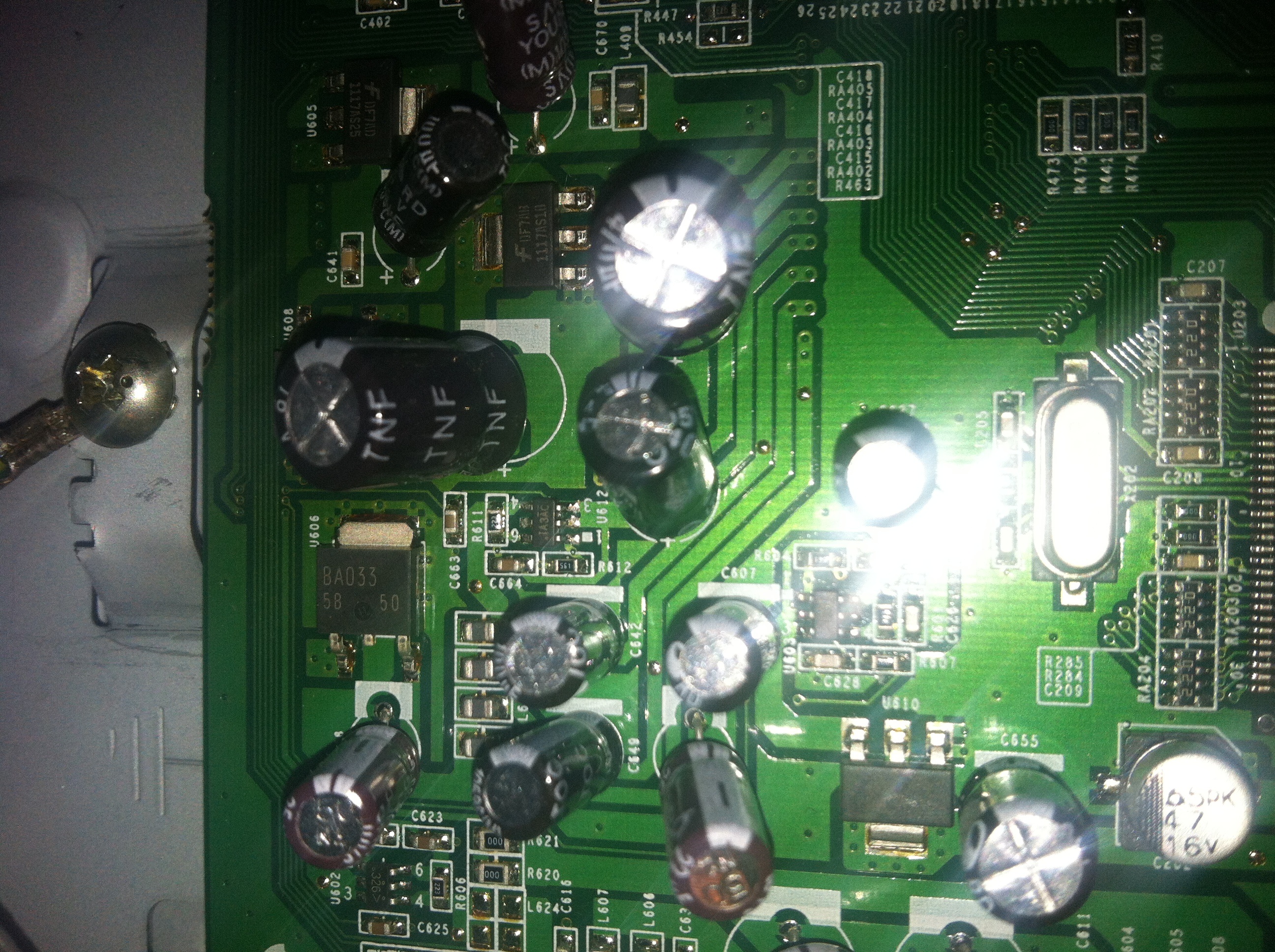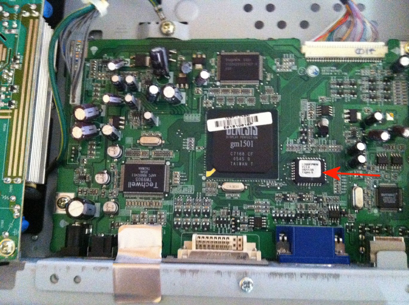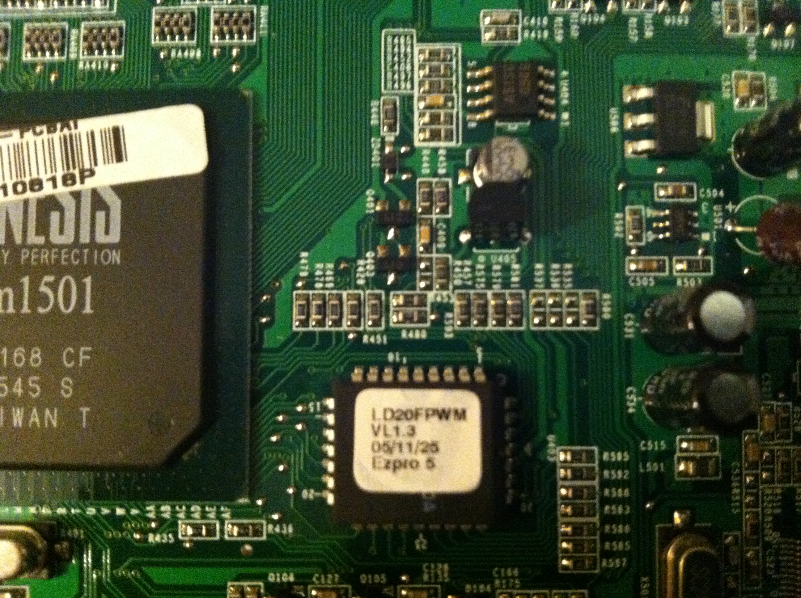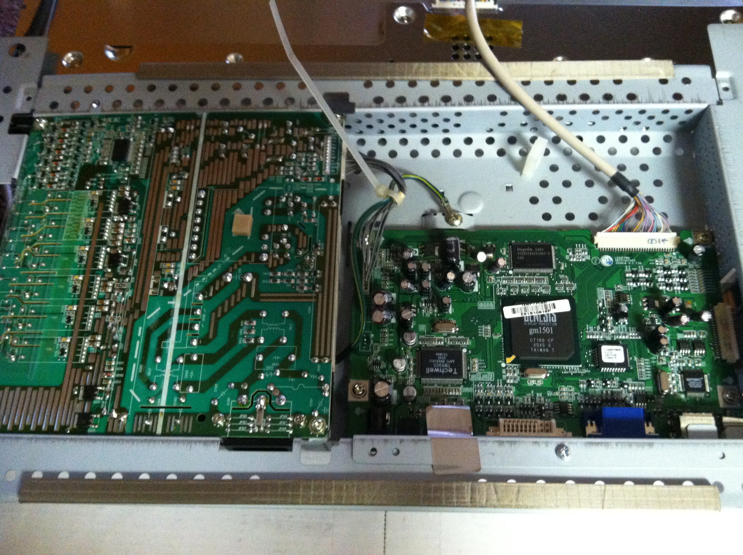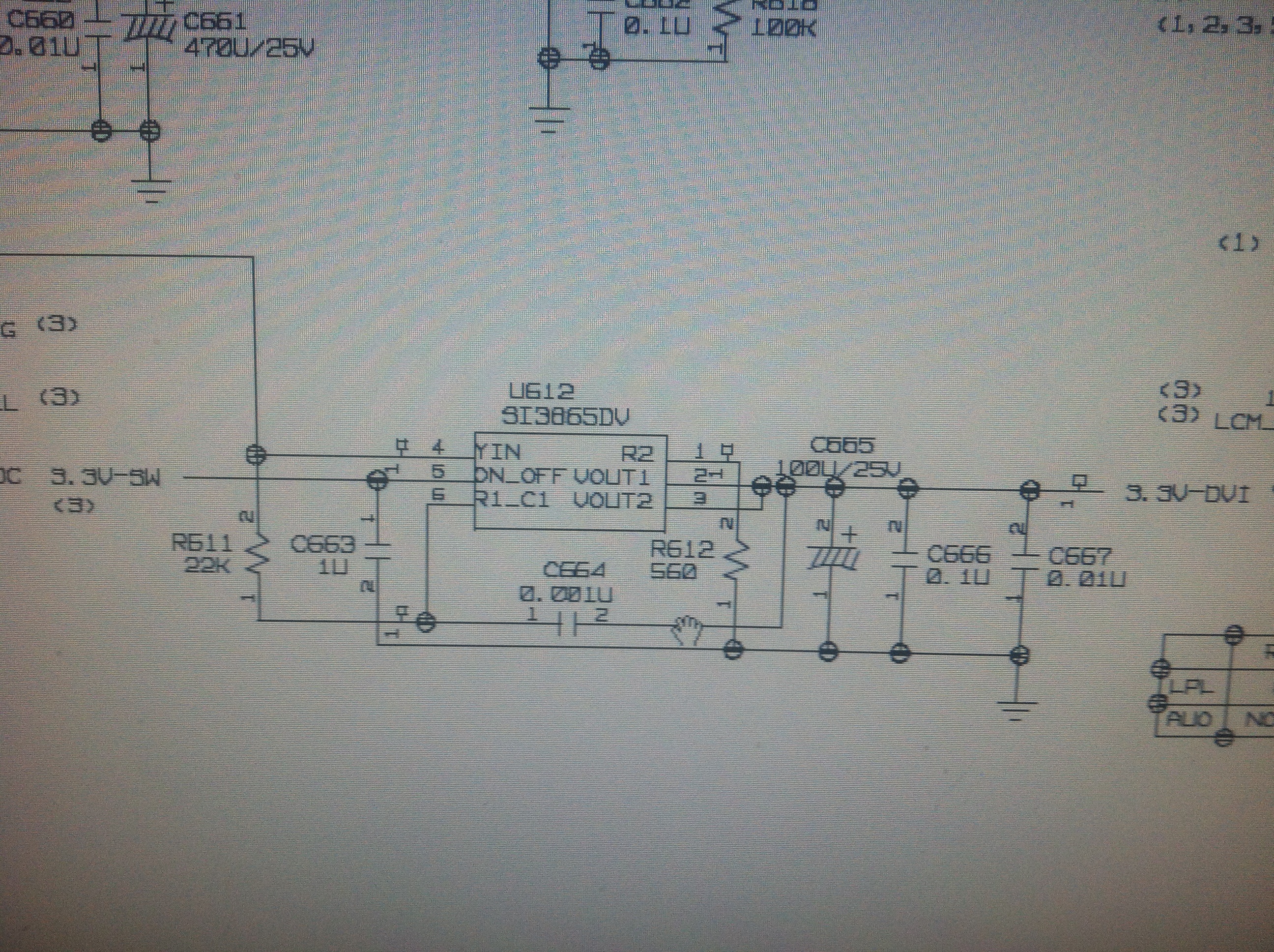 The monitor when first turned it on, the power lamp and the number 2 flashes on and off. Opened it up and unhooked the four cables going to the inverter, plugged it in and they didn't flash any more and I had all the voltages, 5 on the pins, 12 on the pins and 3.3 on pin 10. Connected the inverter plugs and they flash again. Monitor back light flashes on and off with the 2 lamps.Disconnected the cables again and how the 2 lamps are flashing. Reading across the caps in front of the inverters, I get between 5.7 and 5.8 M.