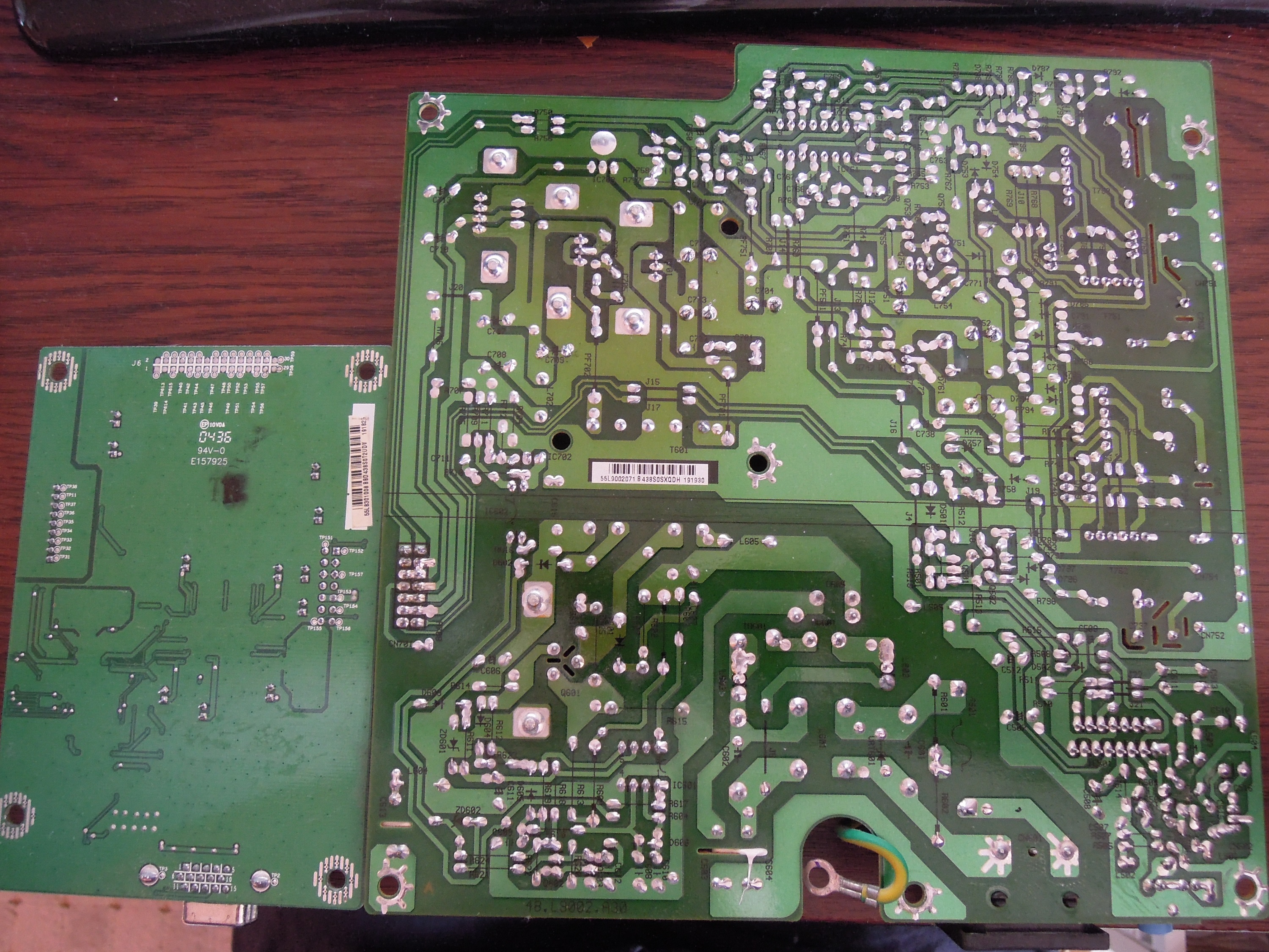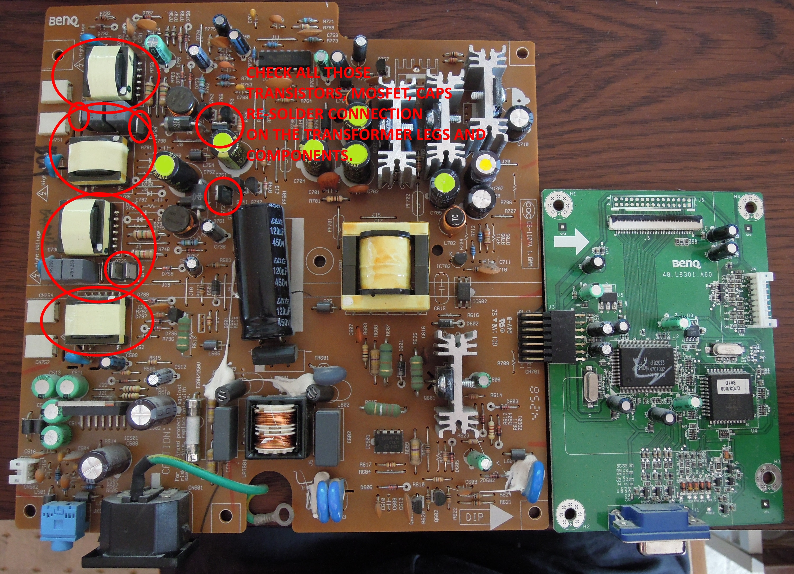 I disassebled the LCD and found five 470uF and one 1000uF capacitors visually bad so i bought replacements and replaced them. But it didn't help at all. Could you please point me out where to look next? The board is quite complicated for me. Here is the photo: