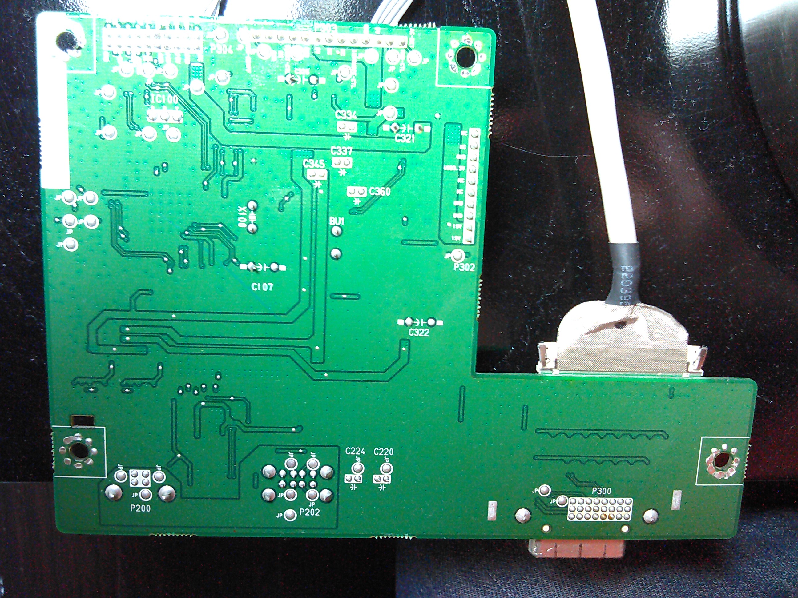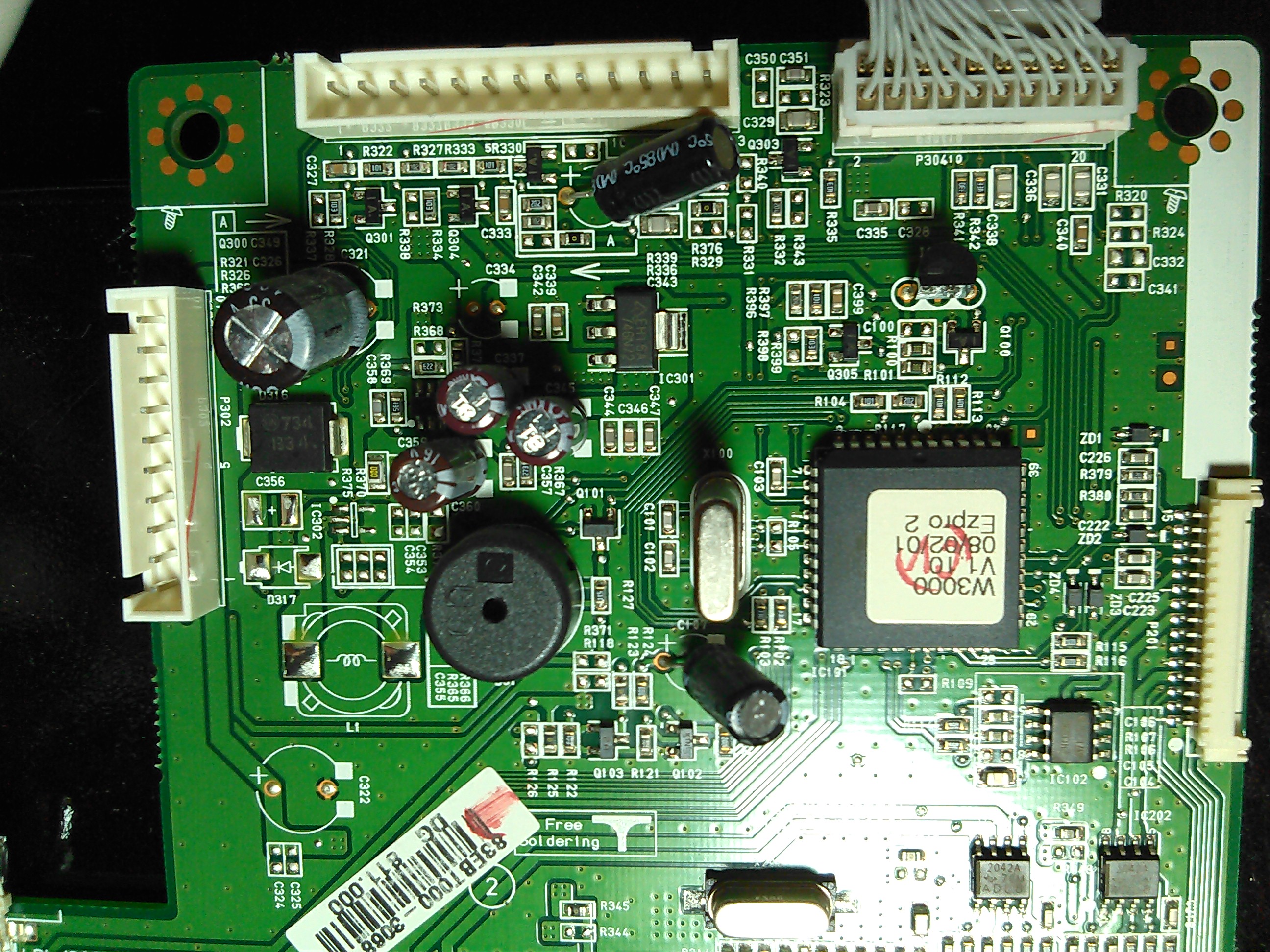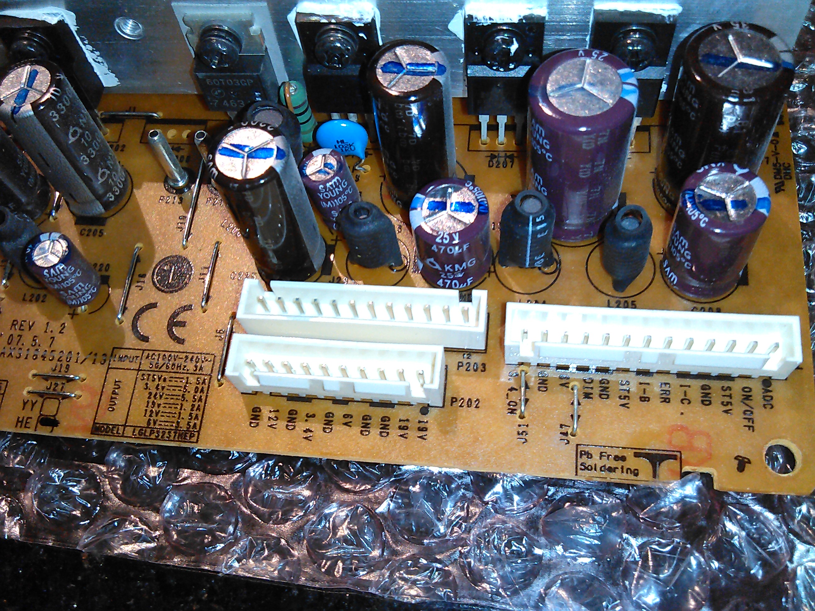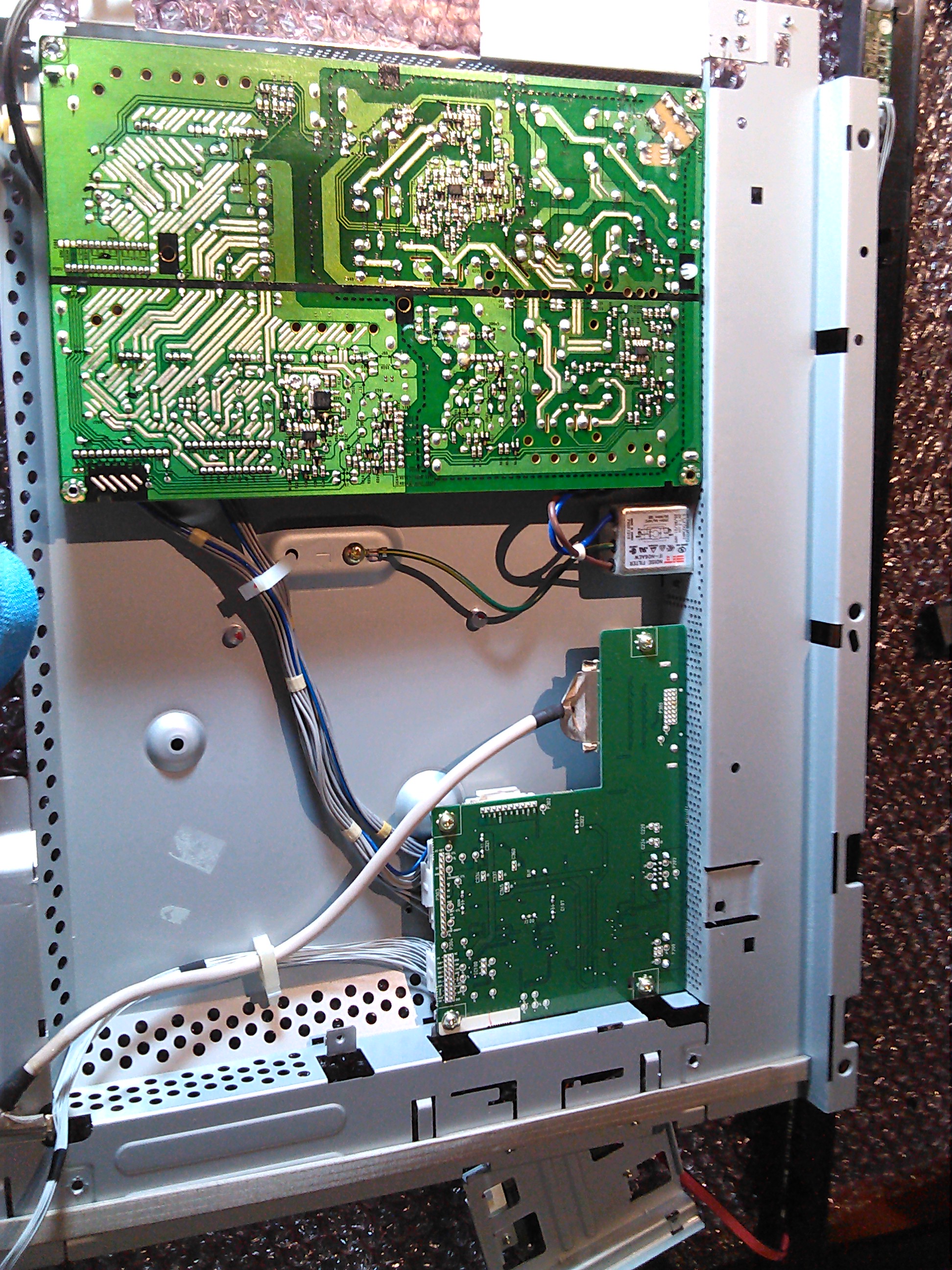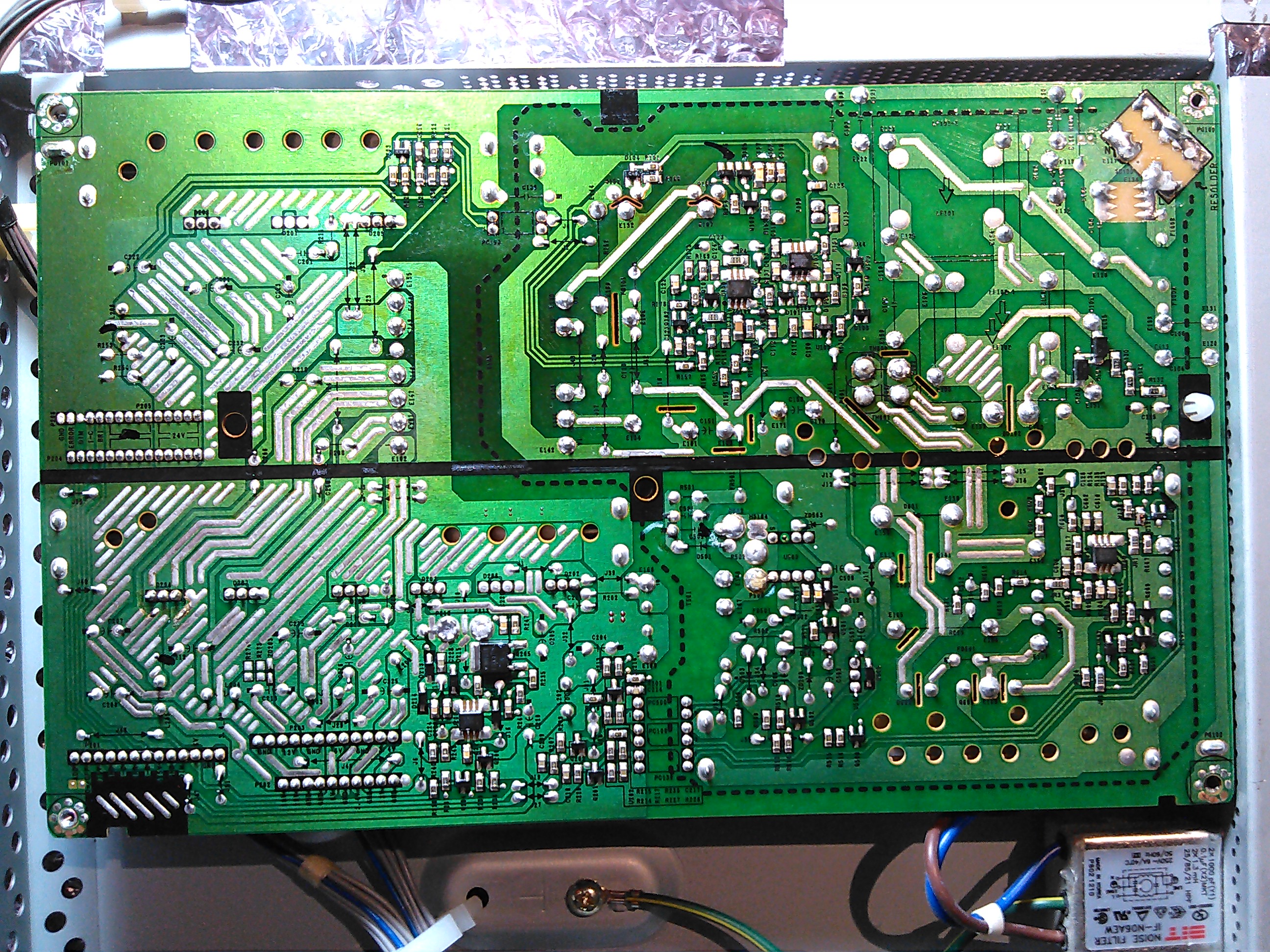 I've opened up the unit and started testing the power supply. Visual inspection reveals nothing (caps look fine). With PS disconnected from all other boards, I only get 5V on the standby 5V and "ADC", a few mV on 6V and 12V outputs, and 0V on everything else. I noted that the standby 5V seems to oscillate, but only between 5.0 and 5.2V. With the board that has the video input connectors on it (what's that called?) plugged in, and the power/menu buttons plugged into that board so I could turn it on, I get: